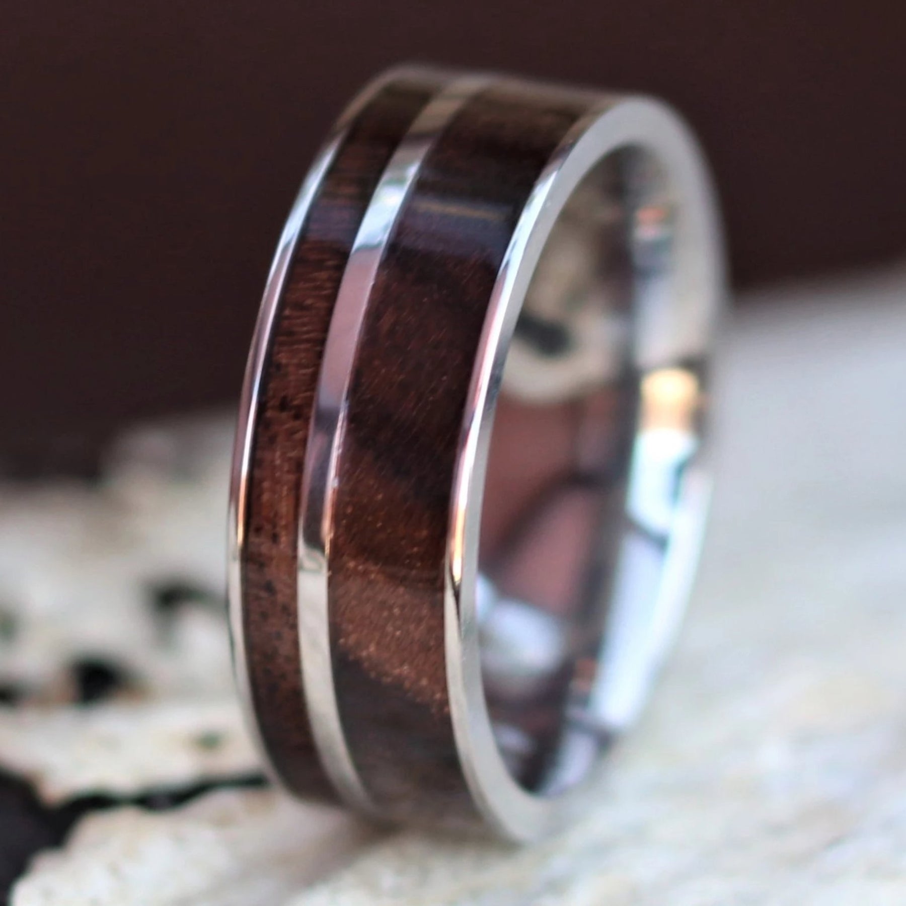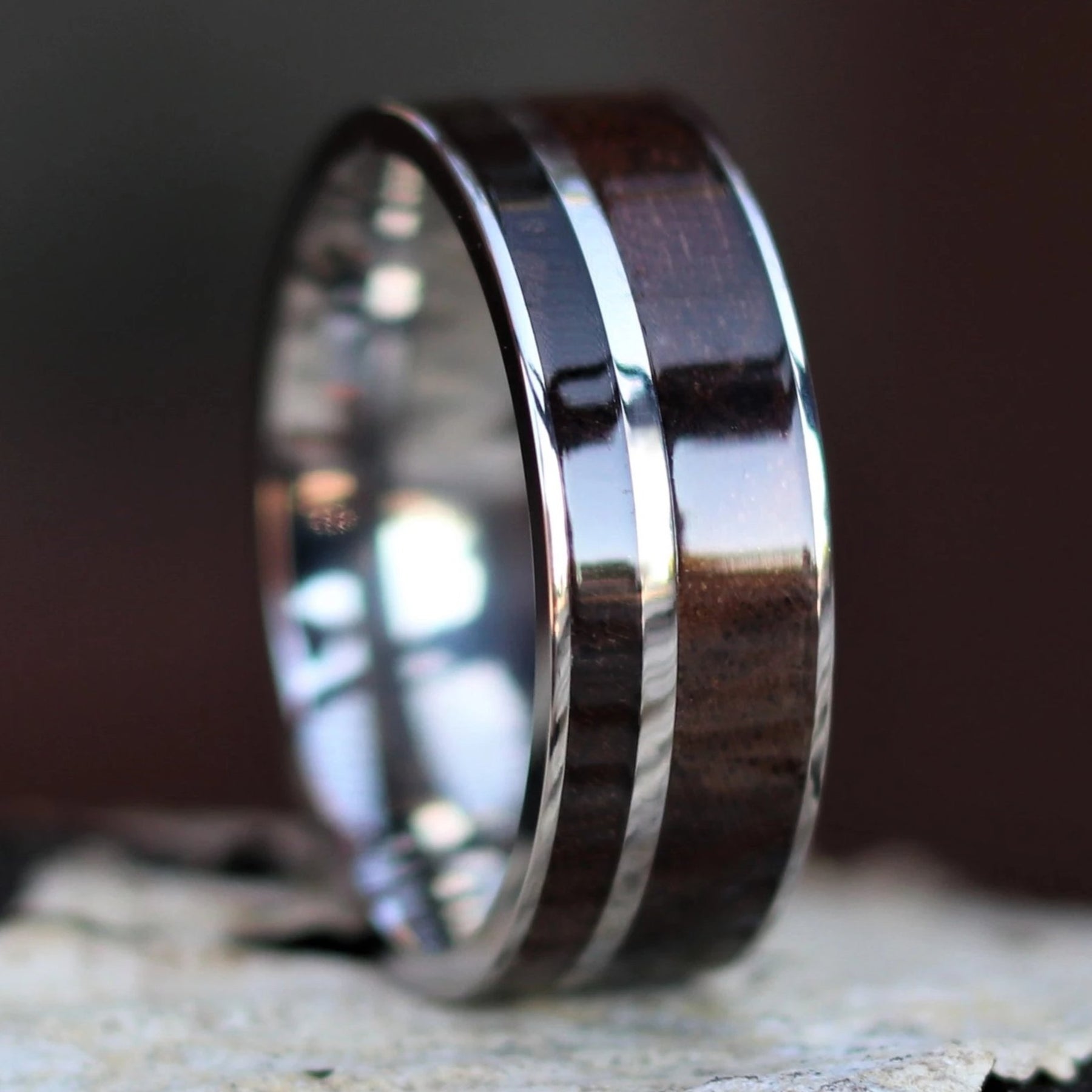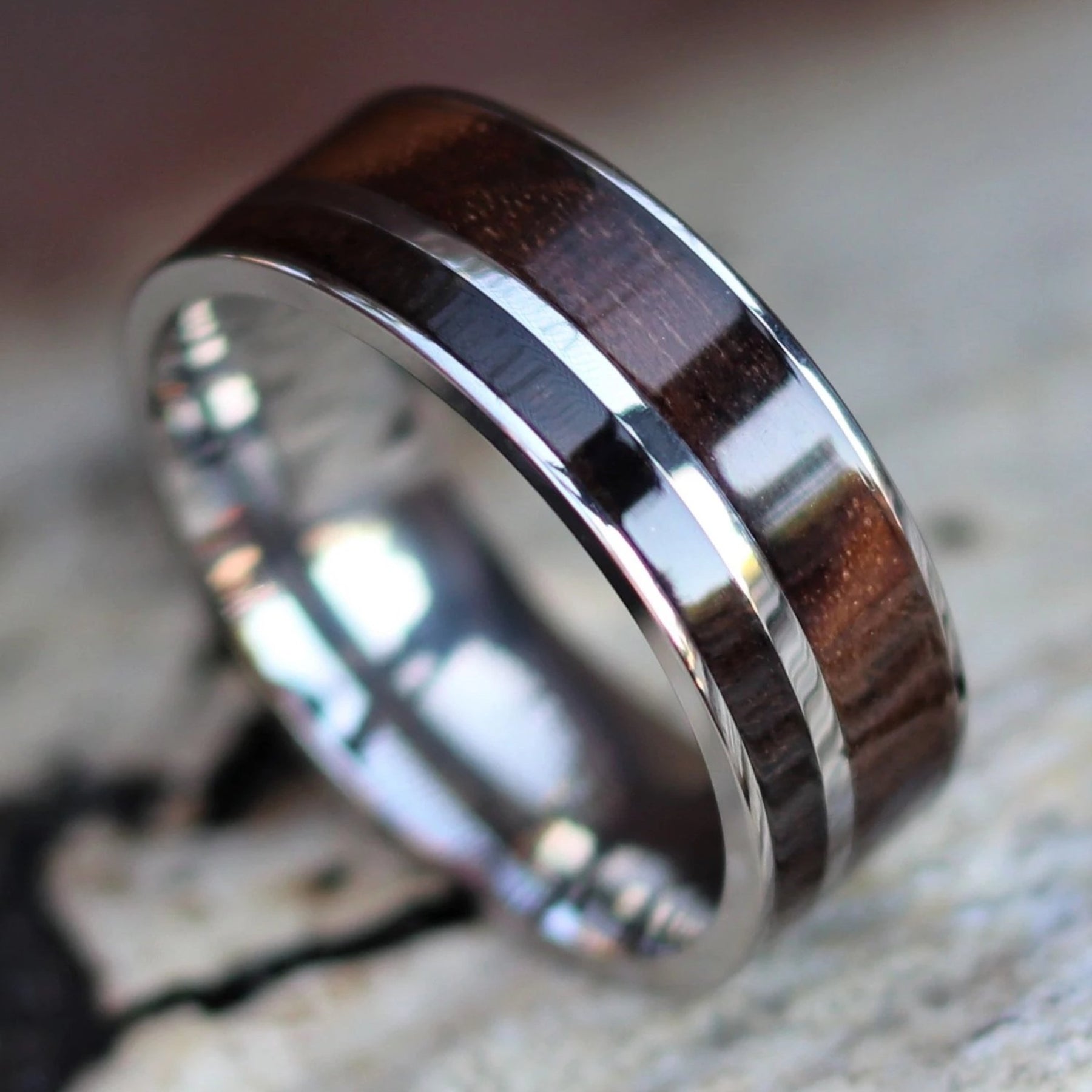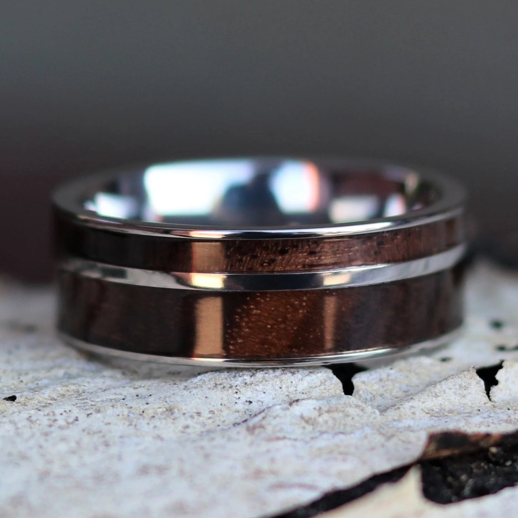 We make each ring using the "bentwood" method; the wood is steamed, and bent so its grain flows around the circumference of the ring. This makes for a very durable ring. All titanium rings with inlays are sealed with Titanium Aircraft Adhesive, and each ring is sealed in lustrous water resistant finish. Finally the rings are polished with beeswax. We exclusively use jewelers grade 5 6AL-4V titanium in every ring.