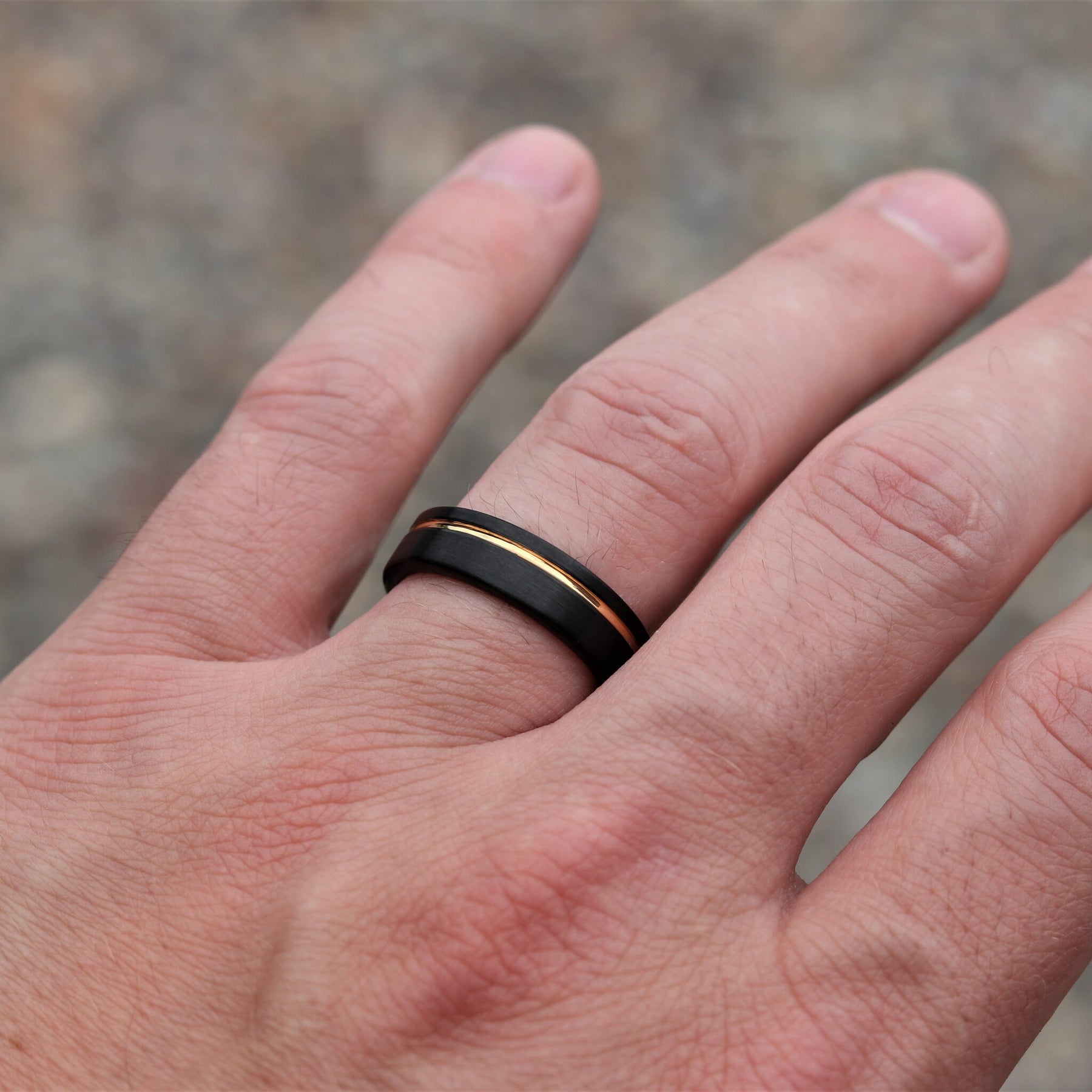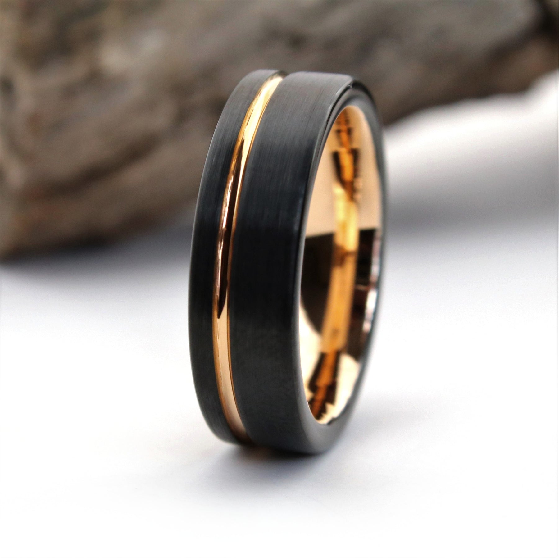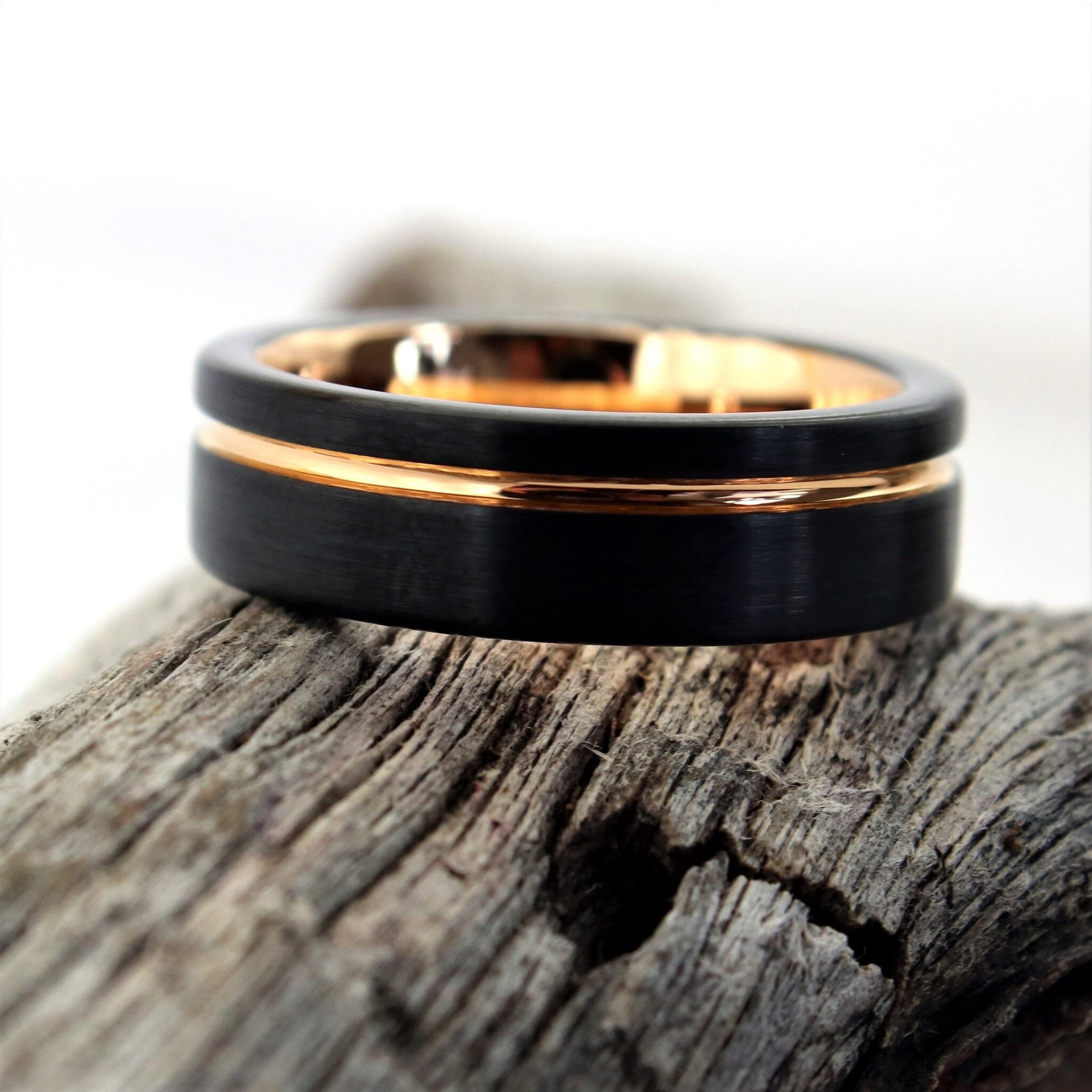 This black rose gold ring features polished anodized Titanium and black Tungsten Carbide inlays. This design is perfect as an engagement ring, a wedding ring, or for any occasion.