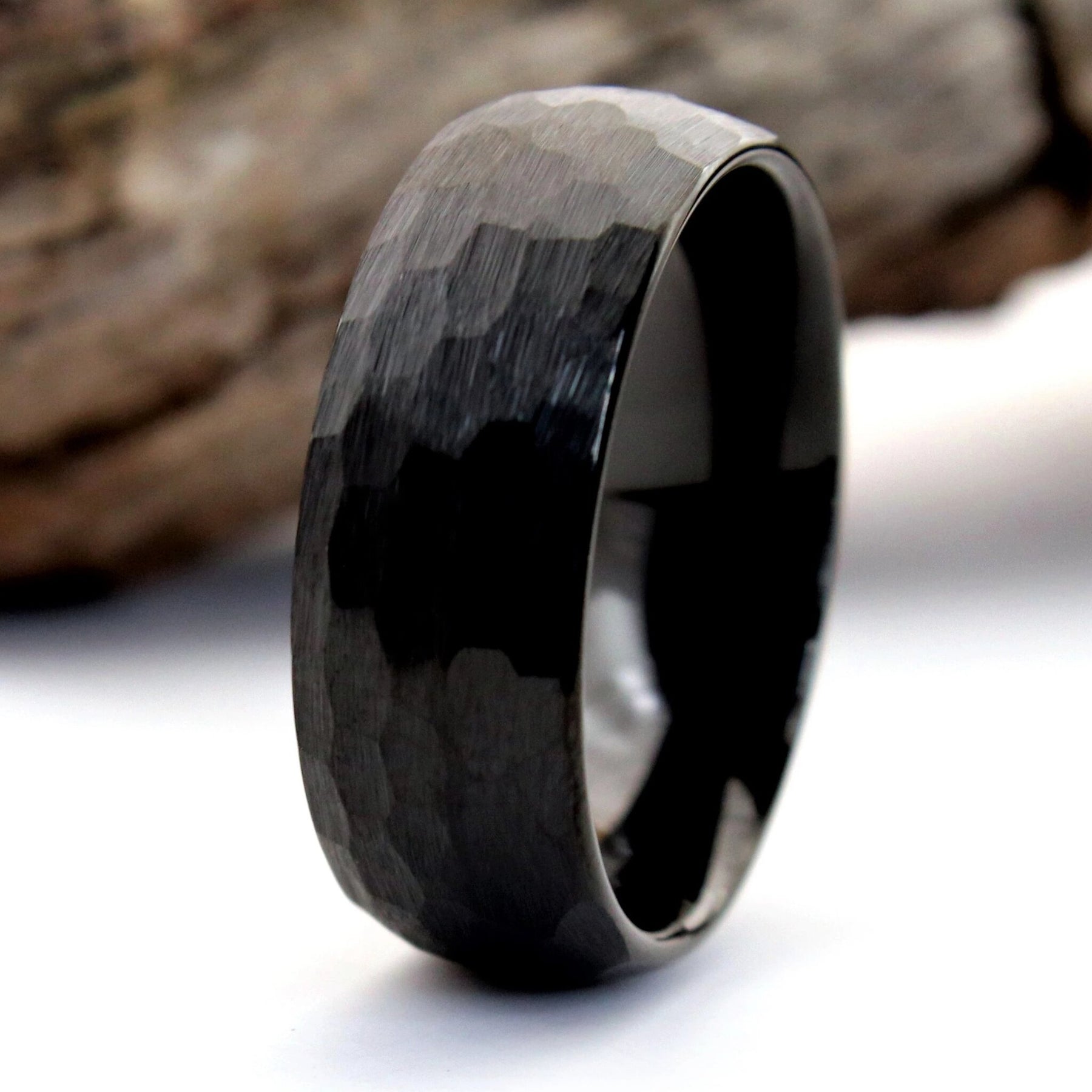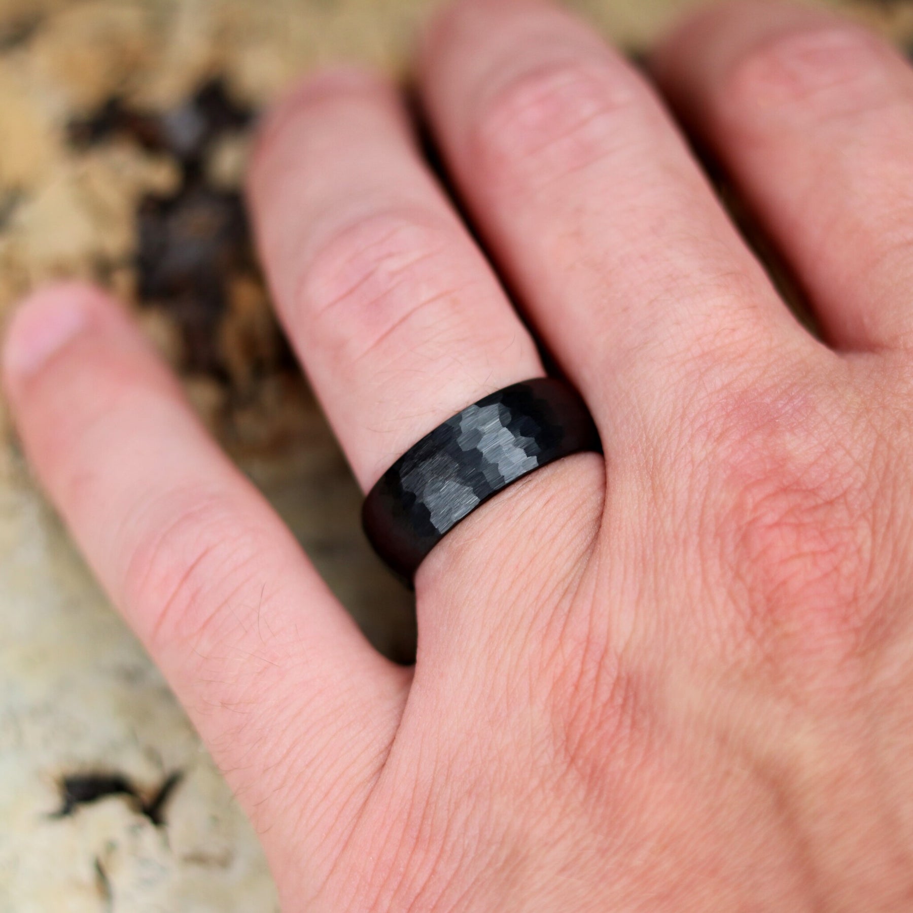 This black wedding ring features a rustic hammered exterior, and a polished interior. It's unique, hardy, and will fit with even the most extreme lifestyles.