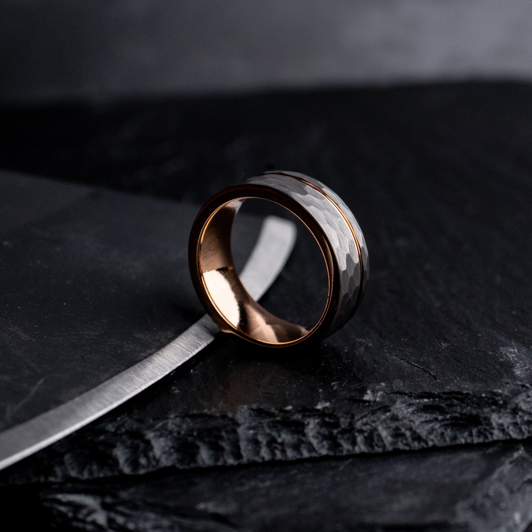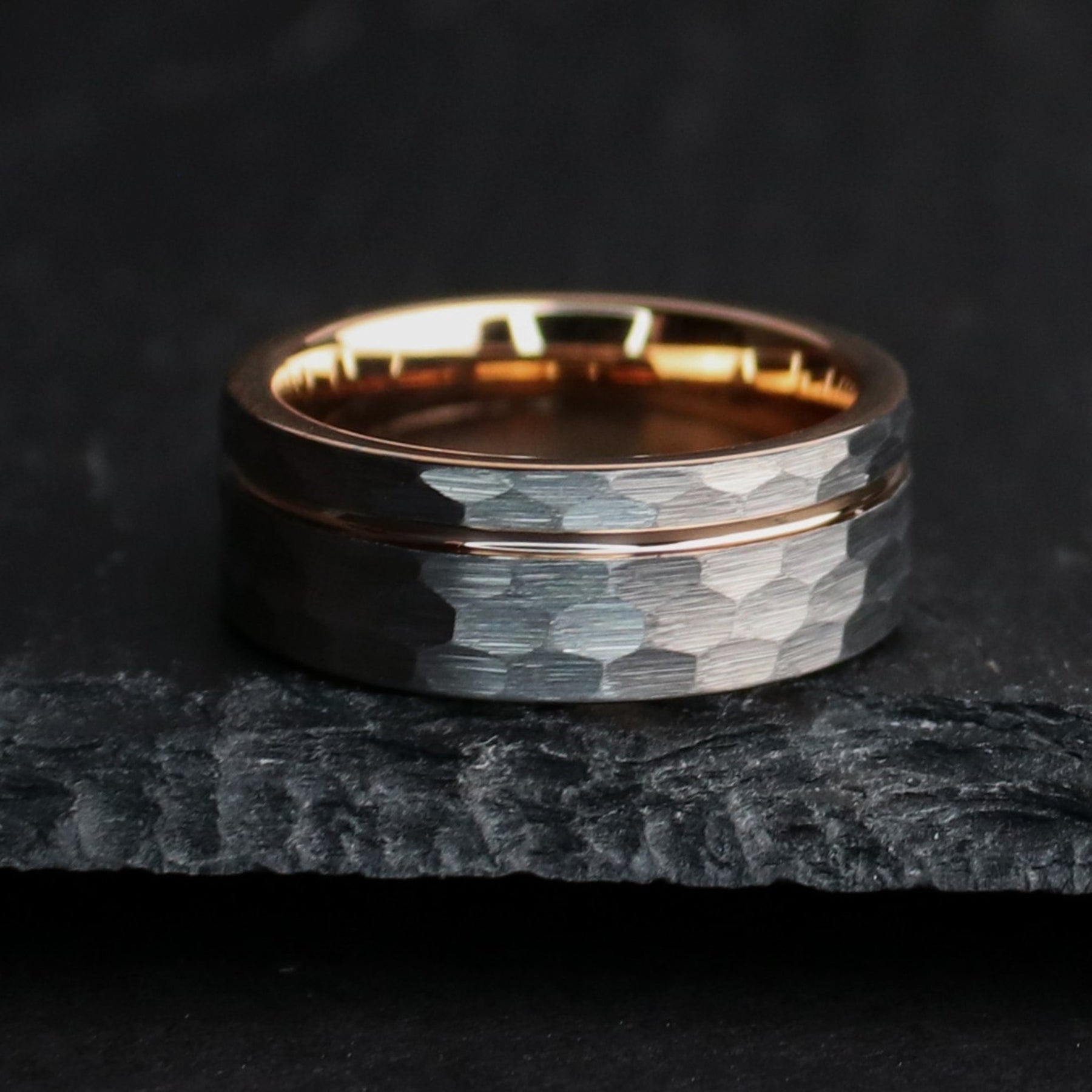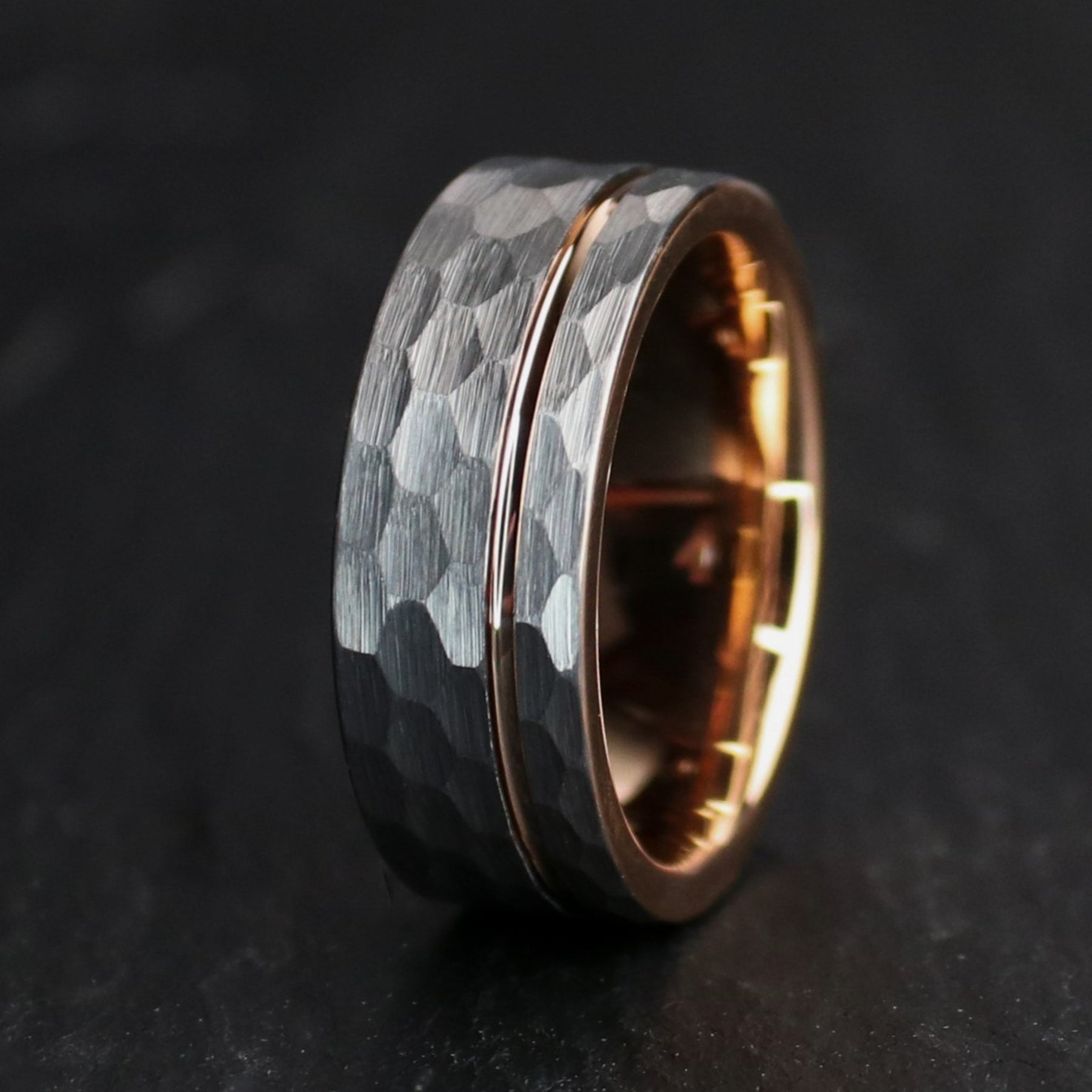 We use Tungsten Carbide to cut Titanium. That's how strong it is. It's an absolute marvel of modern engineering, and ranks a 9-9.5 on Mohs hardness scale (scales out of 10). This design pairs a rustic, hammered, gray tungsten carbide exterior, with a rose gold coated inlay, and interior. The ring is forged via sintering in an industrial mold, and I polish it with diamond paste.