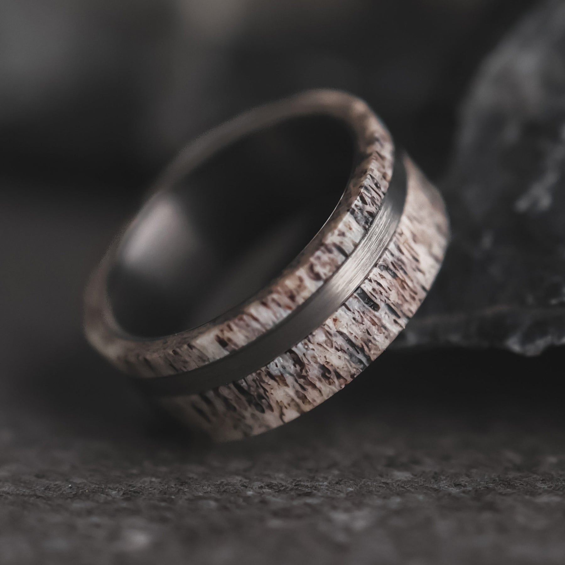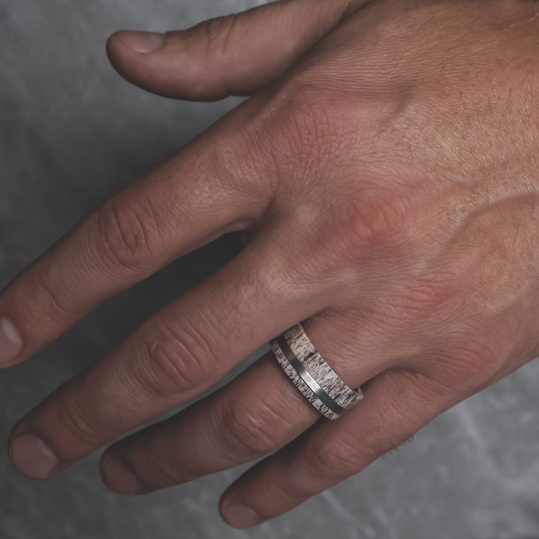 The Buck includes a brushed Tungsten Carbide core with a stunning Whitetail Deer Antler exterior. The offset brushed tungsten carbide inlay sets this wedding ring apart, making this a truly unique men's ring. Each piece of deer antler will differ, as it does in nature.