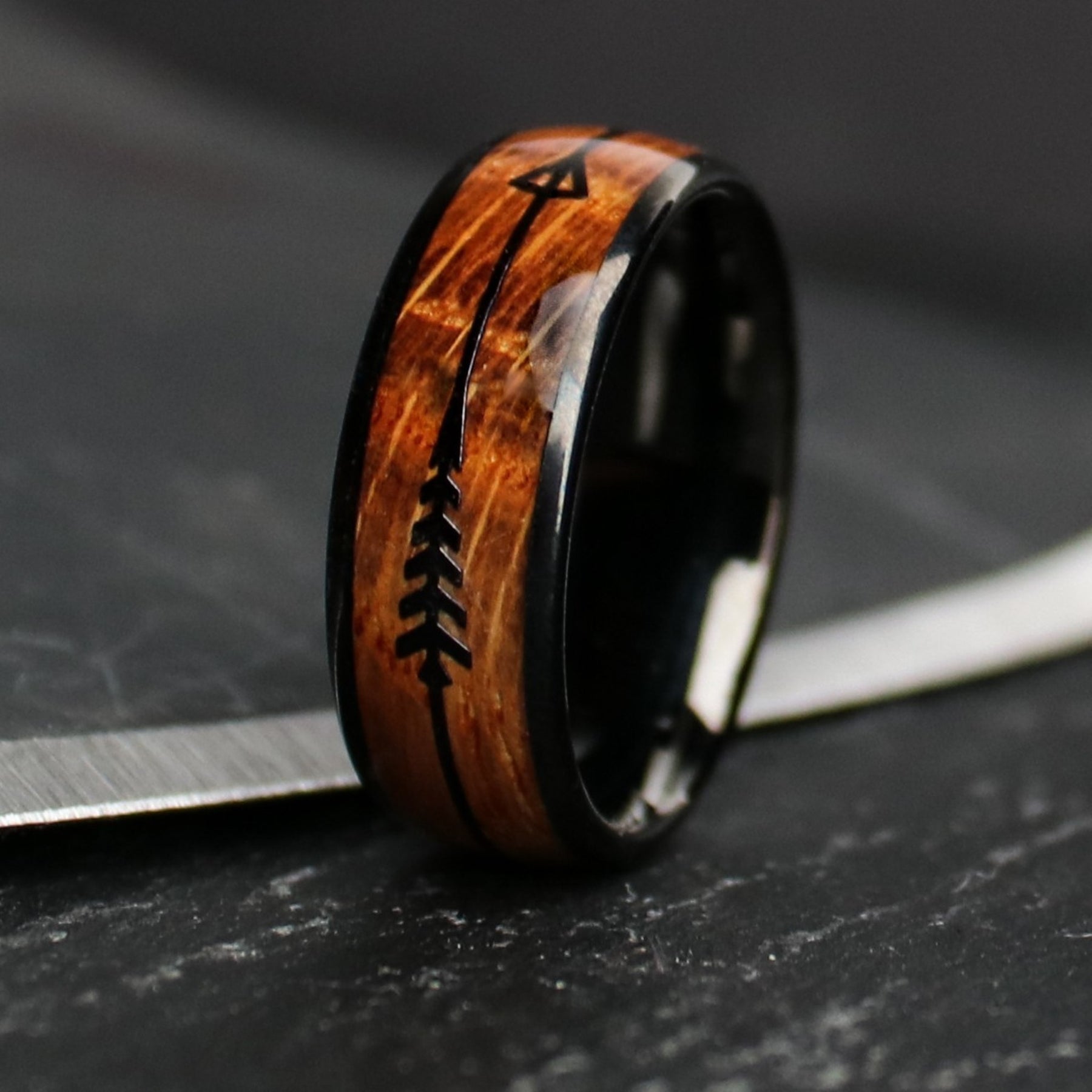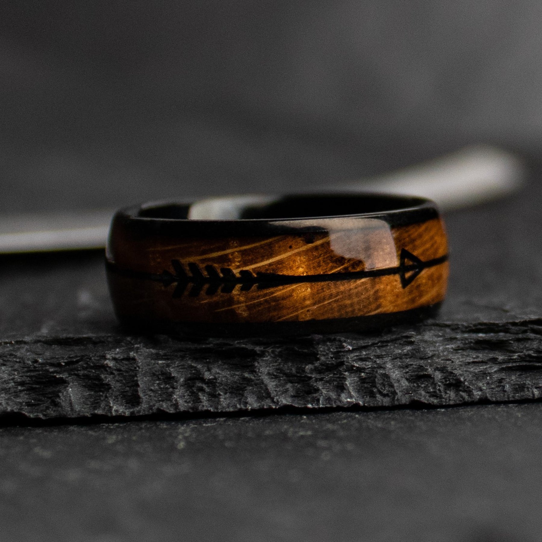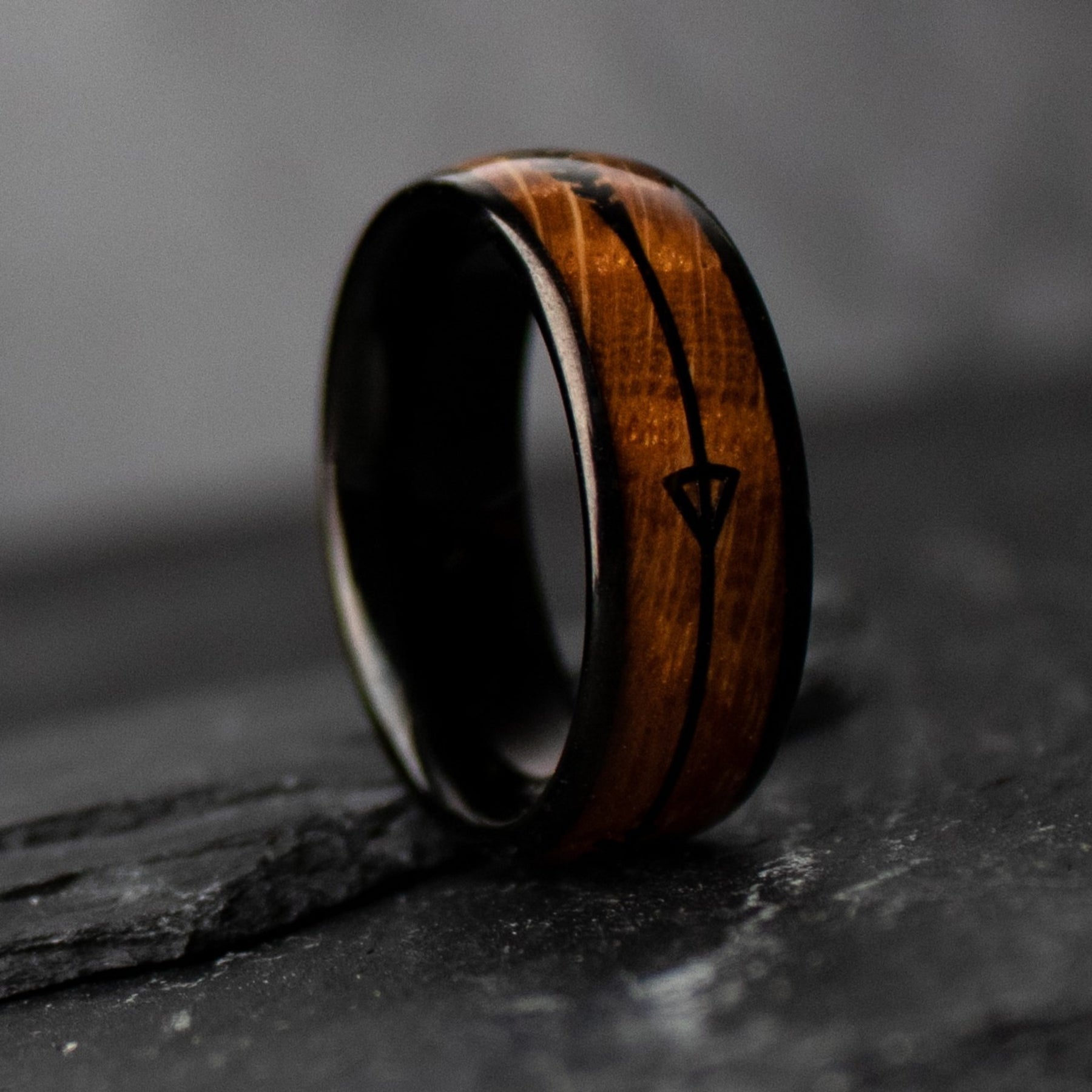 Jack Daniel's old growth whiskey barrel oak accompanies black hardened Tungsten Carbide in this bold wedding ring. The distinctive timber runs from a dark brown coffee heartwood, through white sapwood streaks. It has a gorgeous and unique aesthetic.