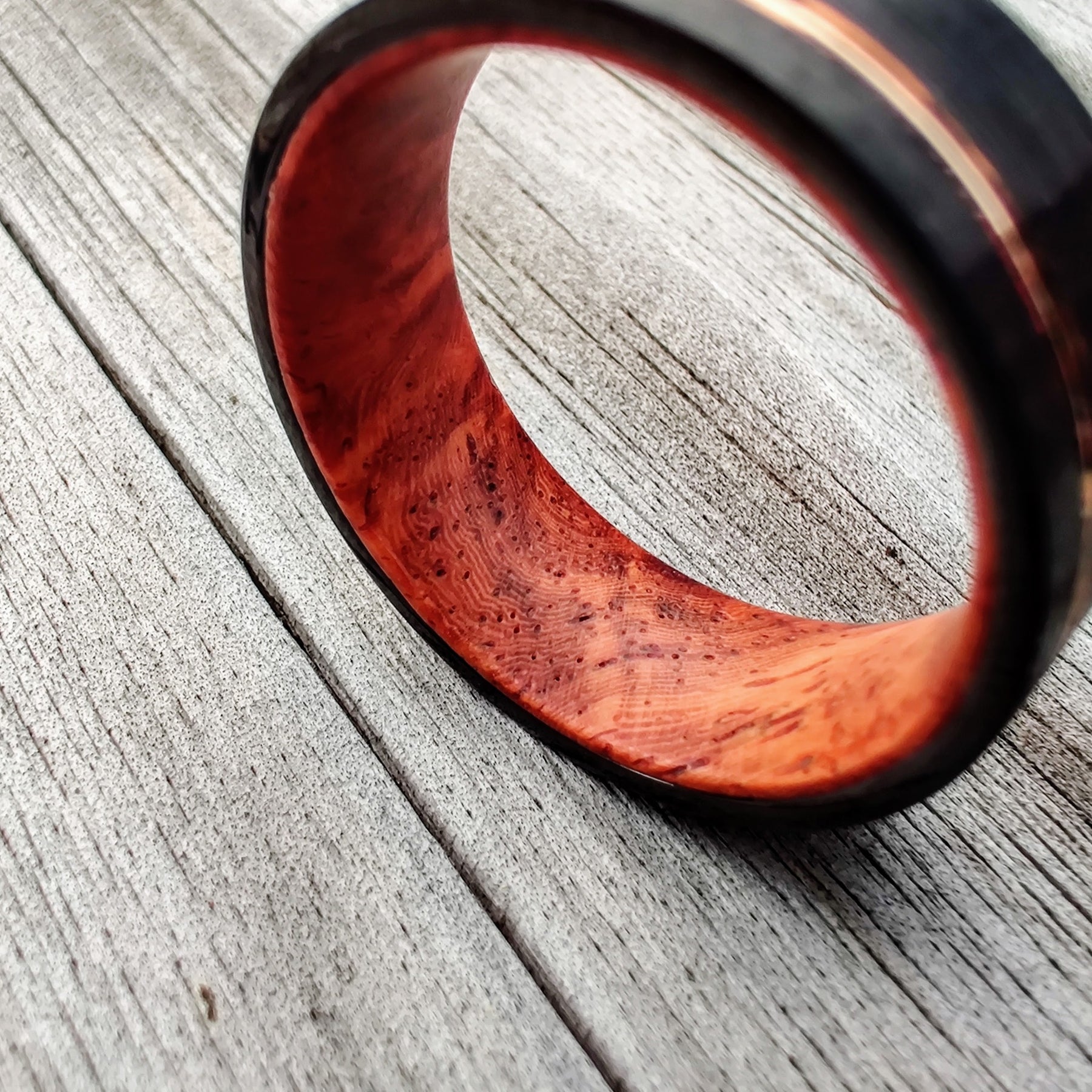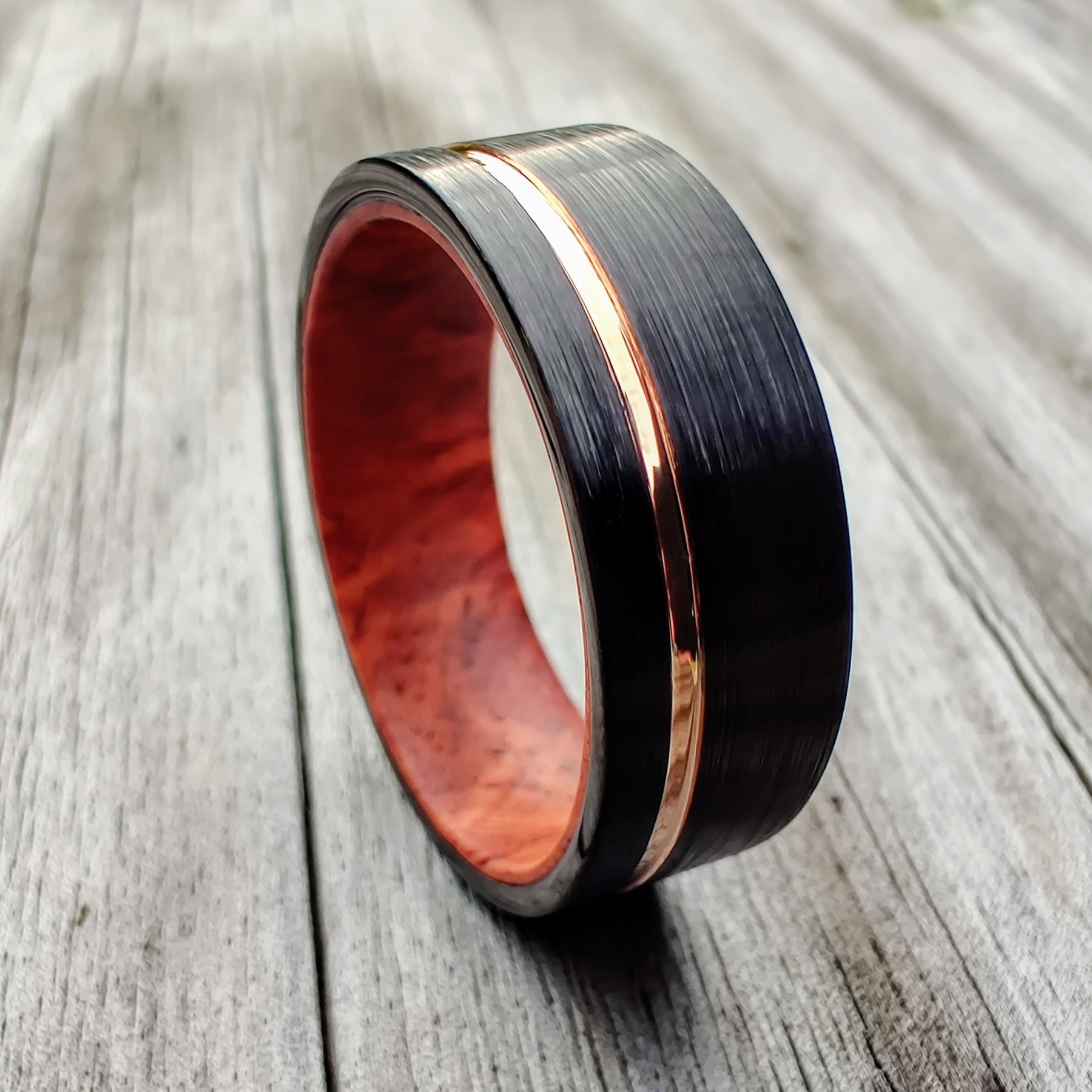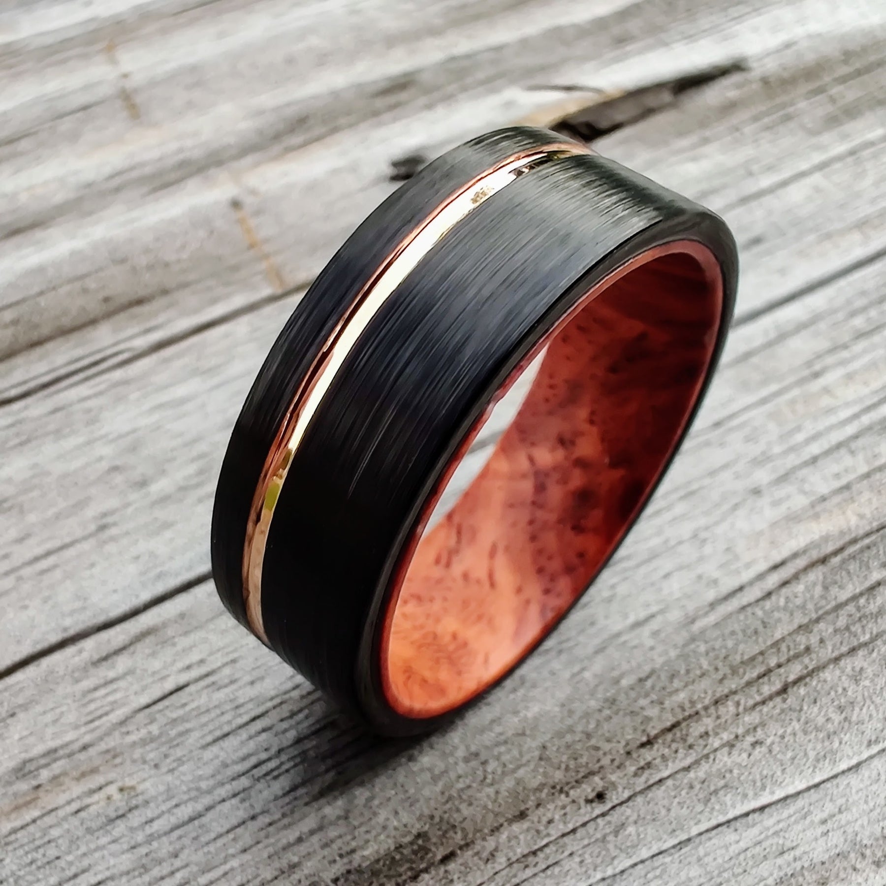 Rosewood burl is renown for its desirable, unique grain structure. Its grain runs from crimson red sapwood, throughout black/brown sweeping heartwood. It makes for an entirely distinctive grain pattern. The timber in this ring is paired with a brushed black Tungsten exterior, with an offset Rose Gold inlay. All timber is sealed in a vacuum with acrylic resin, to make the most durable, and water resistant rings possible. They are all finished in marine grade epoxy for utmost strength and durability.