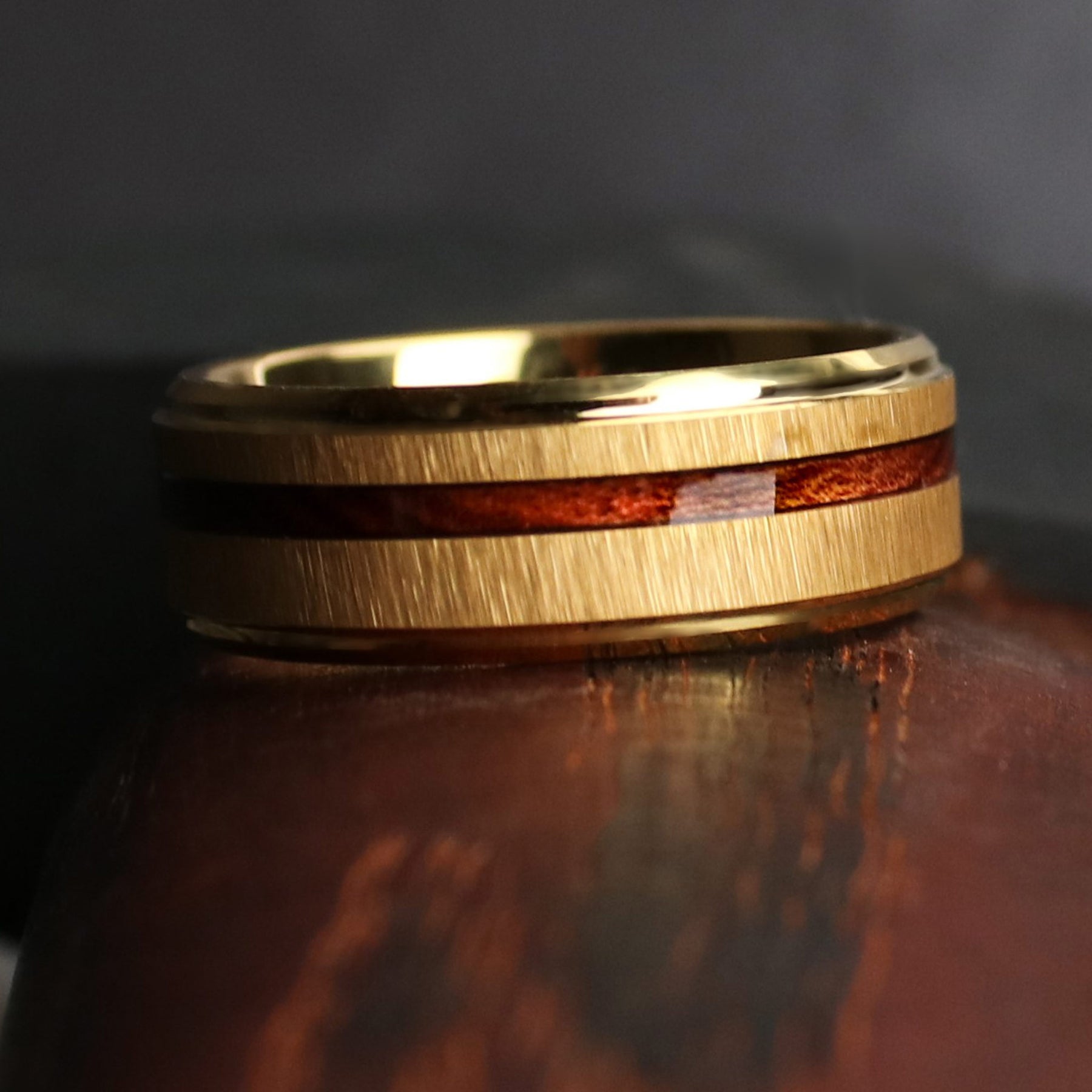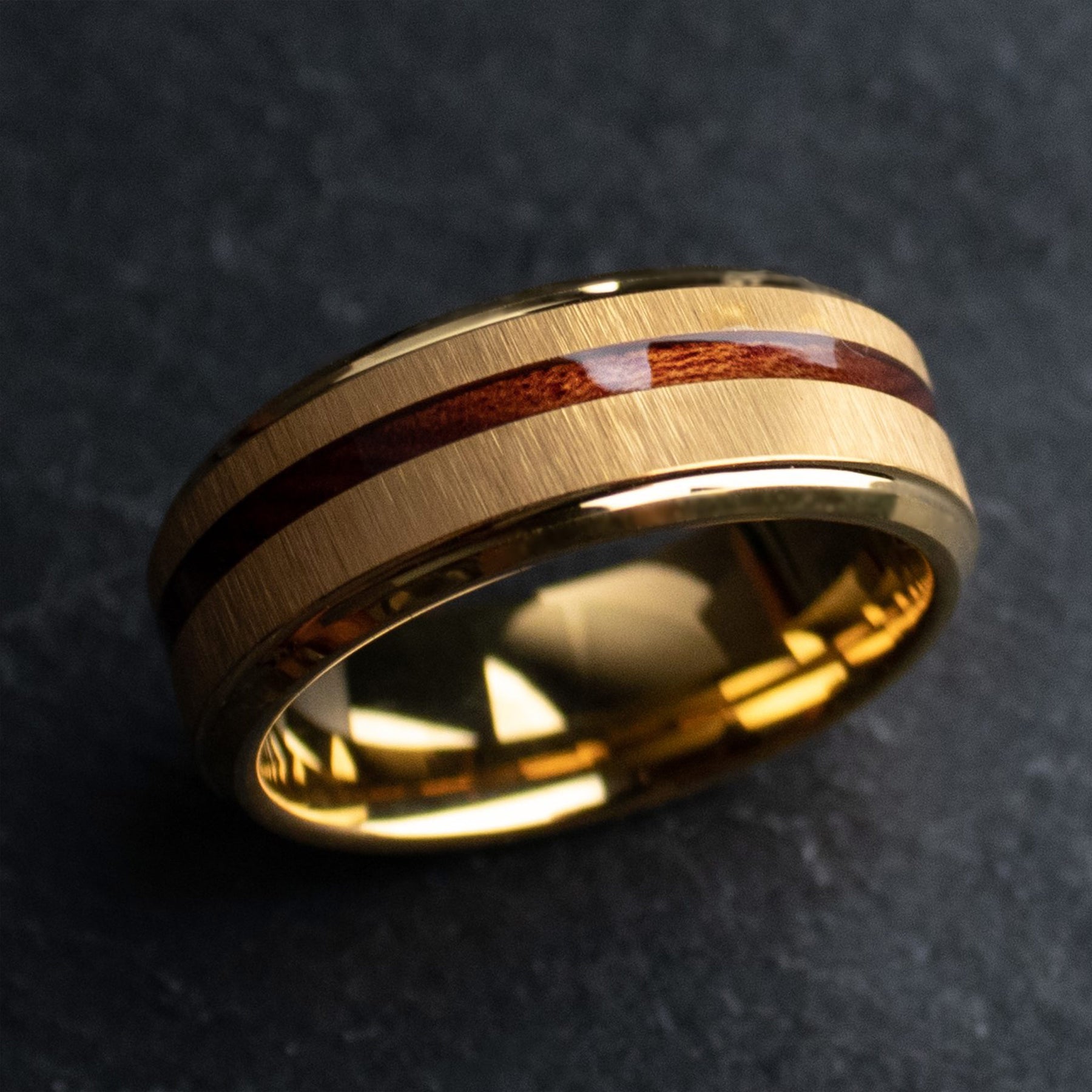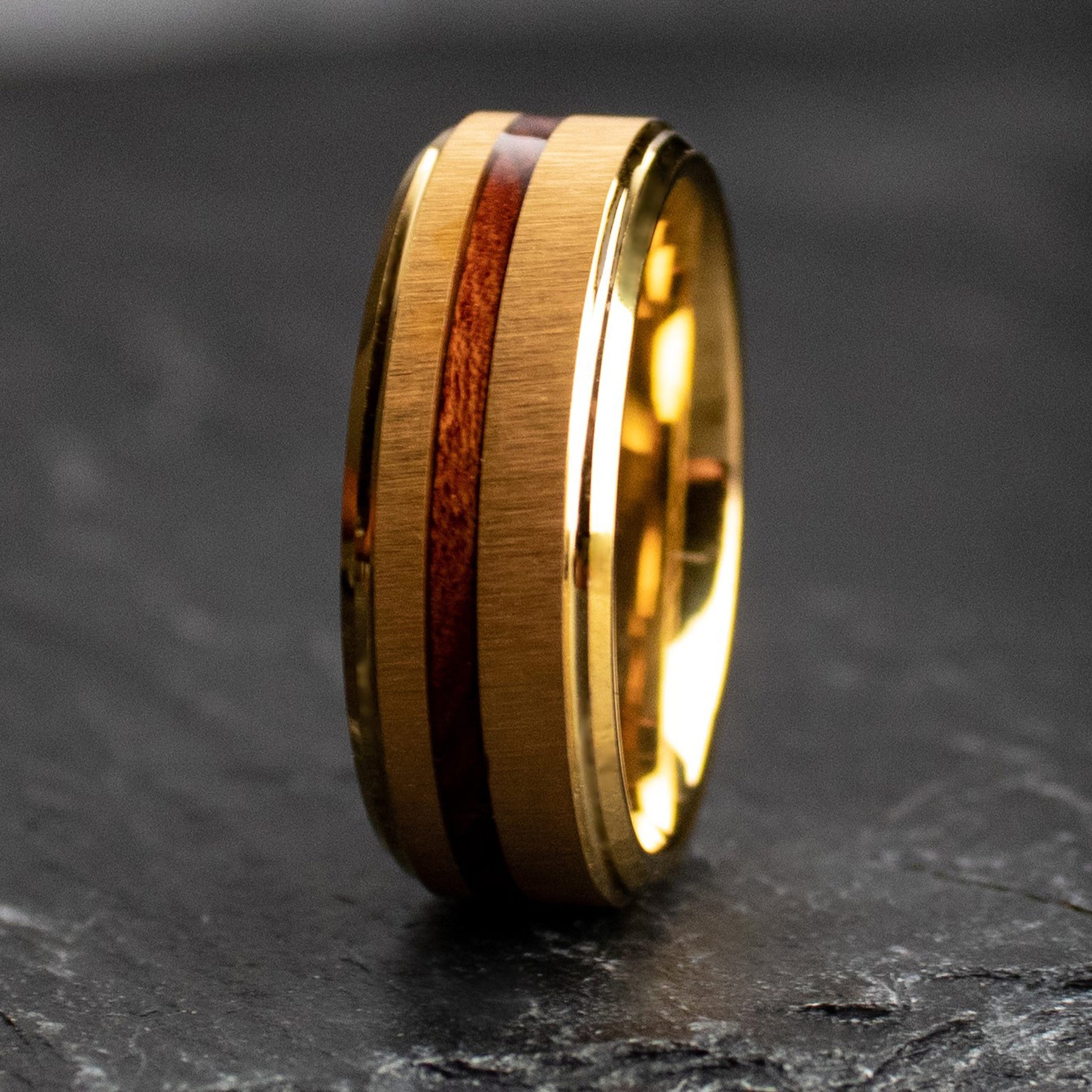 18k yellow gold Tungsten Carbide is paired with exceptional desert ironwood in this unique wedding band. Desert Ironwood is a gorgeous and distinctive timber; its heartwood runs from brilliant crimson red streaks, through darker maroon tones. This wedding band is hit with a perpendicular brushing for a modern, everlasting aesthetic.