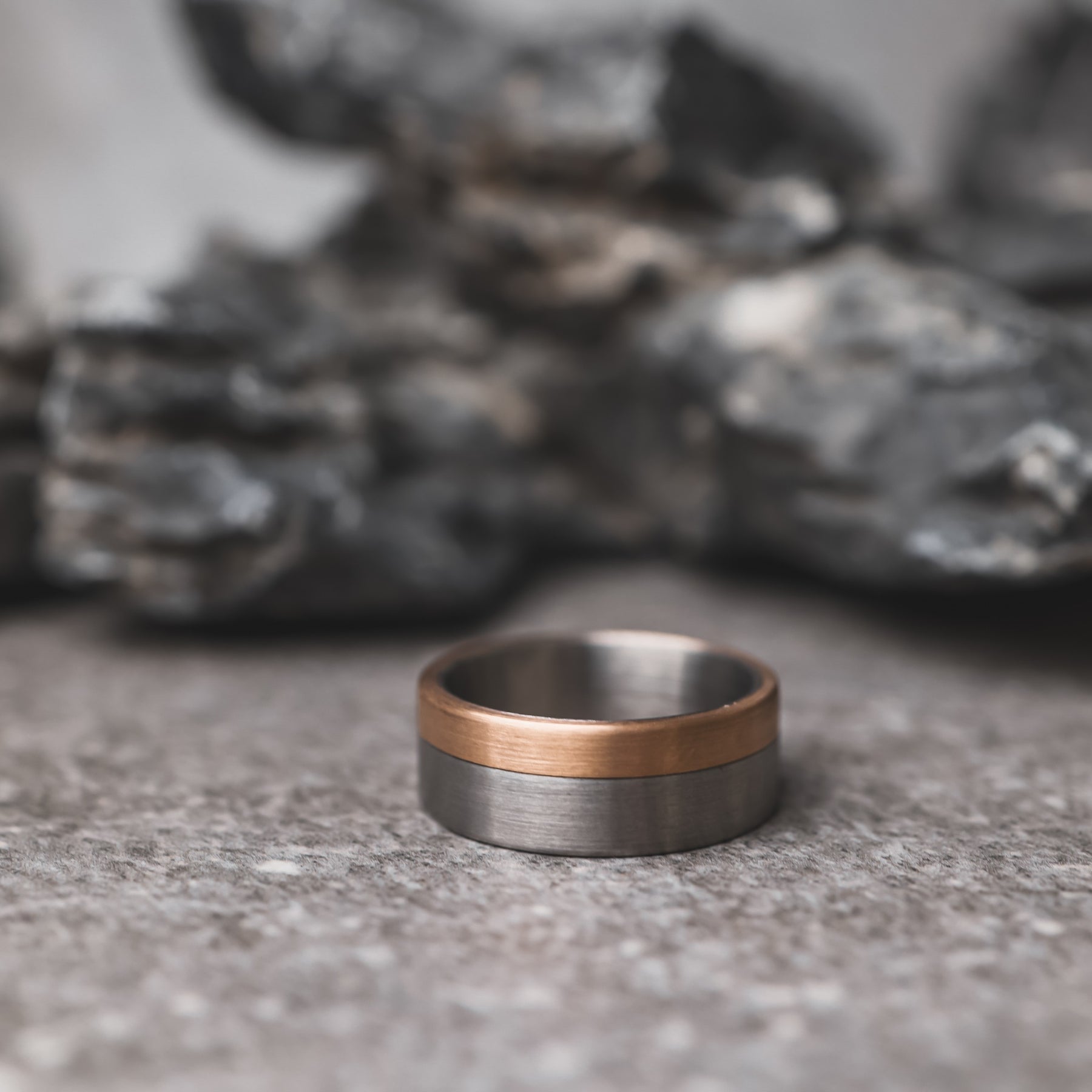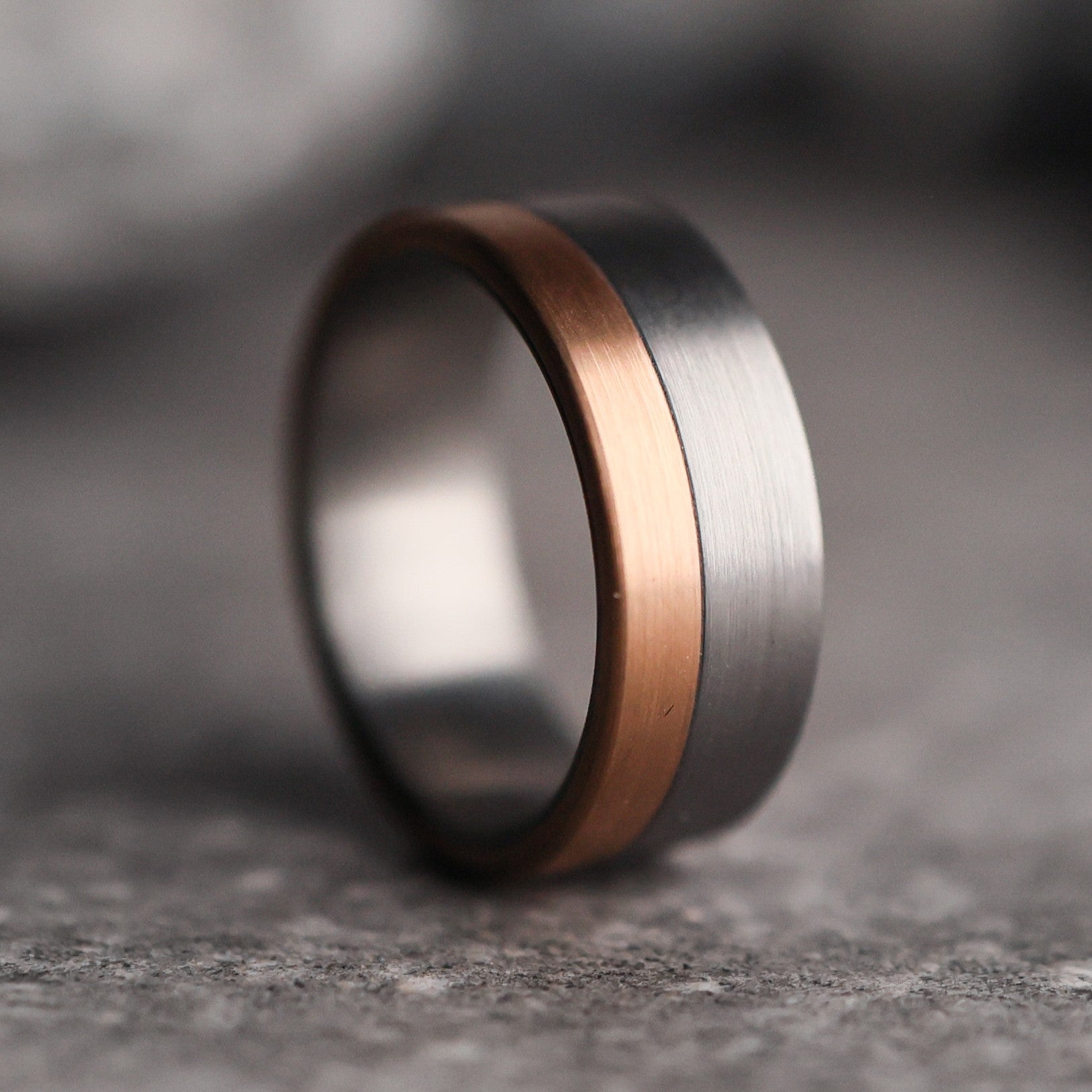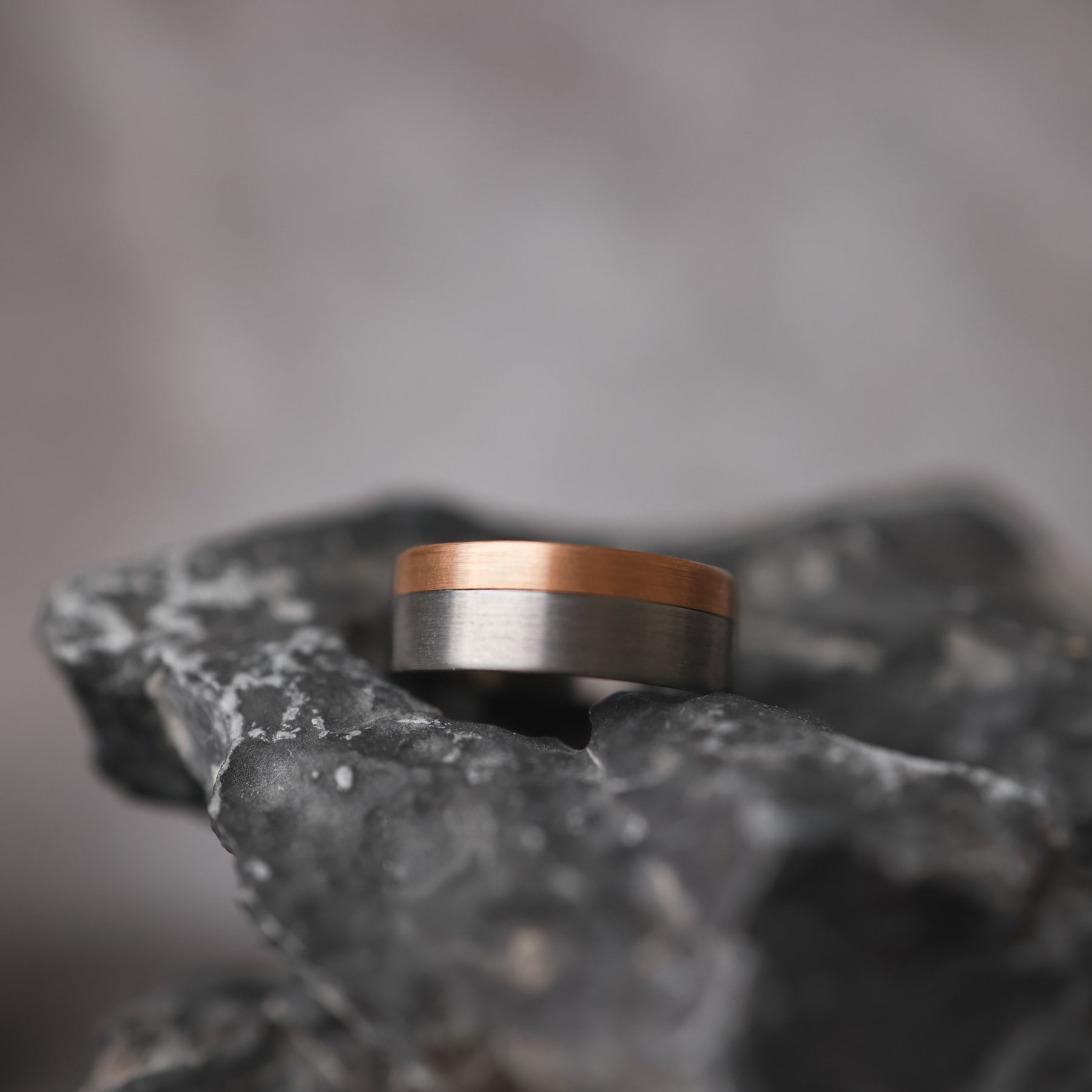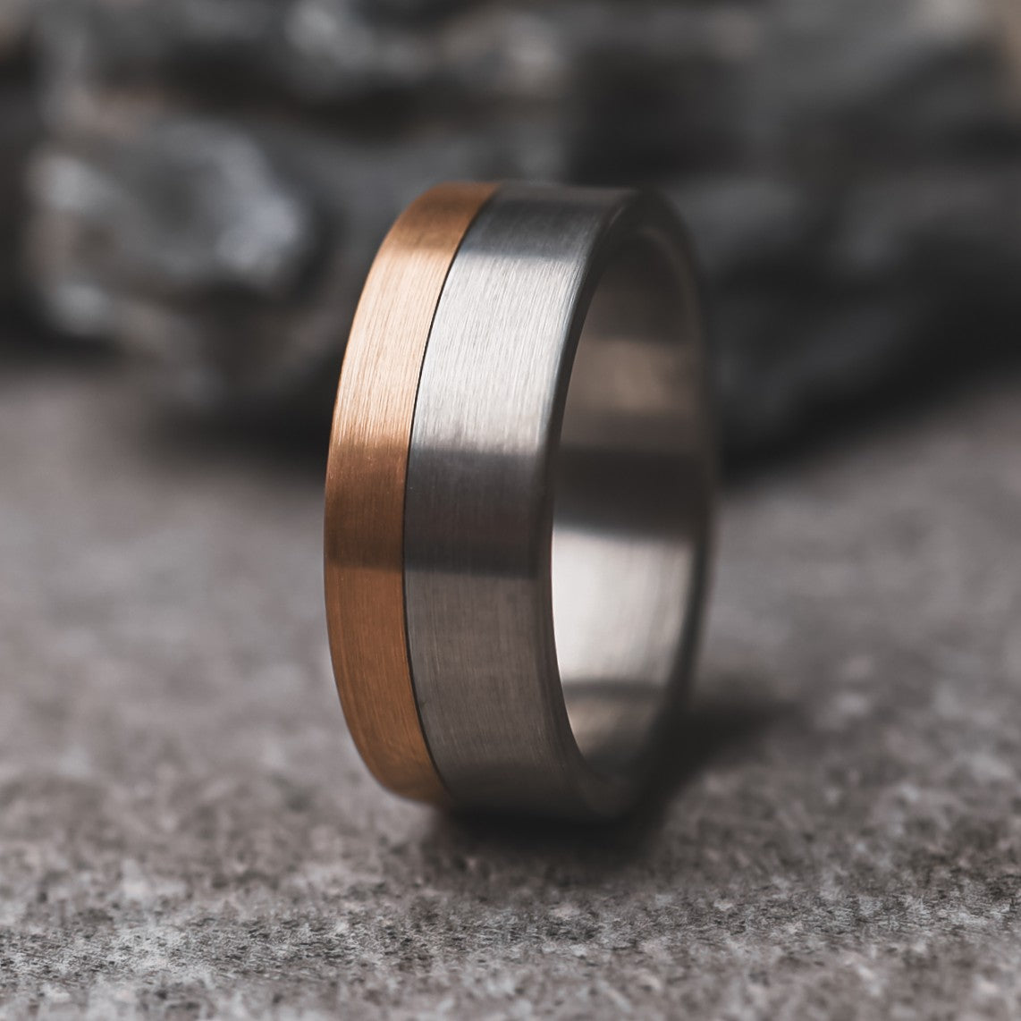 Crafted with jeweler's grade Tungsten Carbide and featuring an offset 18k plated Rose Gold finish, this band is made to outlast our Sol's explosion in 5 billion years (hell maybe even after that).