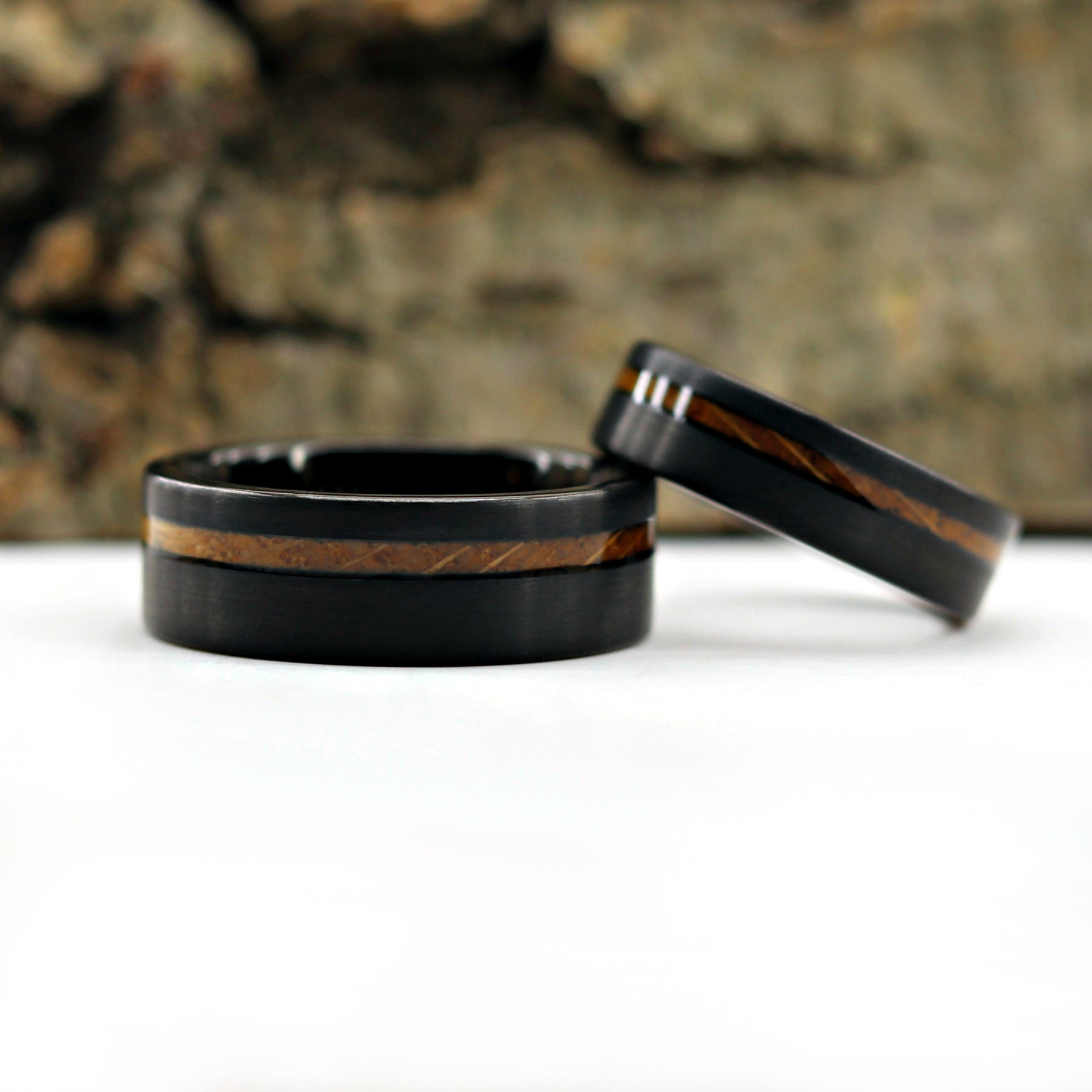 Old growth whiskey barrel oak is set into black tungsten carbide in this ring design.