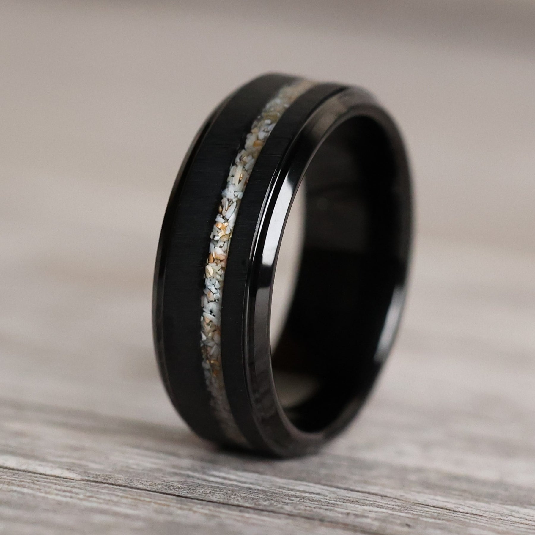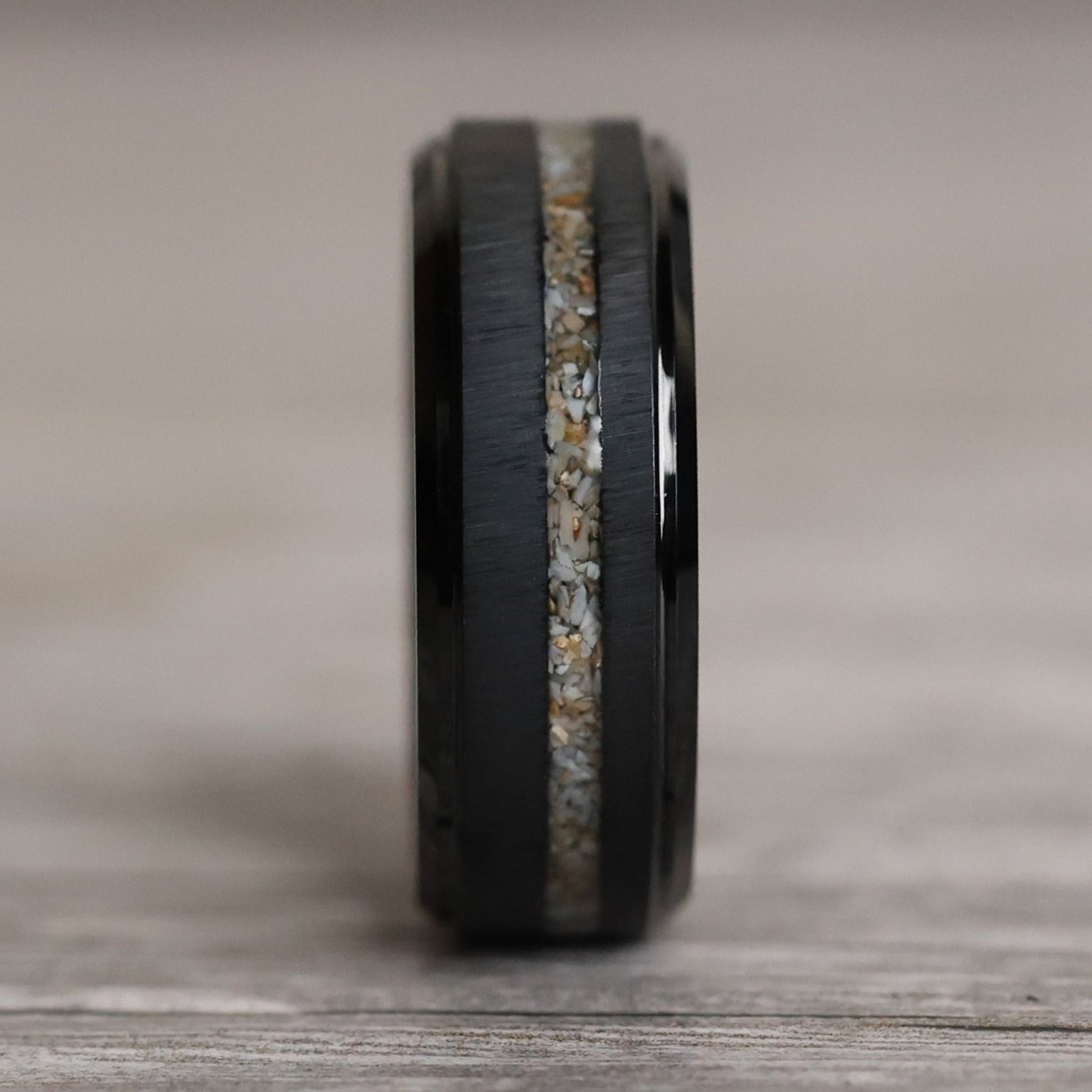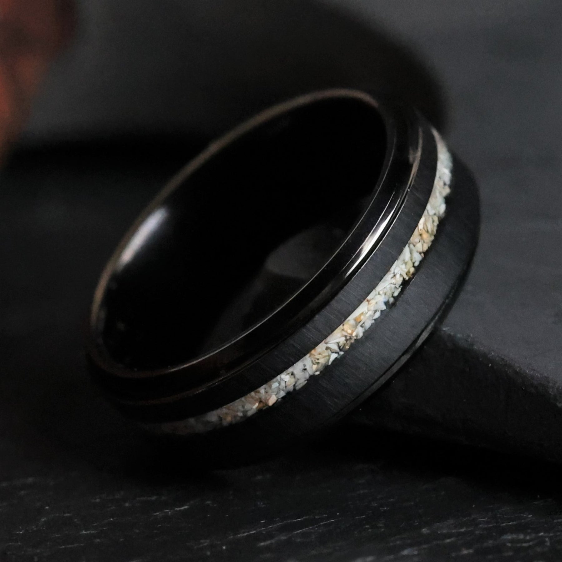 A shark tooth wedding ring. Caspersen Beach, aka "Shark Tooth Beach", is located in Venice, Florida (about an hour from our shop). It's known as the shark tooth capital of the world. Converging currents from the Gulf drop off tons, upon tons of sediment daily, packed with prehistoric shark teeth that are estimated to be 10,000 years old or more.