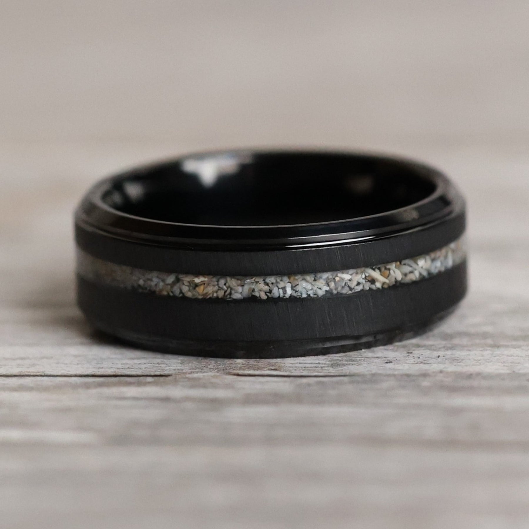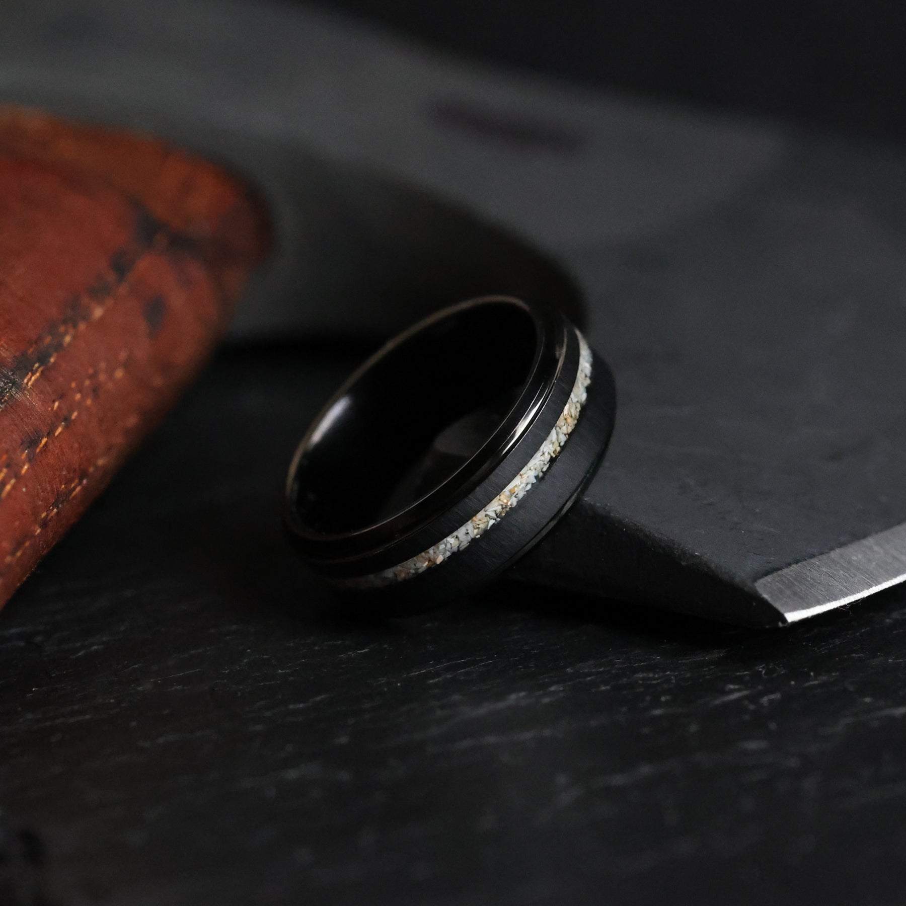 Being history buffs, and fishermen ourselves, we inlaid this wedding band with shark teeth found from the beach.