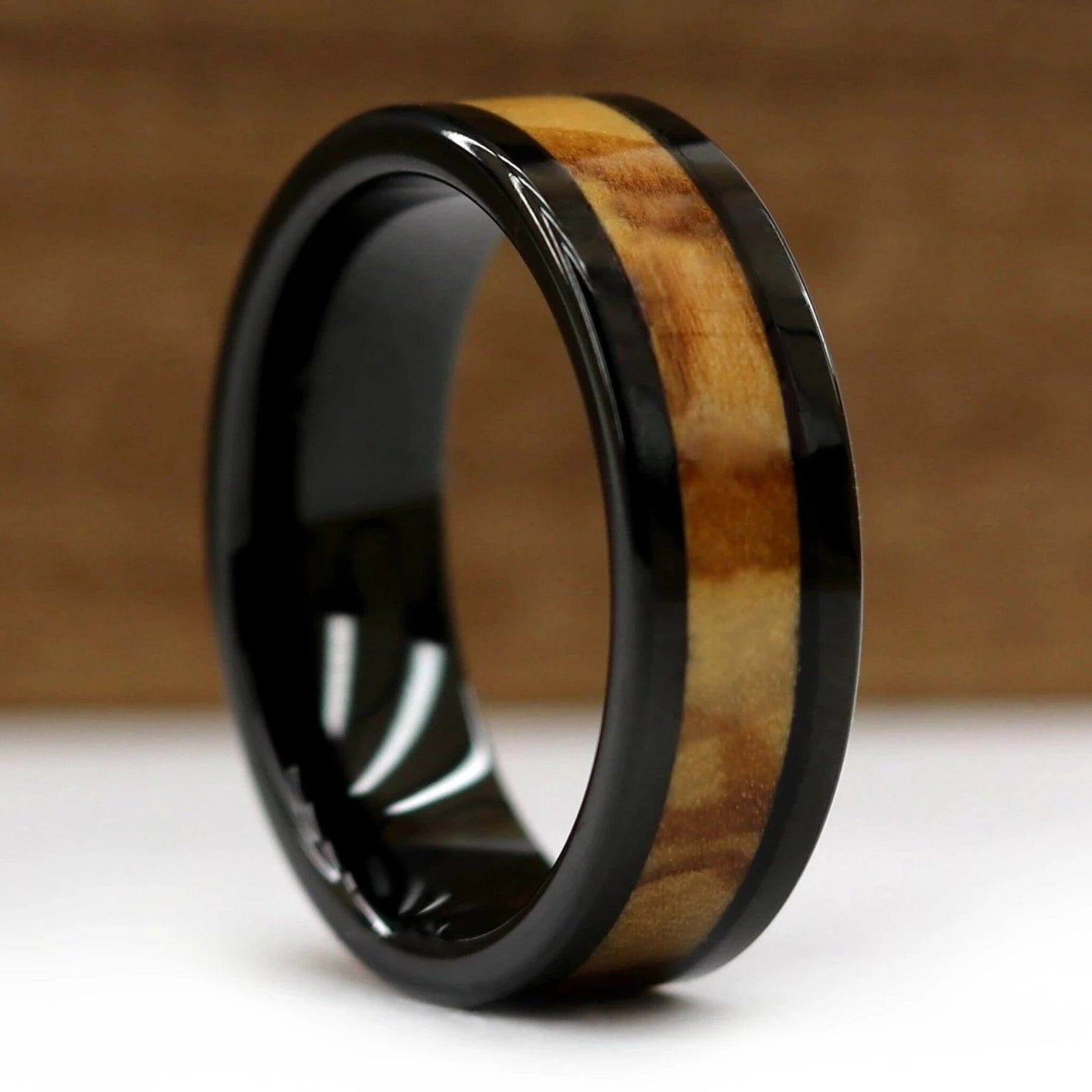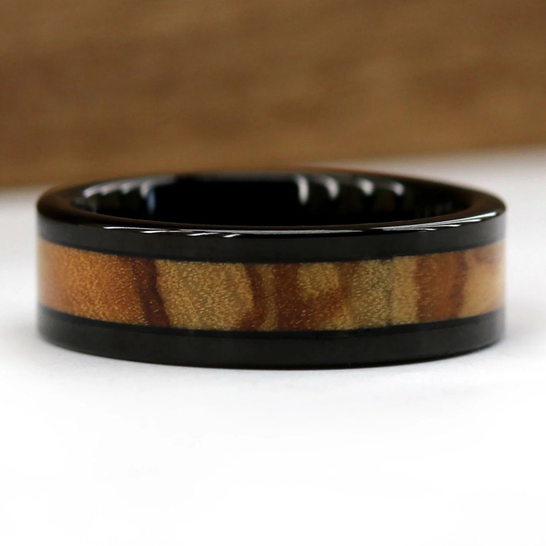 The Olivewood is shaped using a bentwood method; steambending the timber and wrapping it along the circumference of the ring. This makes for a unique aesthetic, and provides a very strong substrate for the timber.