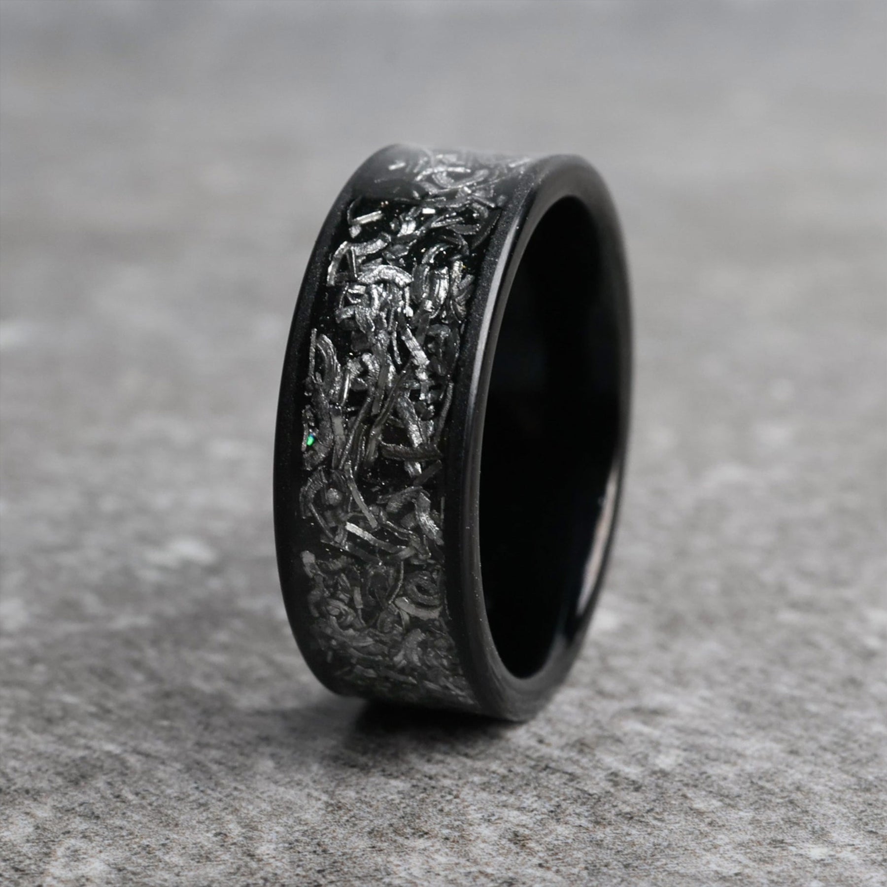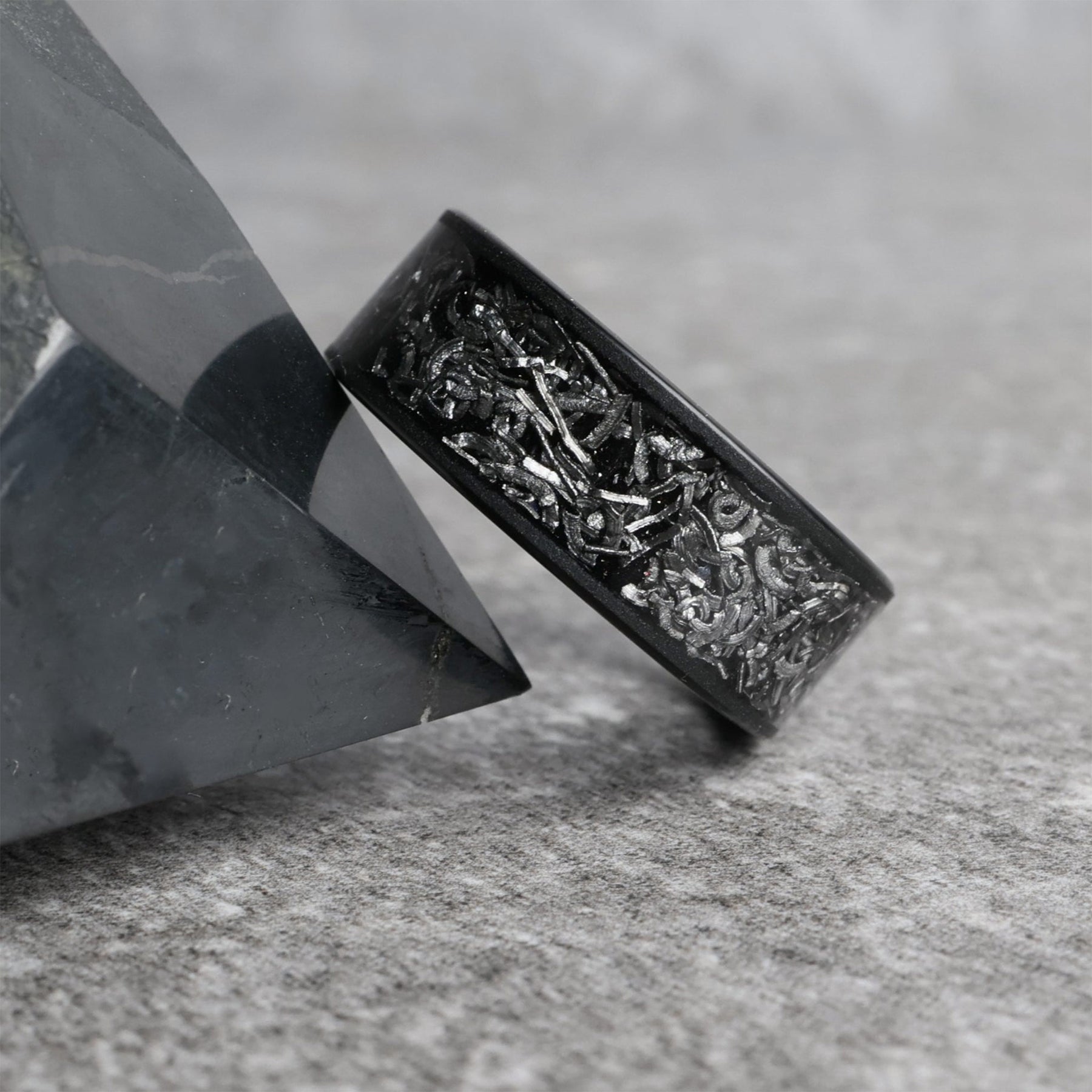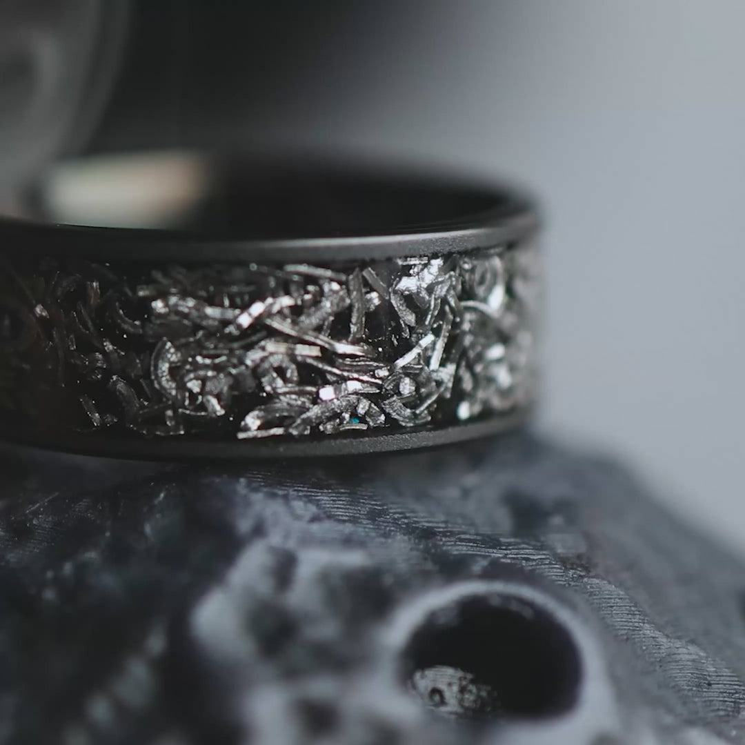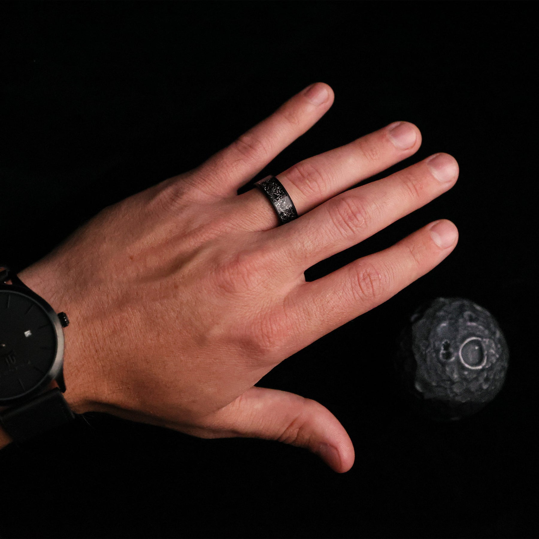 Introducing The Asteroid, a black wedding band featuring an authentic 4 billion year old Gibeon meteorite inlay.