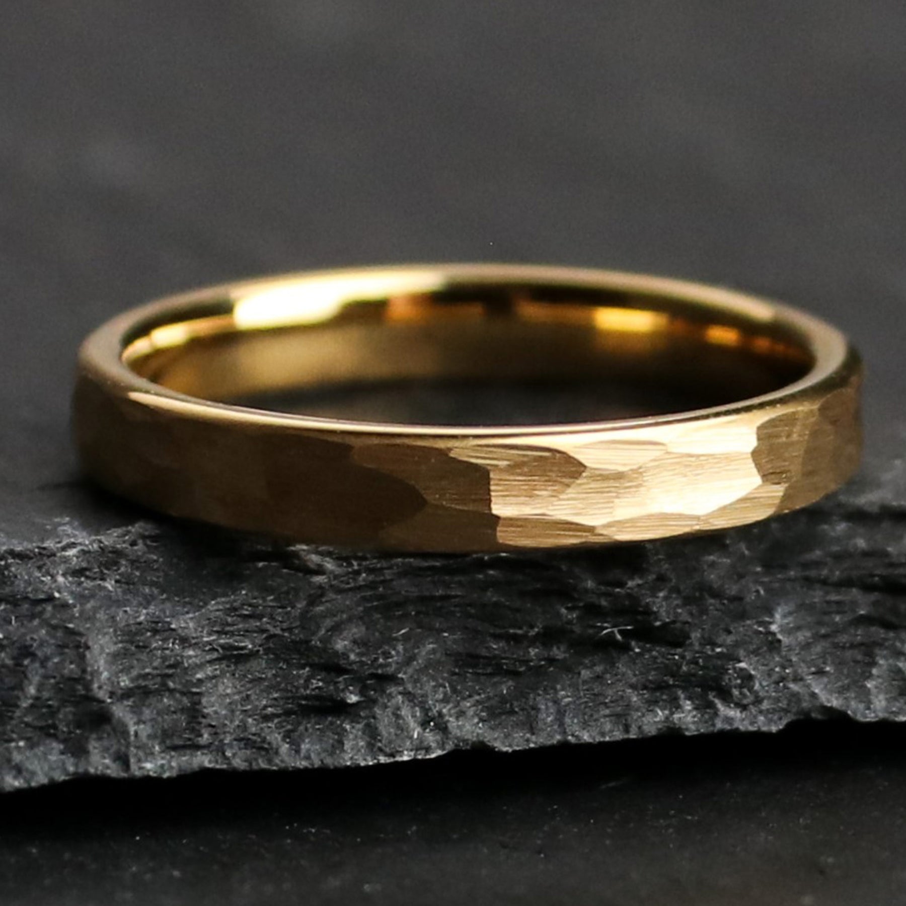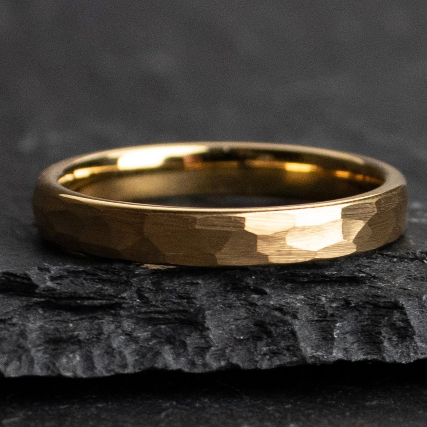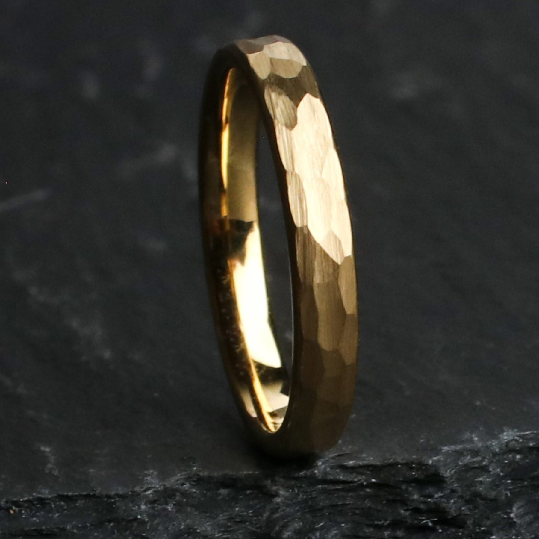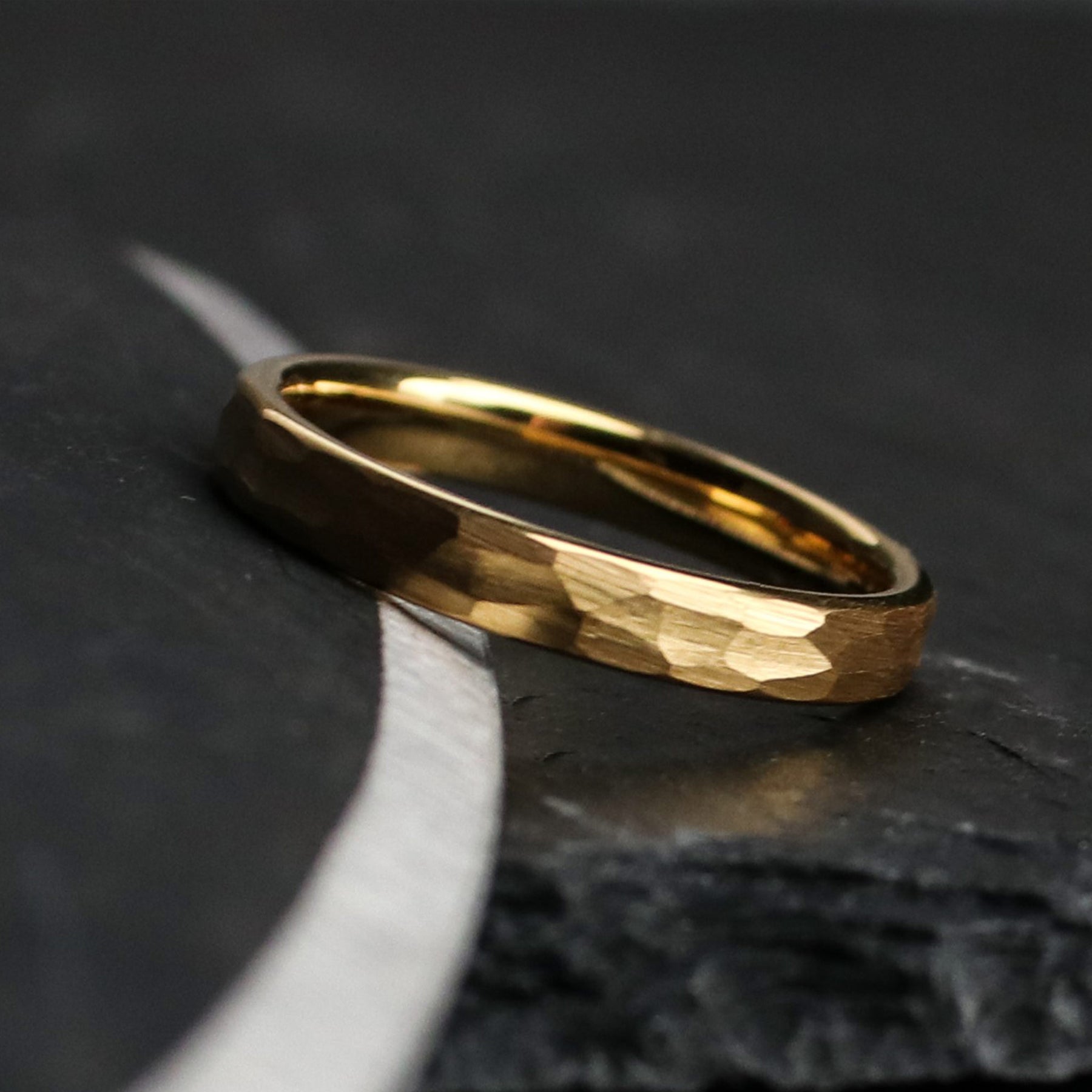 Freya or Freyja is the ancient Norse god of love, beauty, battle and gold. This modern, yet rustic, hammered gold wedding band aptly fits its name.