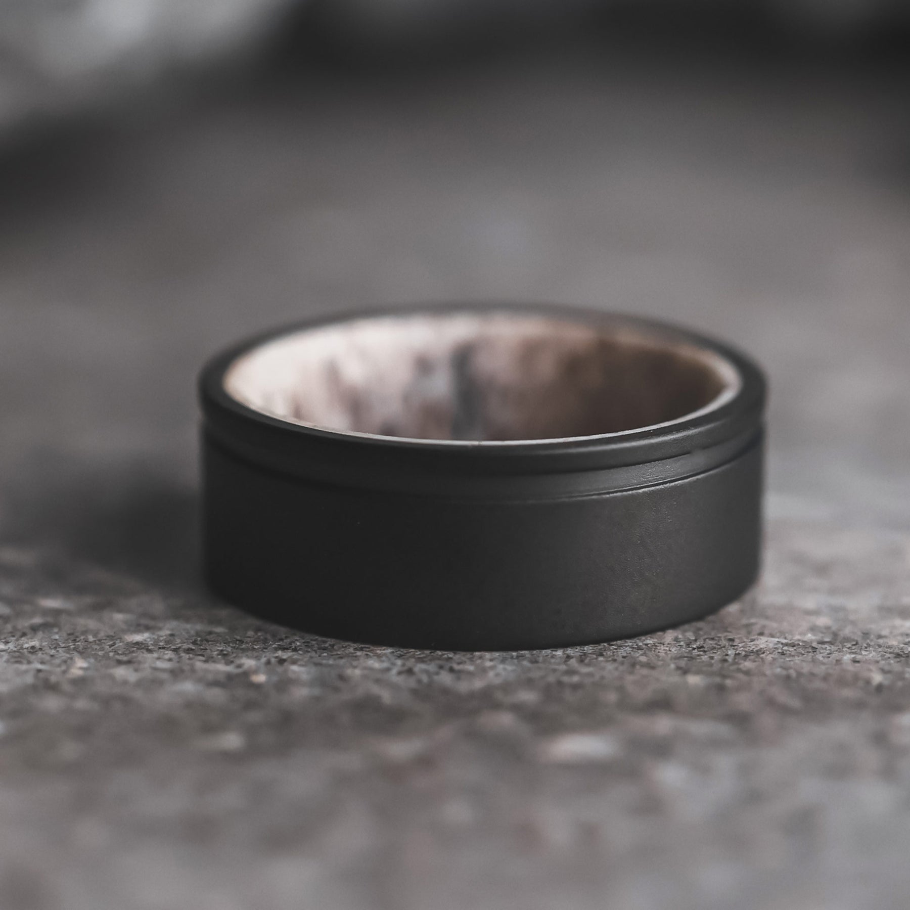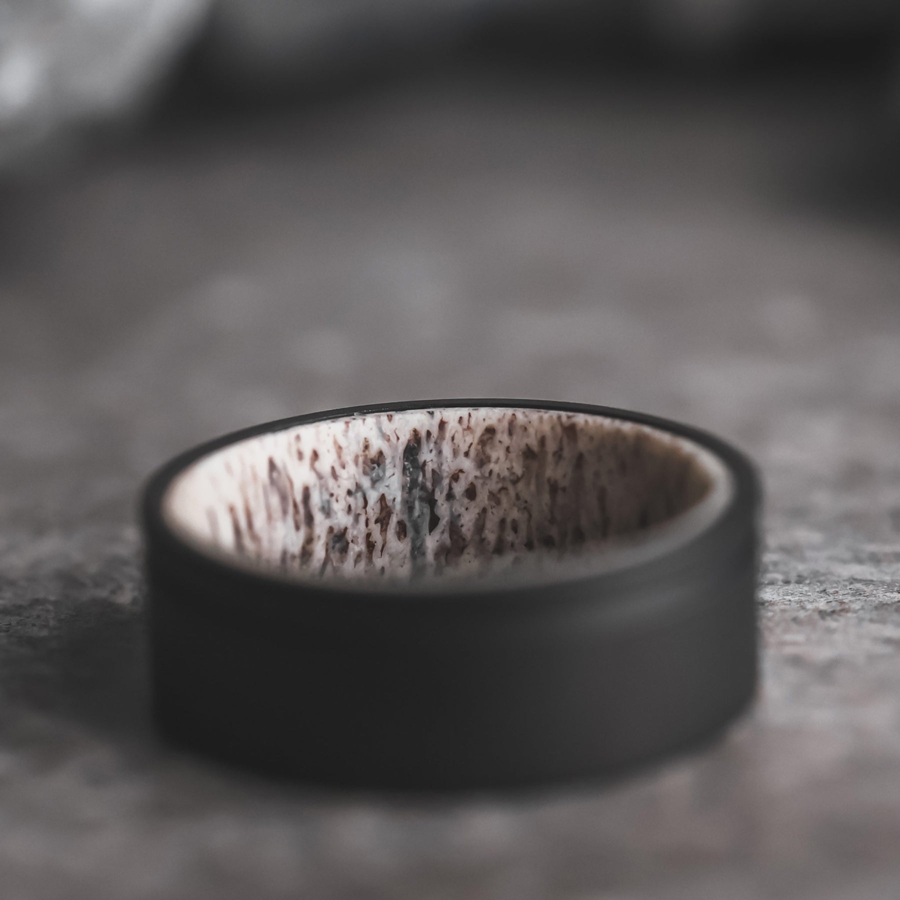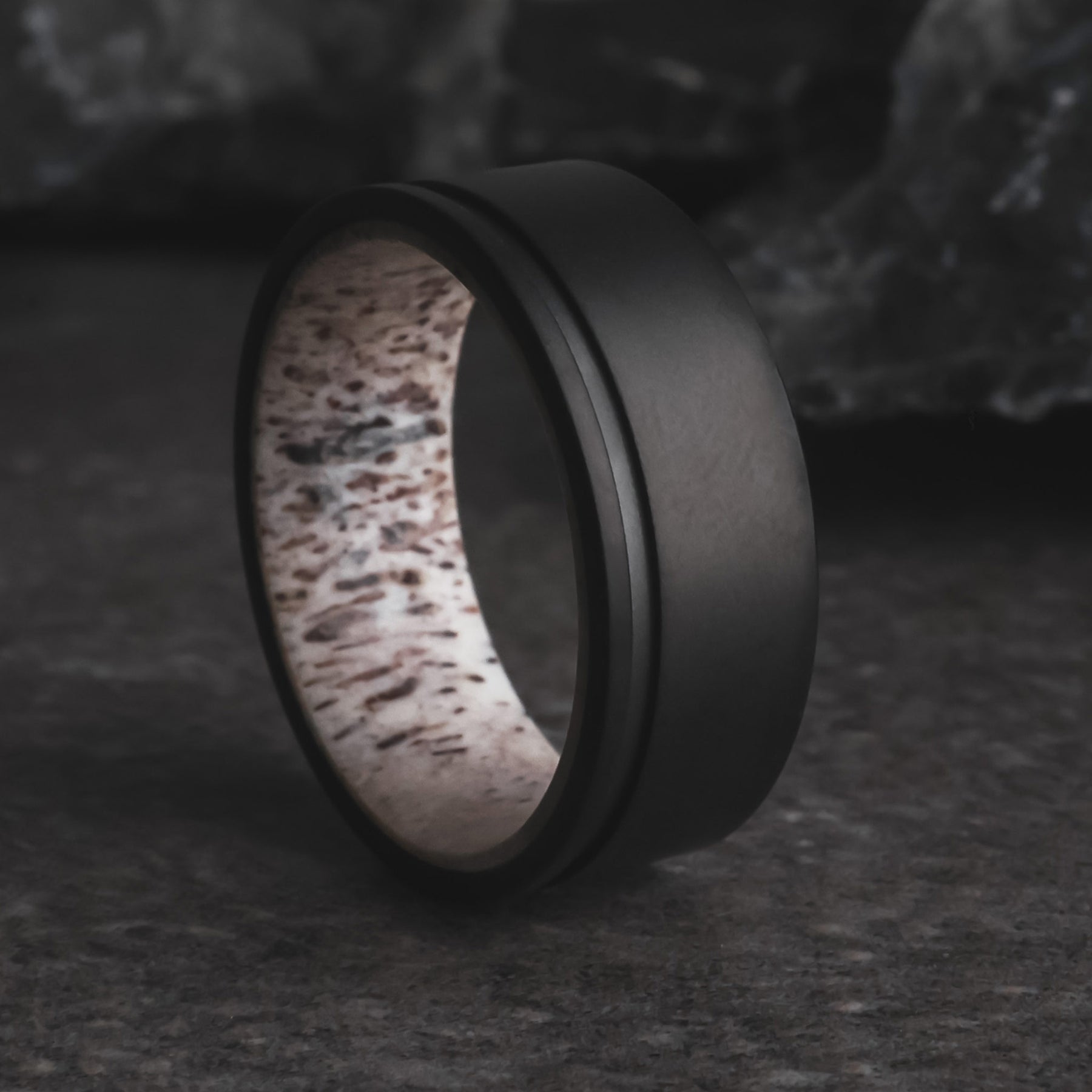 We've brought an old favorite back to life, with The Stag. Caleb has created the entire interior of the ring from ethically sourced whitetail deer antler, and finished it with a luxe matte black titanium exterior with a .81mm groove for a super modern look. Each piece of deer antler will differ, as it does in nature.