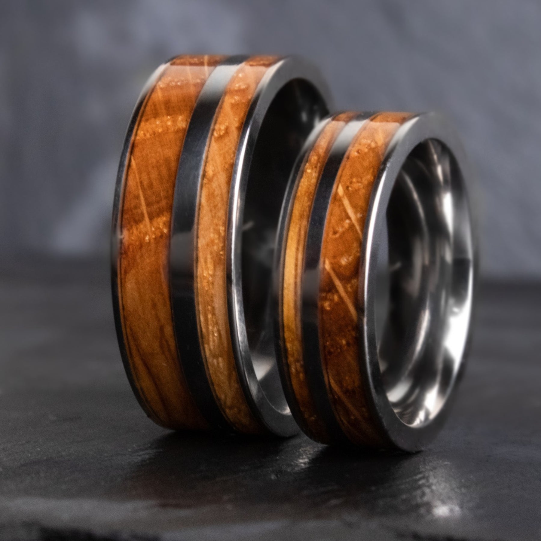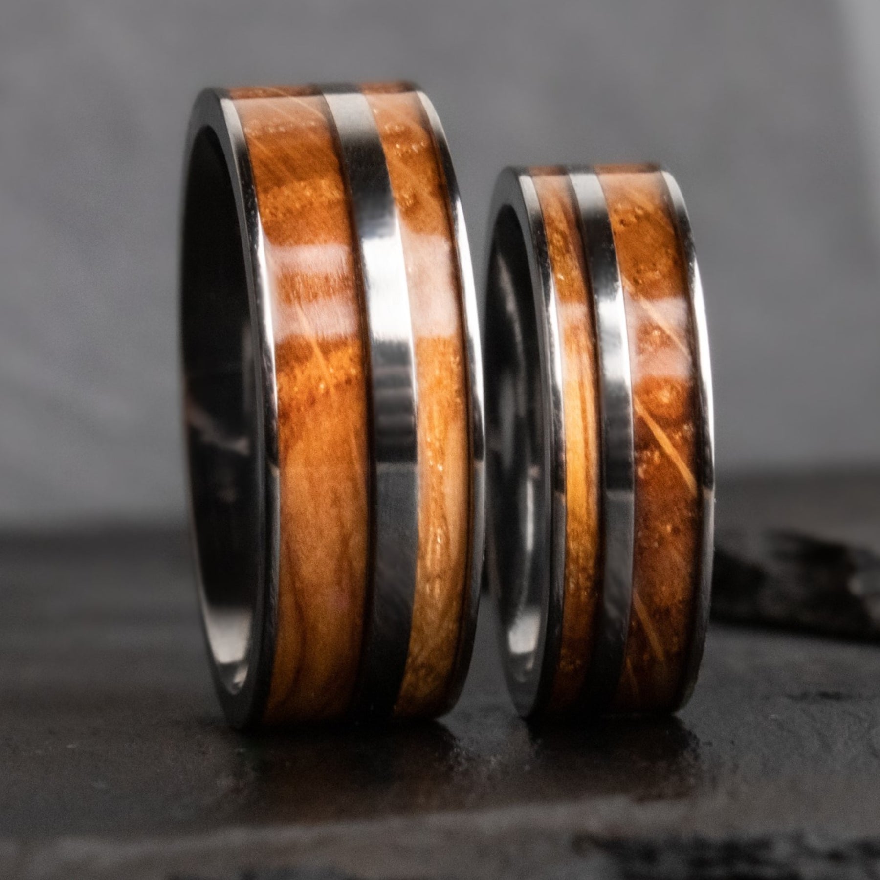 This design is perfect as an engagement ring set, promise ring set, wedding ring set, or for any occasion. Old growth Oak is set into grooved Titanium, and sealed in marine grade epoxy, to make an entirely waterproof design.