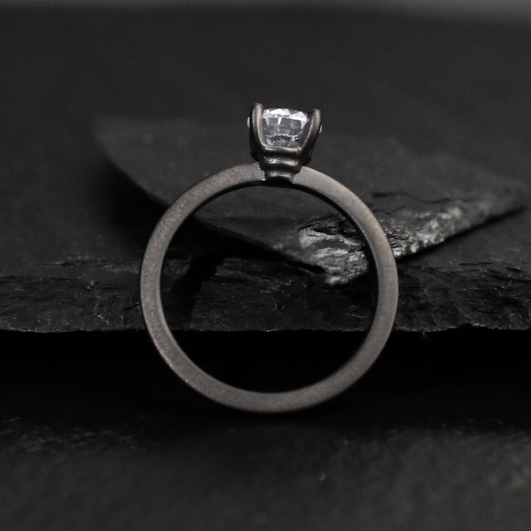 Turn your man into stone with The Medusa, a new and unique engagement ring from Thorum. Outfitted with sandblasted black Titanium and a brilliant round stone of Moissanite.