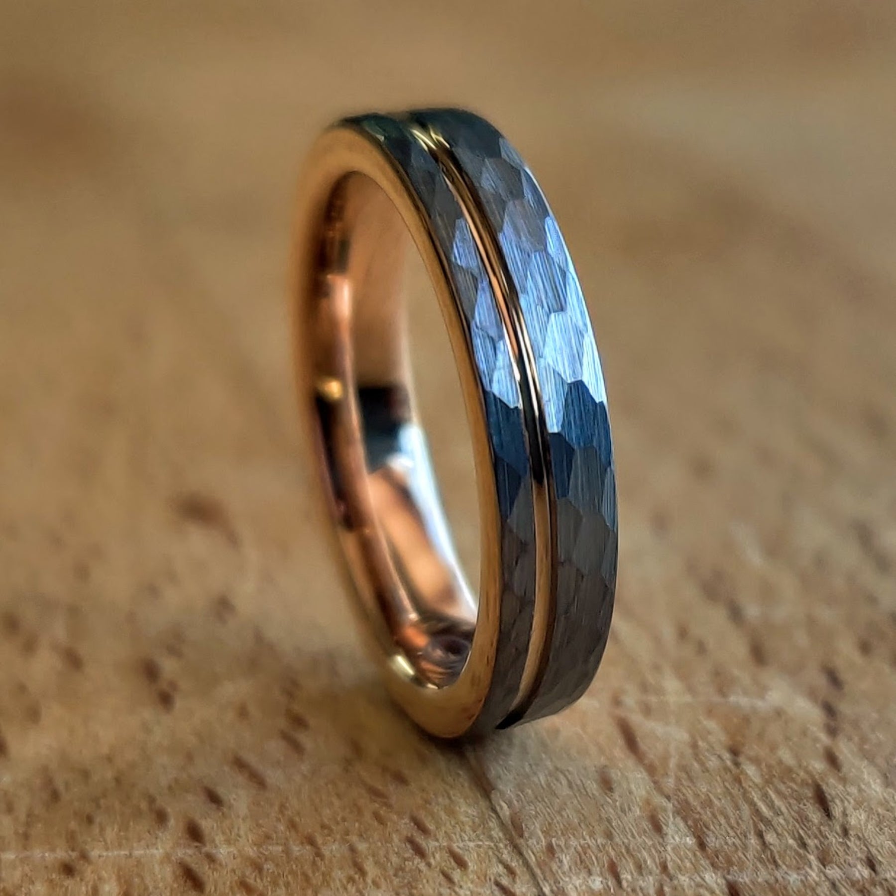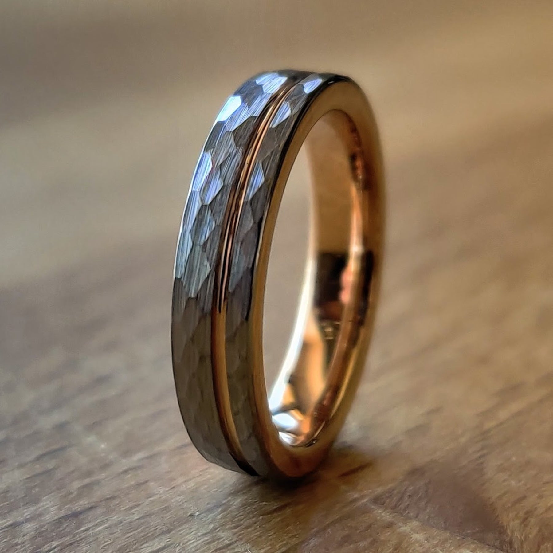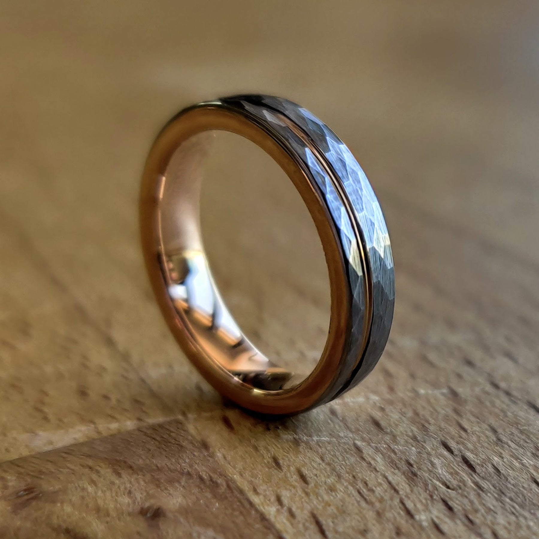 Rose gold meets modern with this hammered Tungsten Carbide women's ring. It's perfect as any engagement band, wedding band, promise ring, or for any occasion. This band is available in a matching set with a wider ring of the same design.