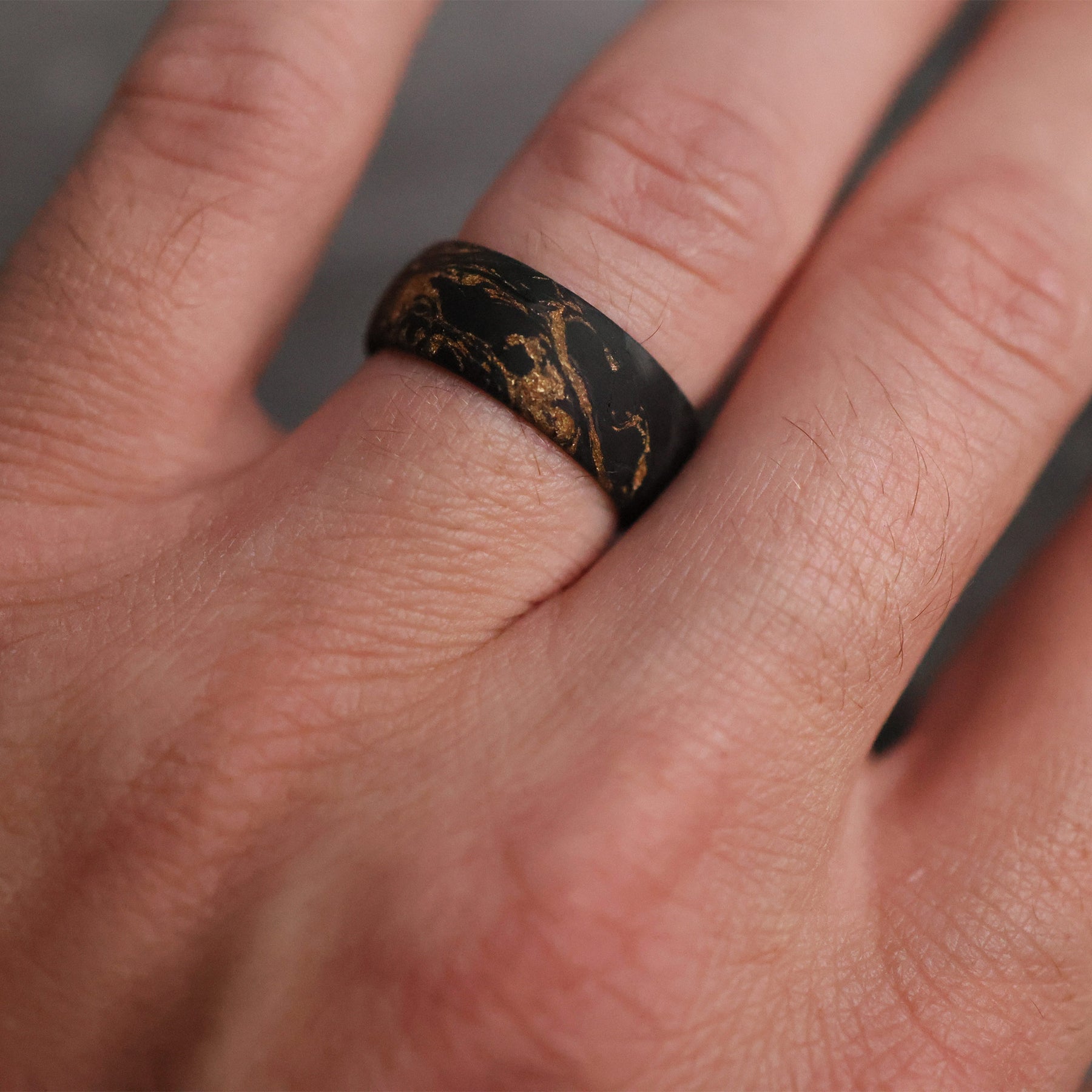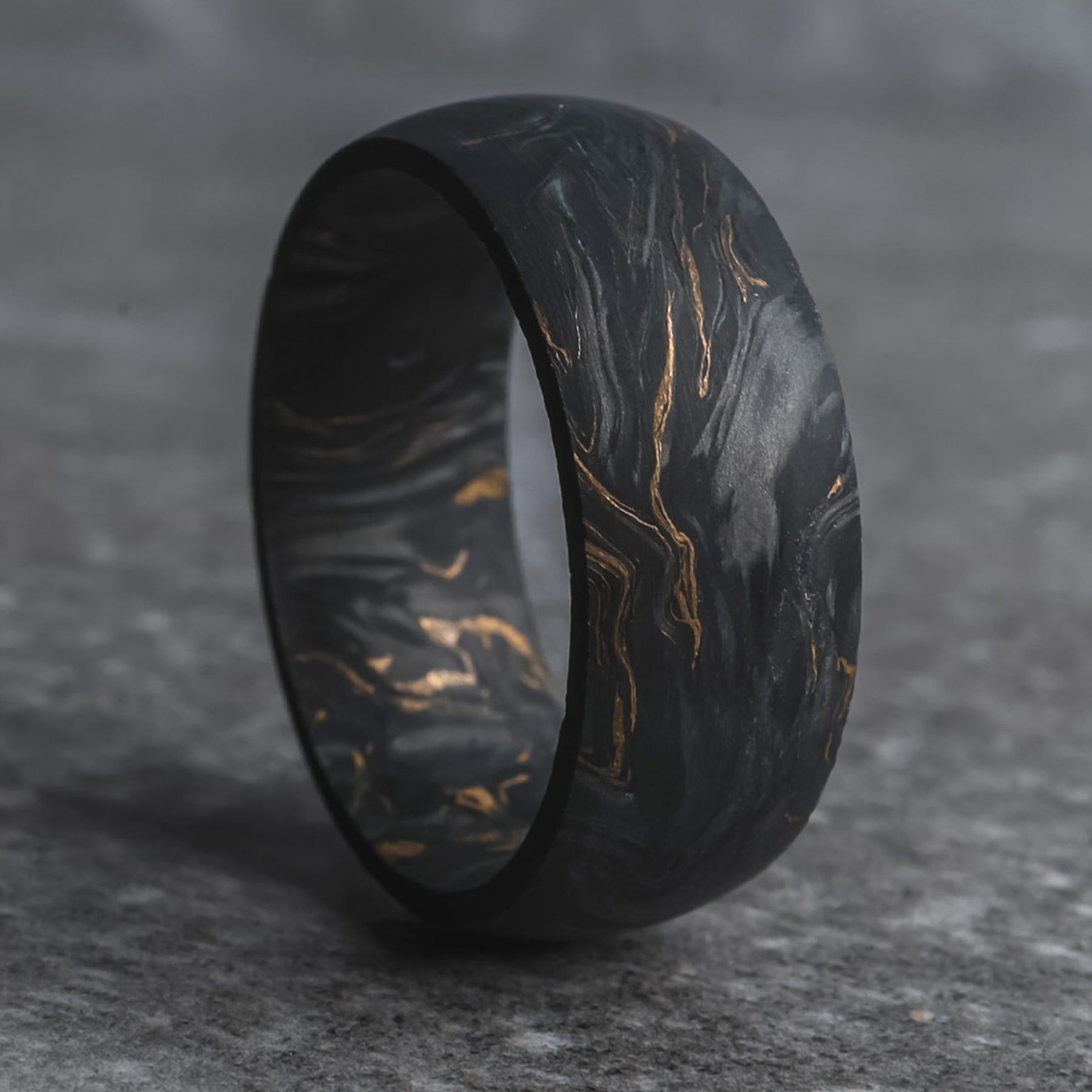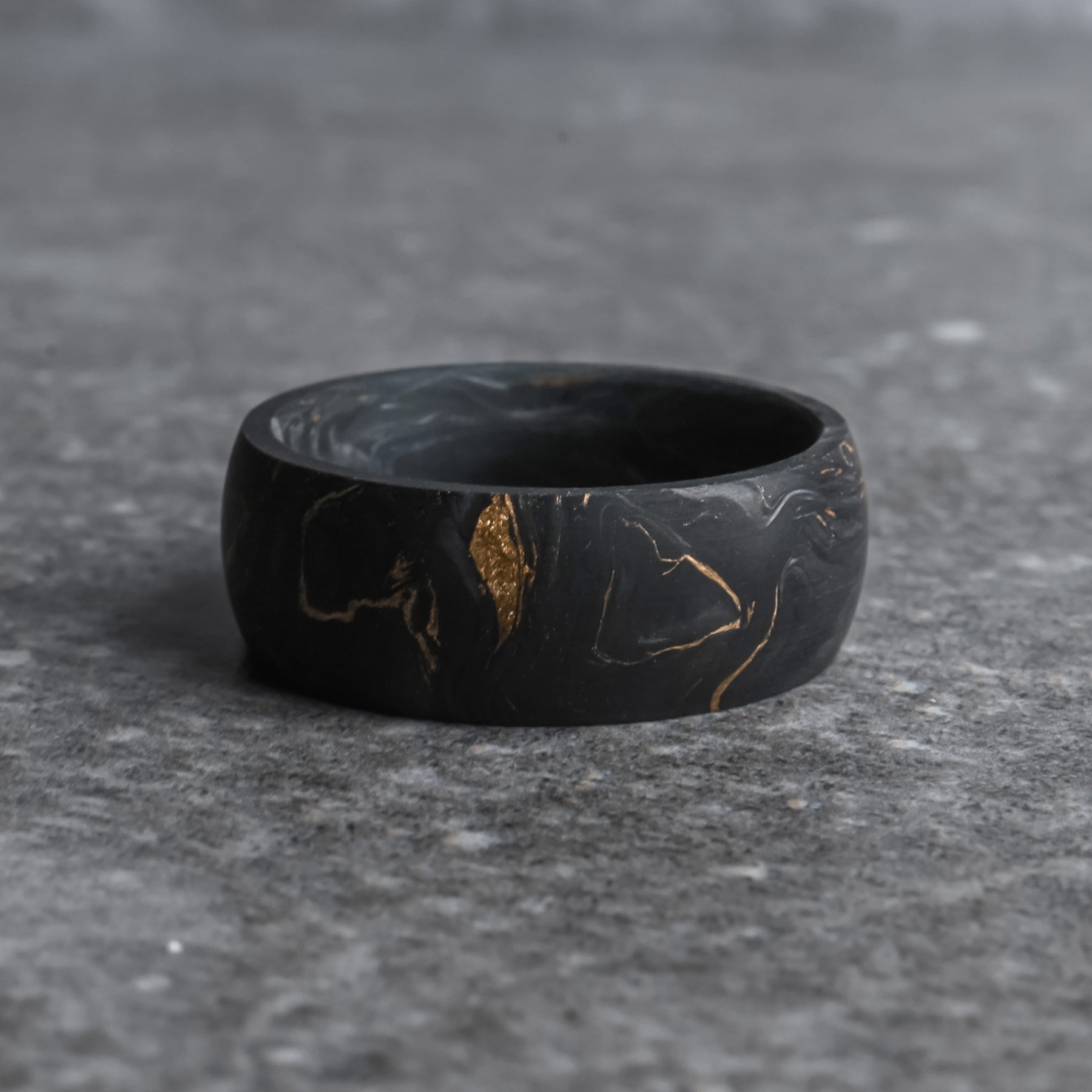 The Grand Prix is a forged black carbon fiber wedding ring crafted with formula-one grade 24,000 carbon fiber tow - pressurized with gold leaf flake, giving it a signature "marbled" aesthetic.