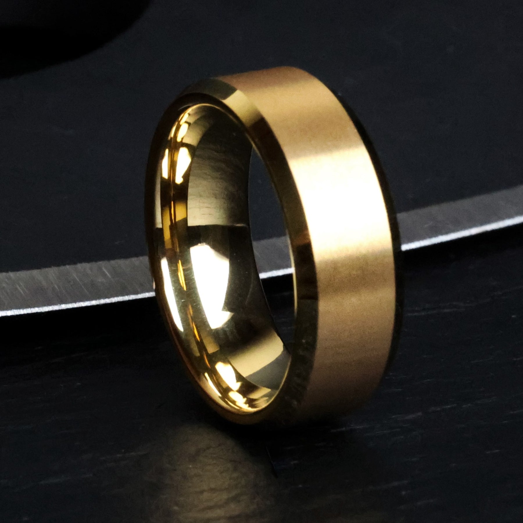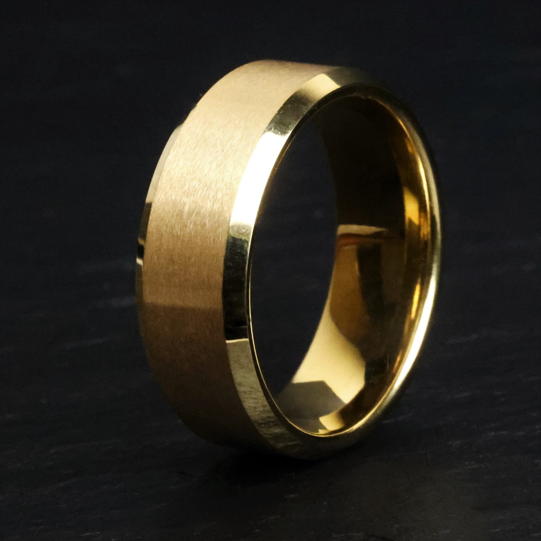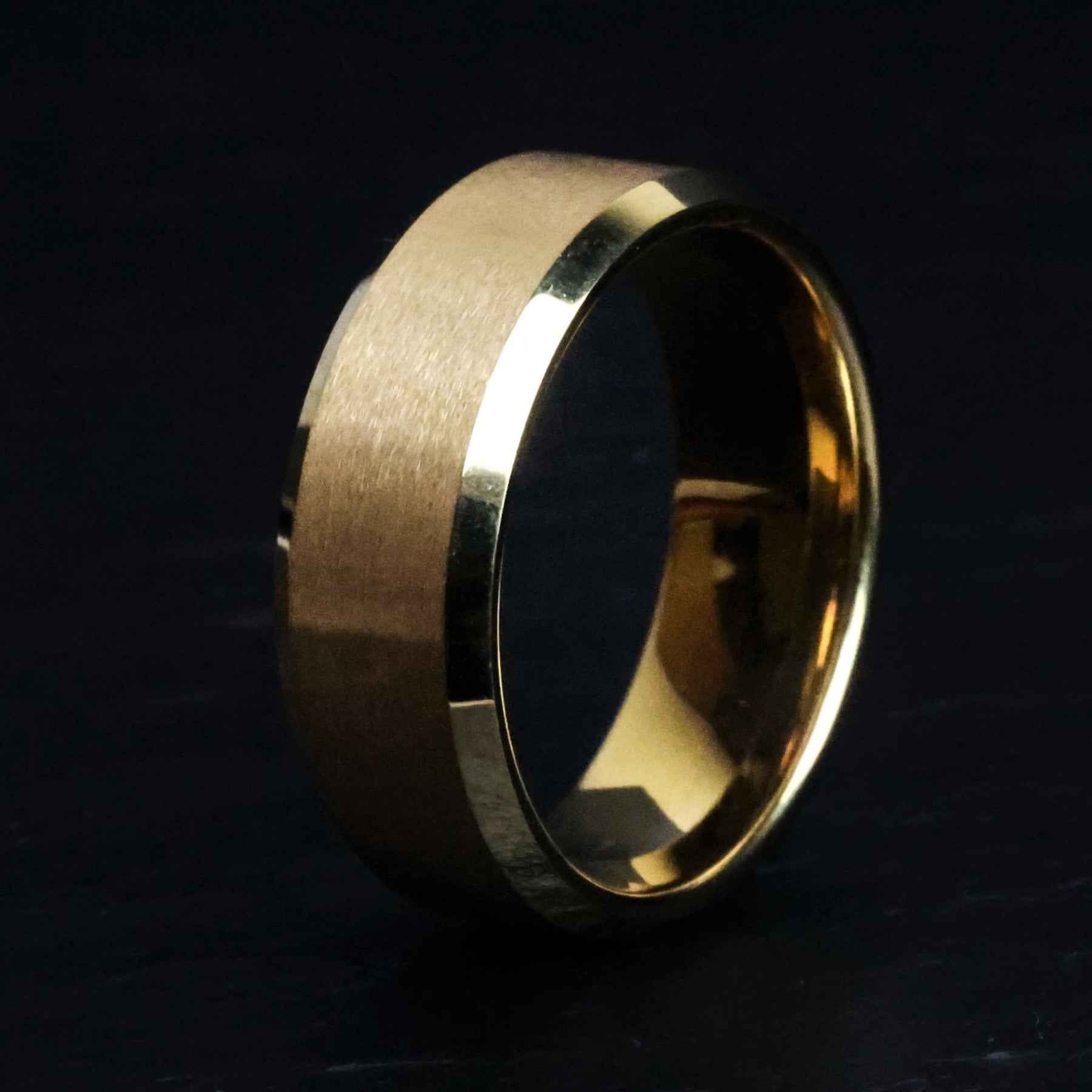 Be Midas and turn your world to gold. This is a traditional style with a modern take. Tungsten carbide is the paragon of modern metalworking. It's stronger than Titanium, and as heavy as gold.
