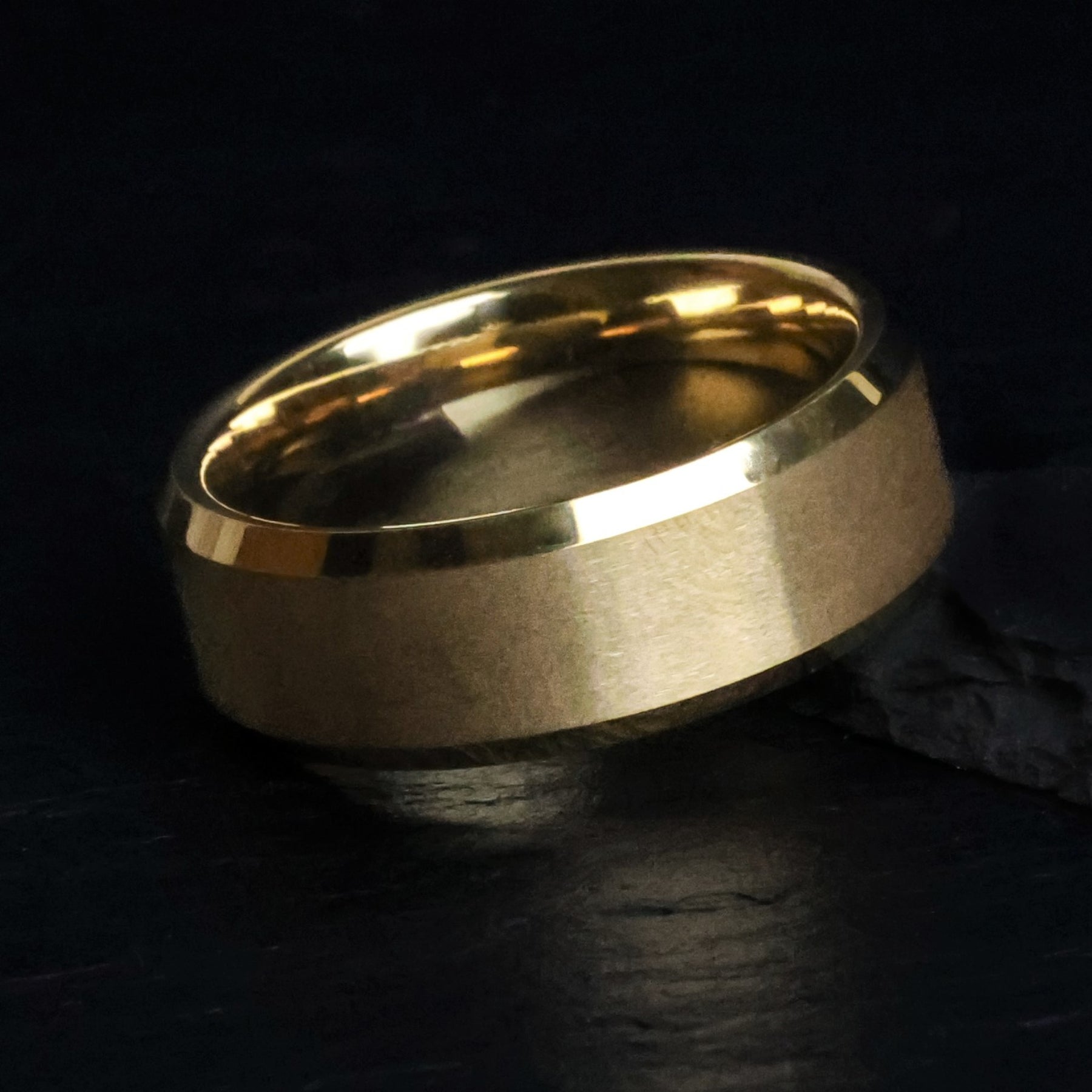 With flat chamfered edges, the Midas is the perfect wedding band for a modern traditionalist man. This tungsten carbide is PVD coated with a 14k yellow gold tone.