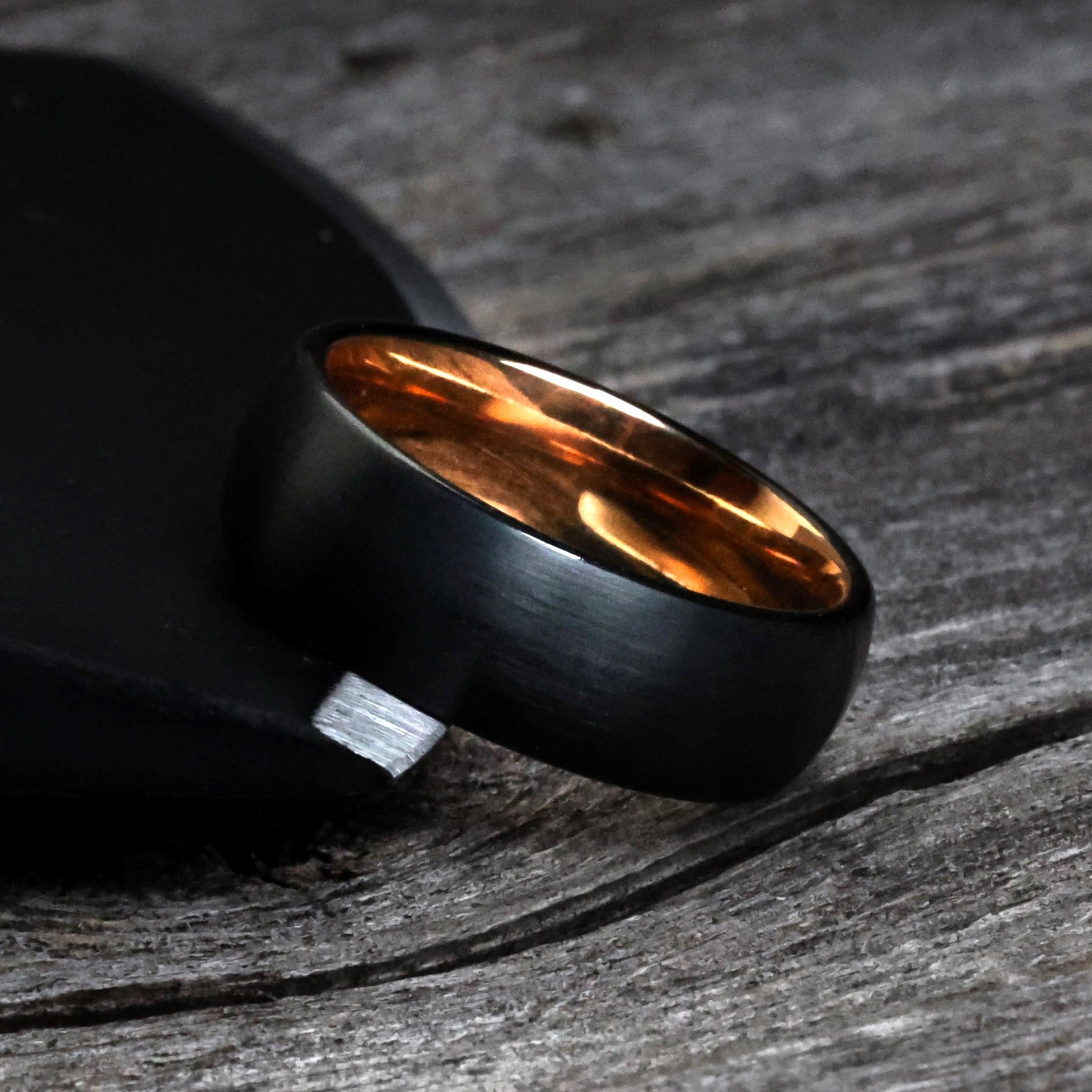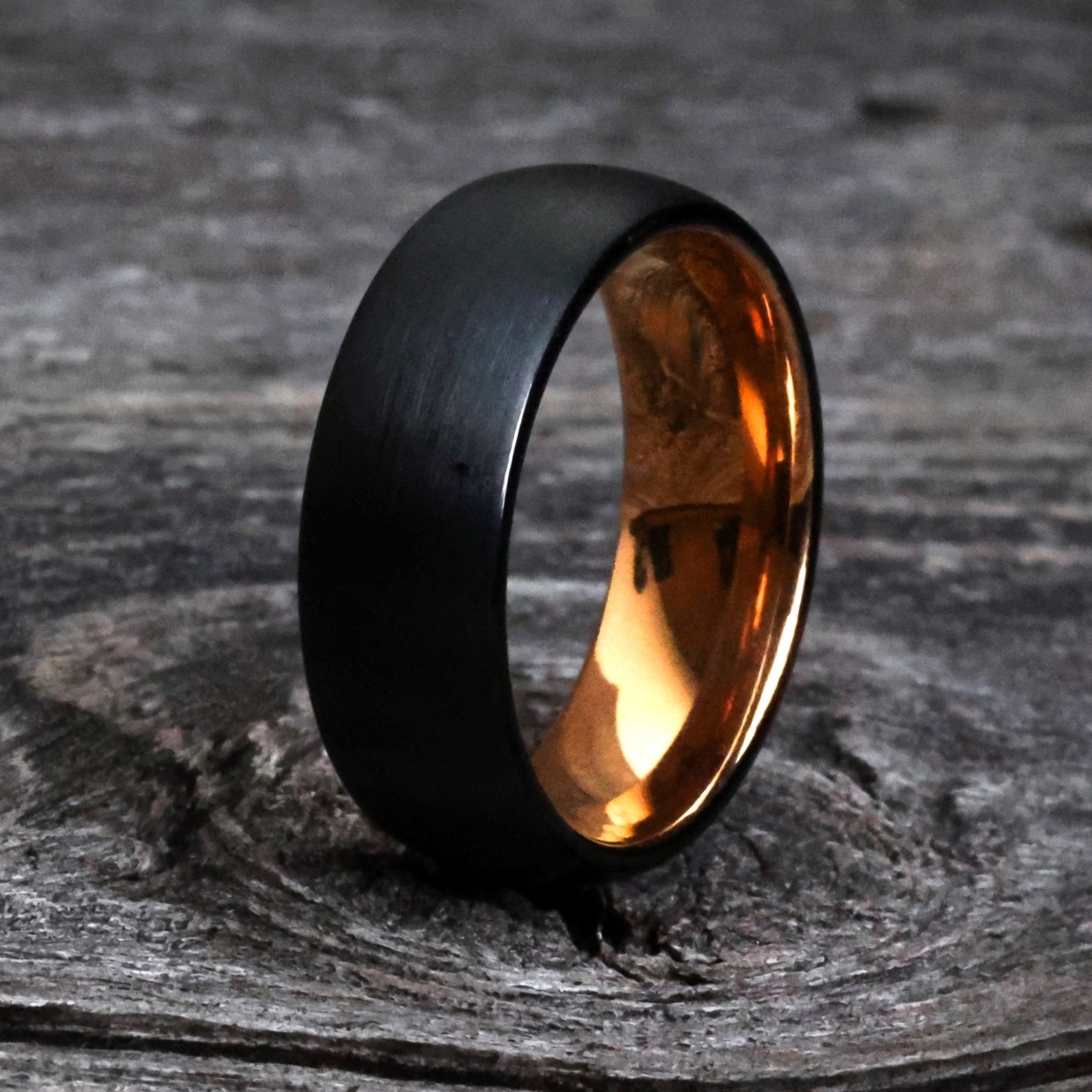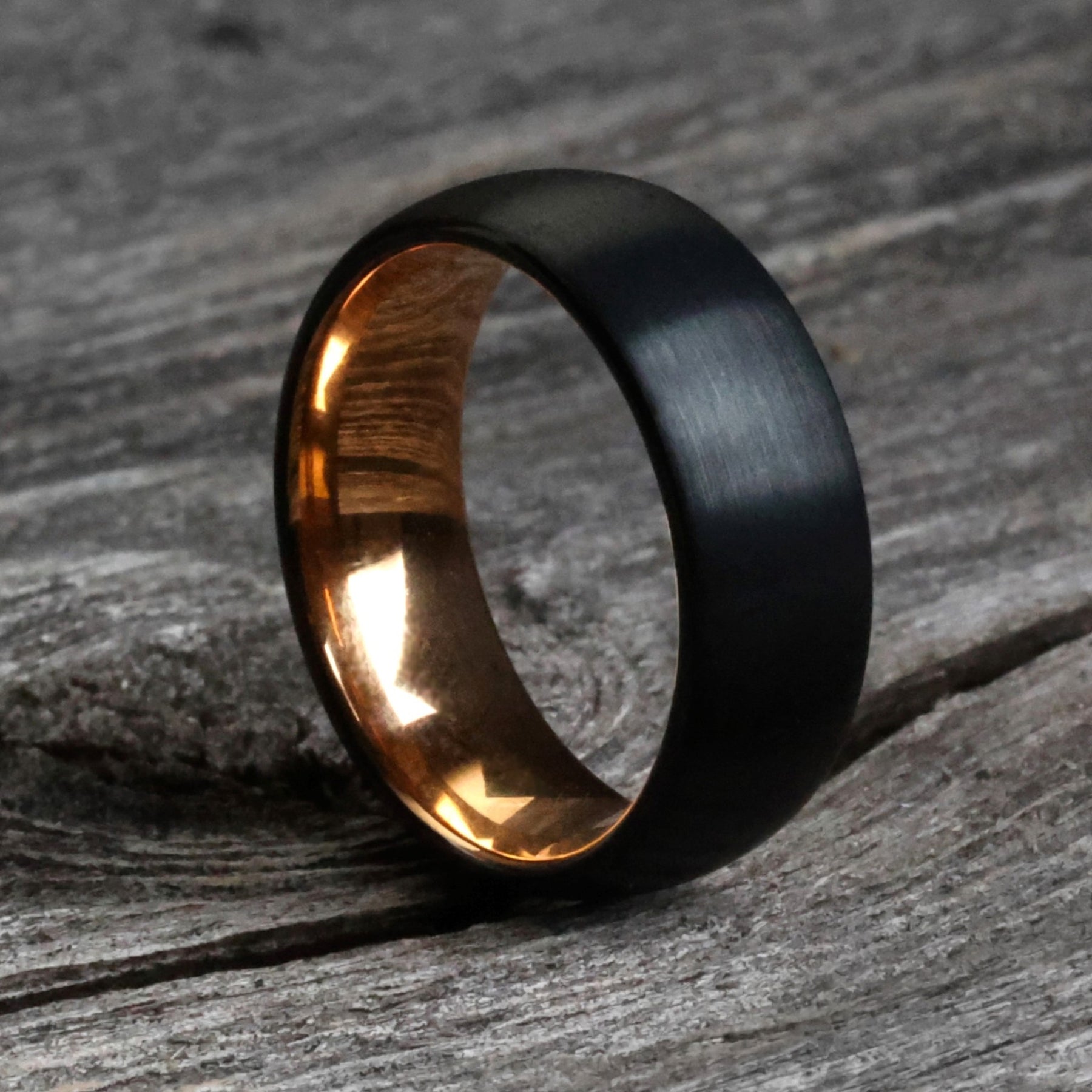 The Stark offers a minimalist approach to a modern wedding band. Forged from Tungsten Carbide, the hardest metal on earth, it's outfitted with a brushed black exterior and polished rose gold interior.