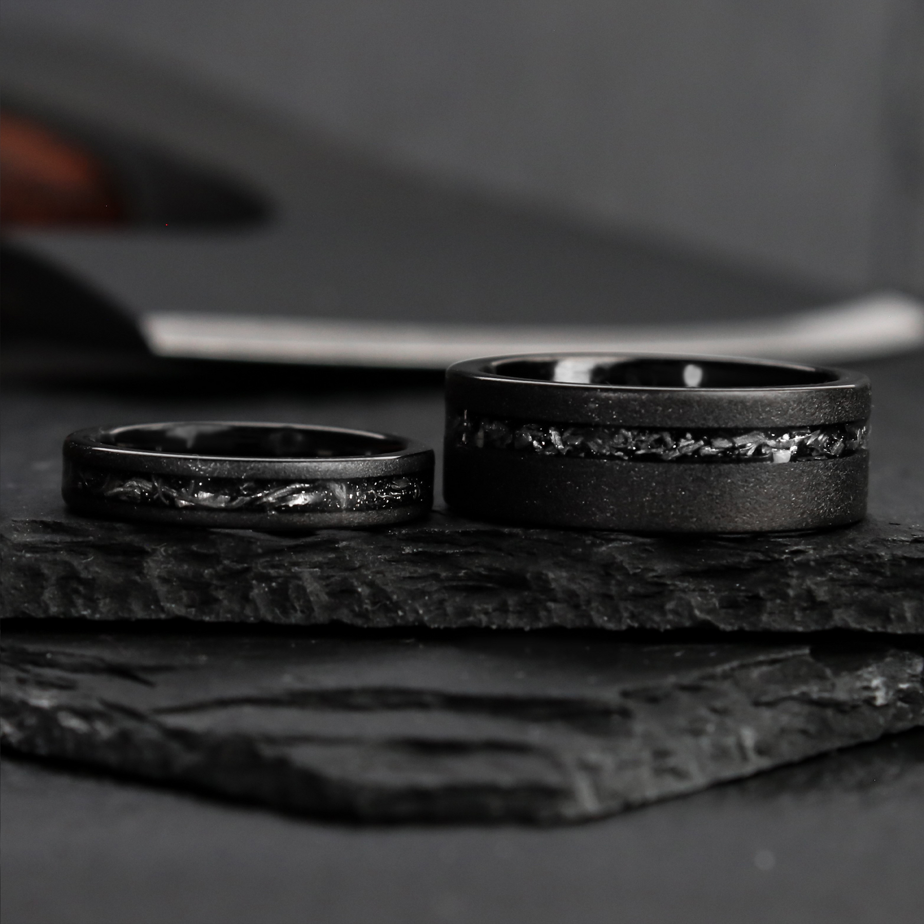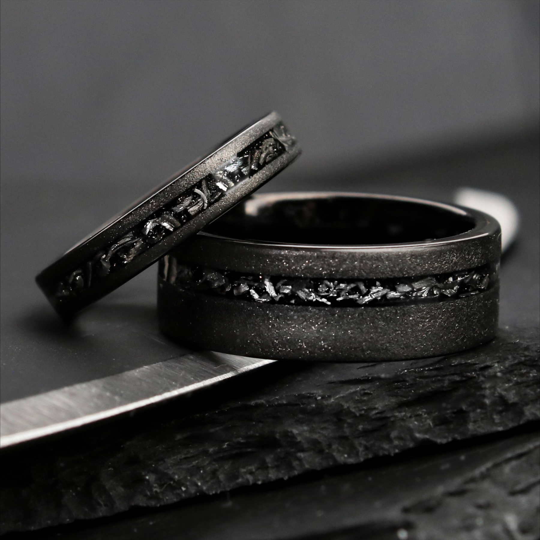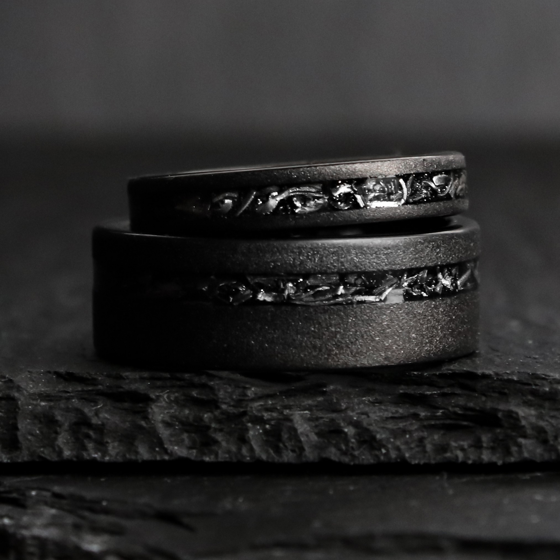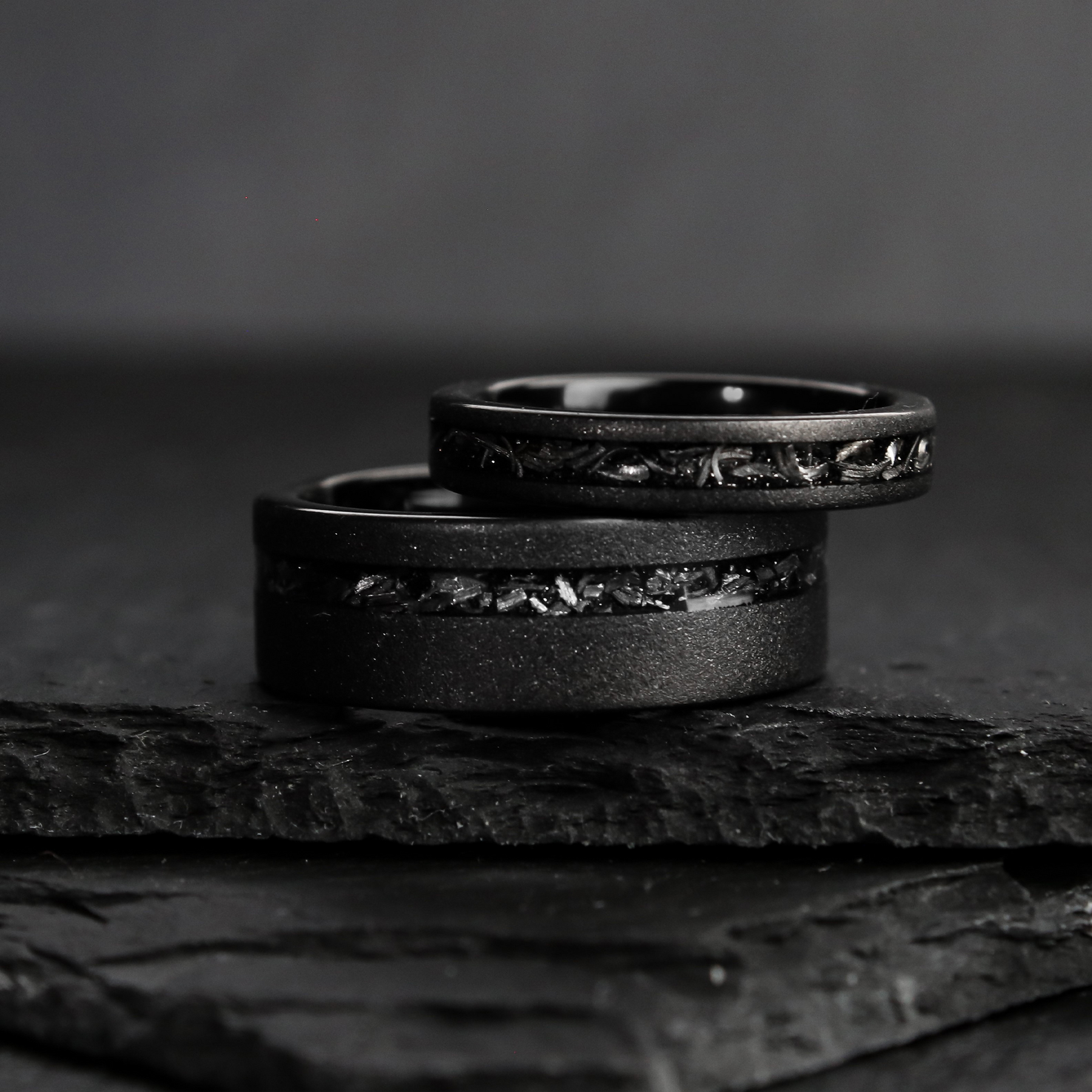 These wedding bands feature a sandblasted black core with genuine meteorite inlays. We exclusively use authentic meteorite in every ring. The Iron filings are milled out of a large block of Gibeon meteorite, and then set for the inlay. It creates an entirely unique aesthetic.