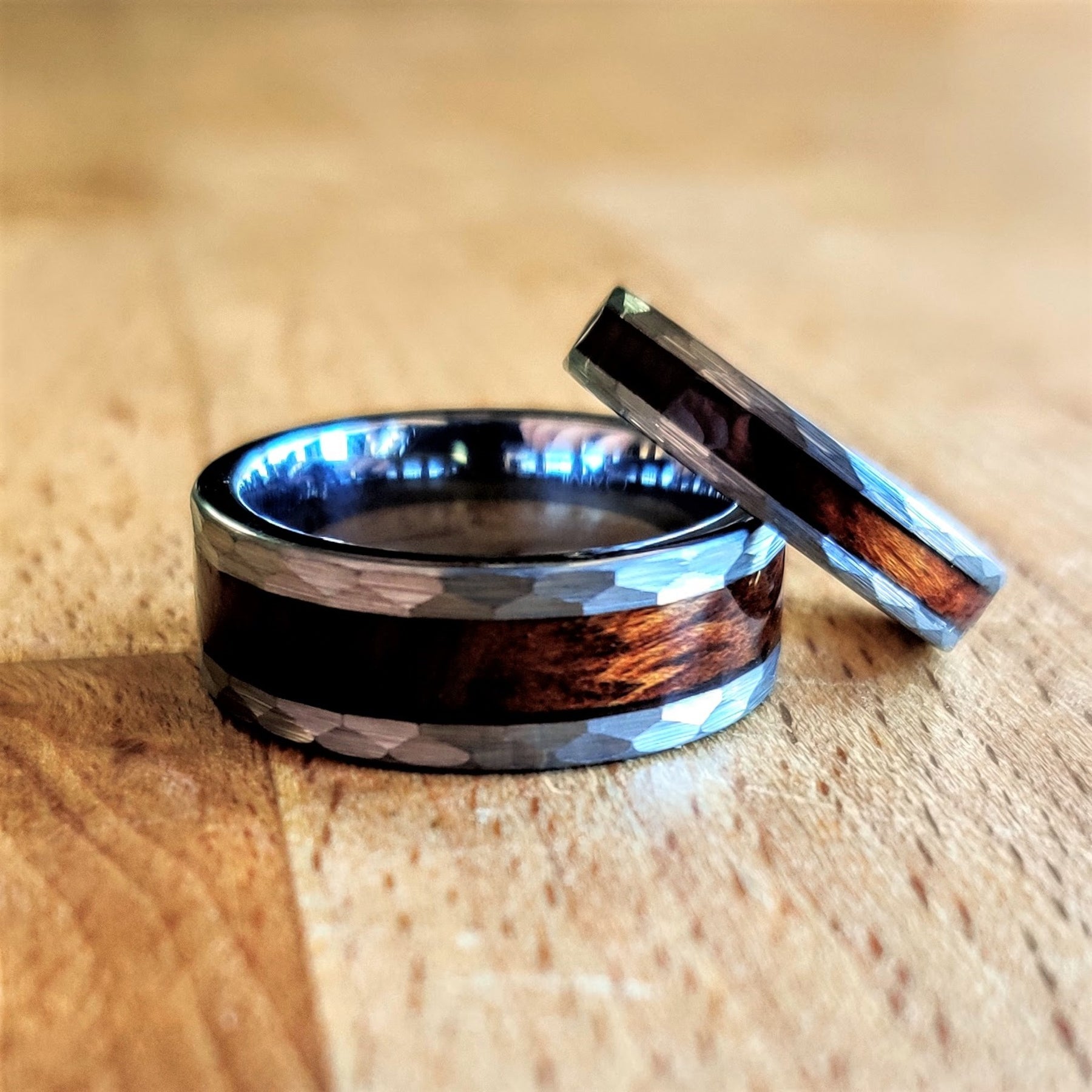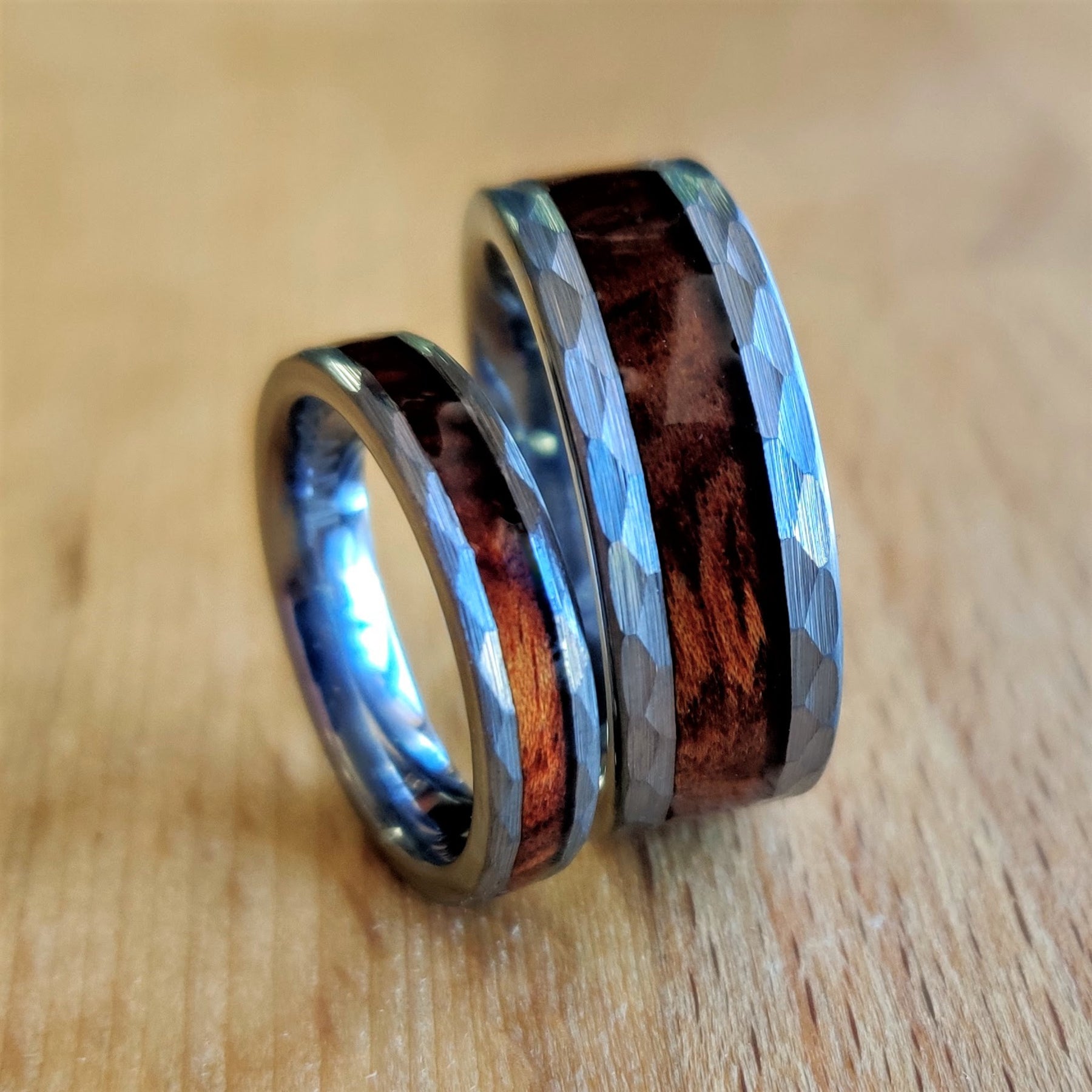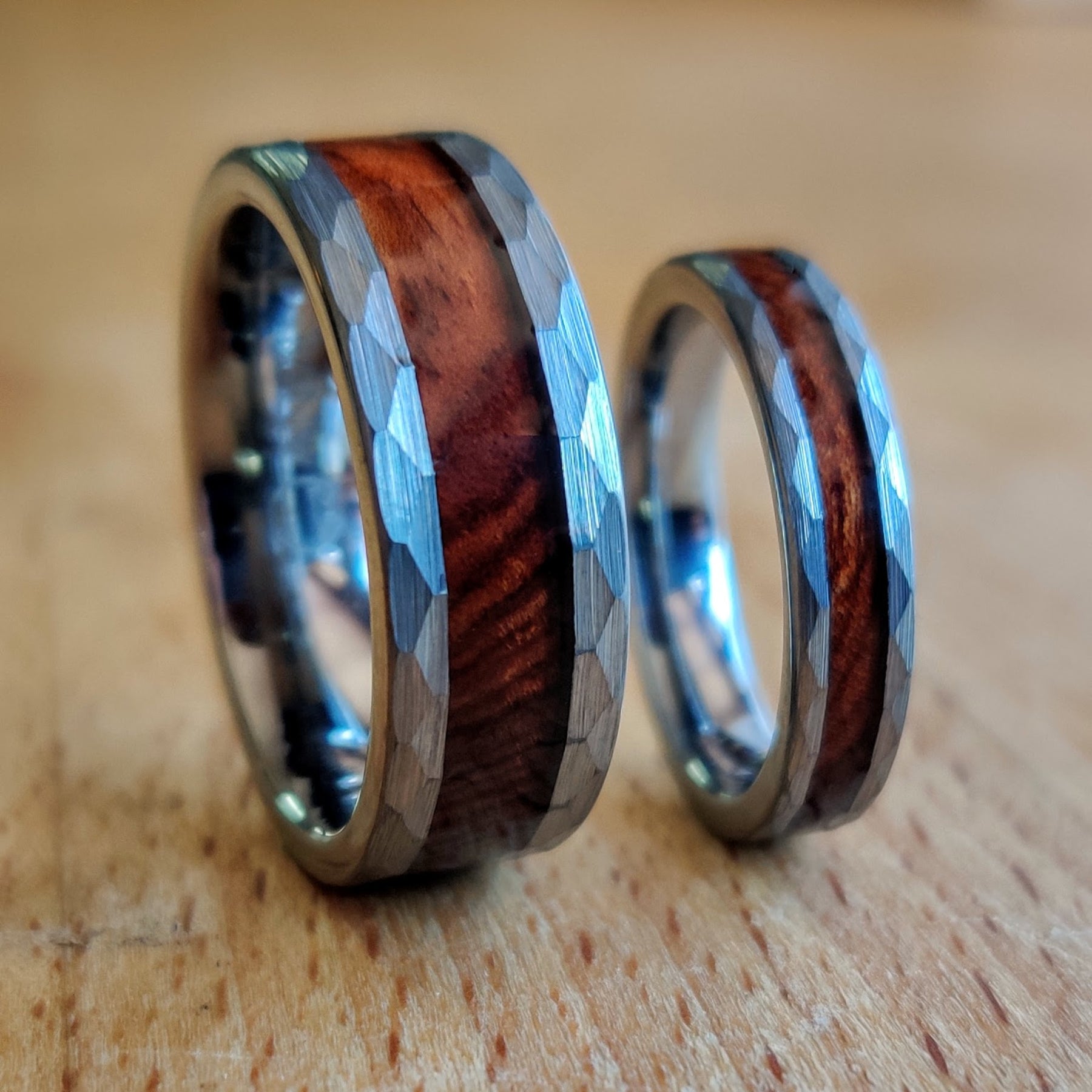 Each piece, like each wearer, is unique. This design features a hammered/faceted exterior for a modern and rustic aesthetic. The timber in your rings will be bookmatched to have matching grain patterns, that grew together from the same tree.