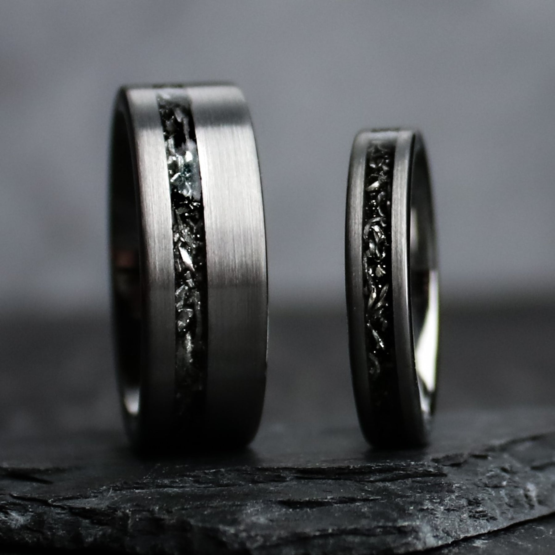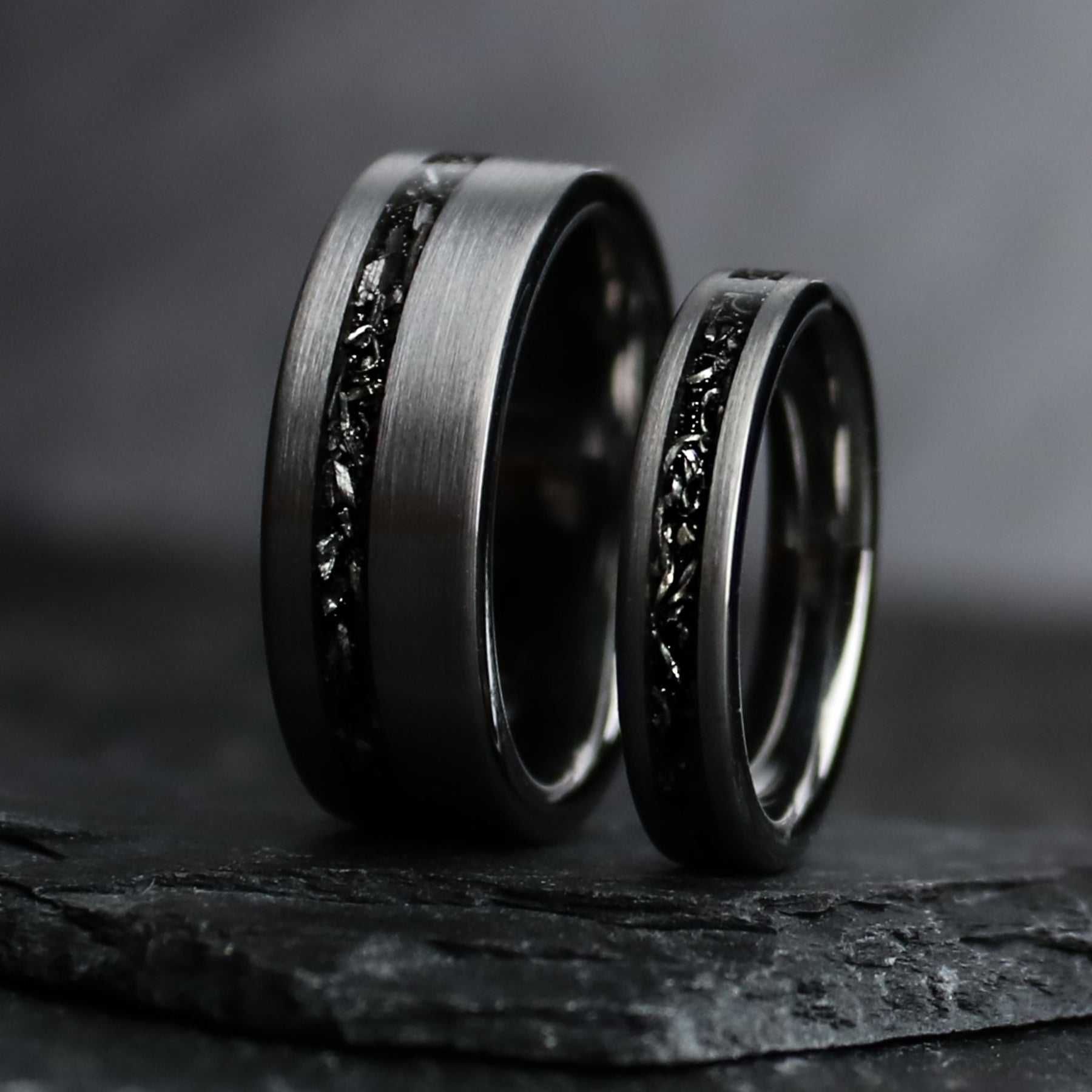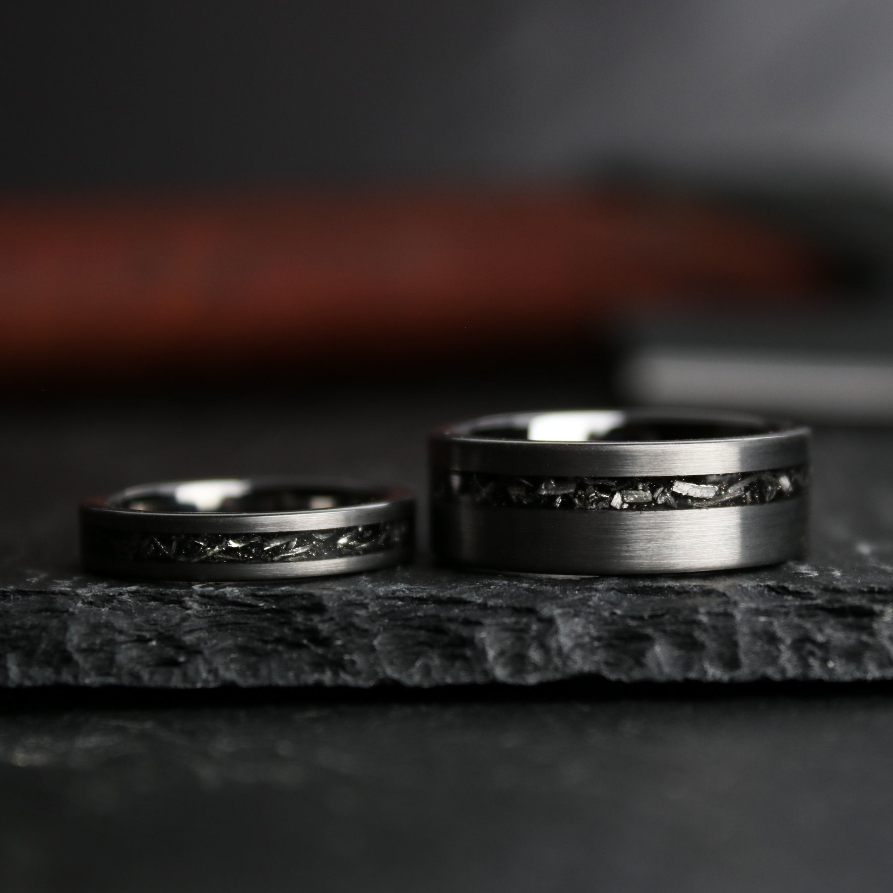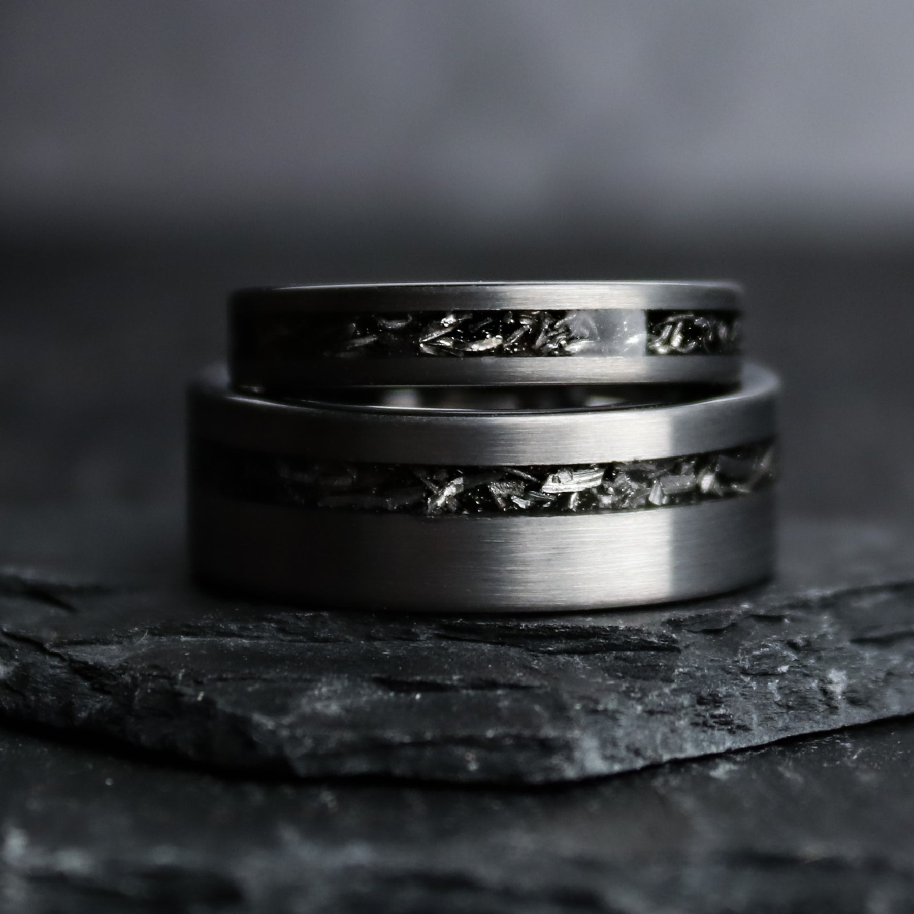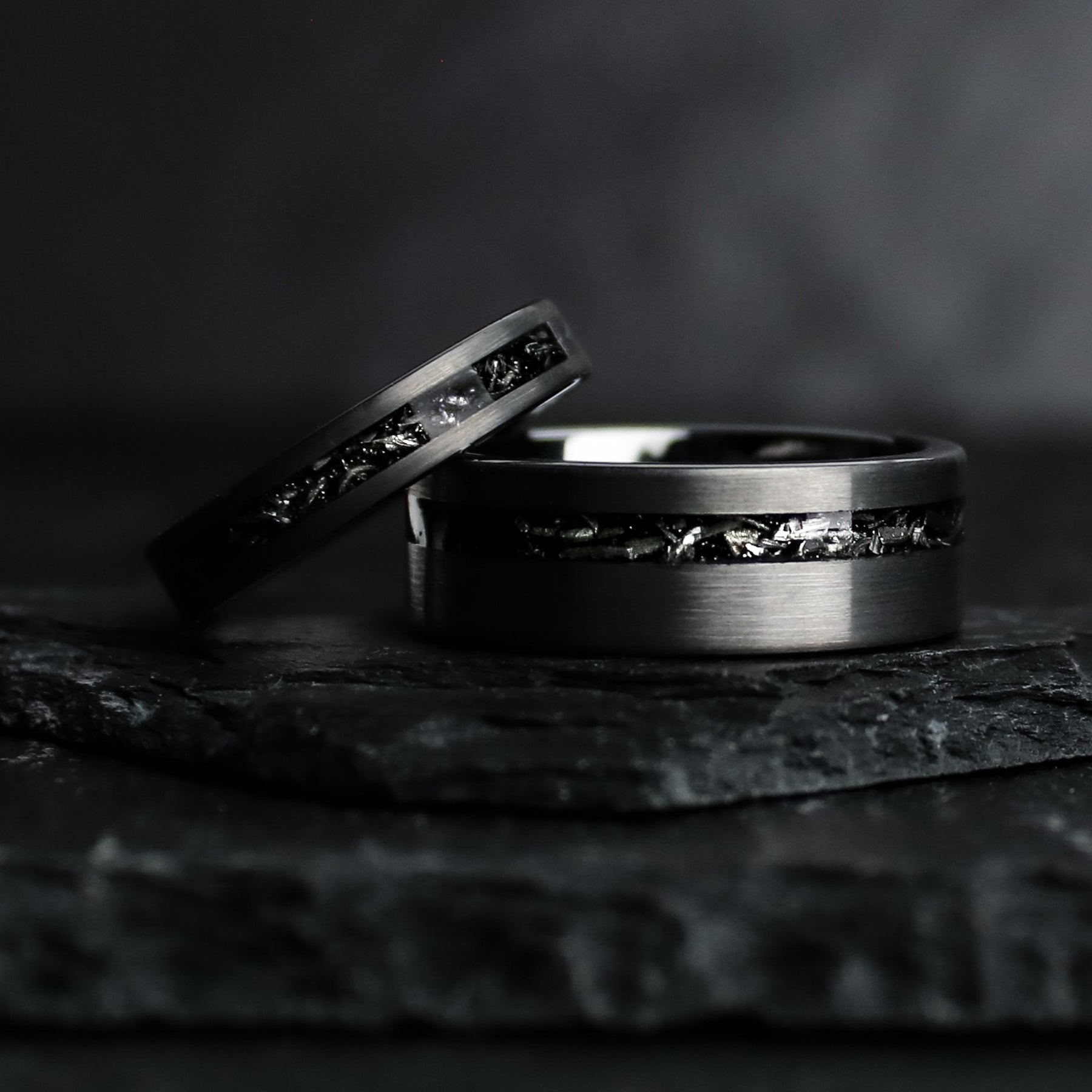 These wedding bands feature a centered and offset Gibeon meteorite inlay, and is forged out of Tungsten Carbide. We exclusively use authentic meteorite in every ring. The Iron filings are milled out of a large block of Gibeon meteorite, and then set for the inlay. It creates an entirely unique aesthetic. Brushed Tungsten Carbide gives a powerful modern aesthetic to the ring design.