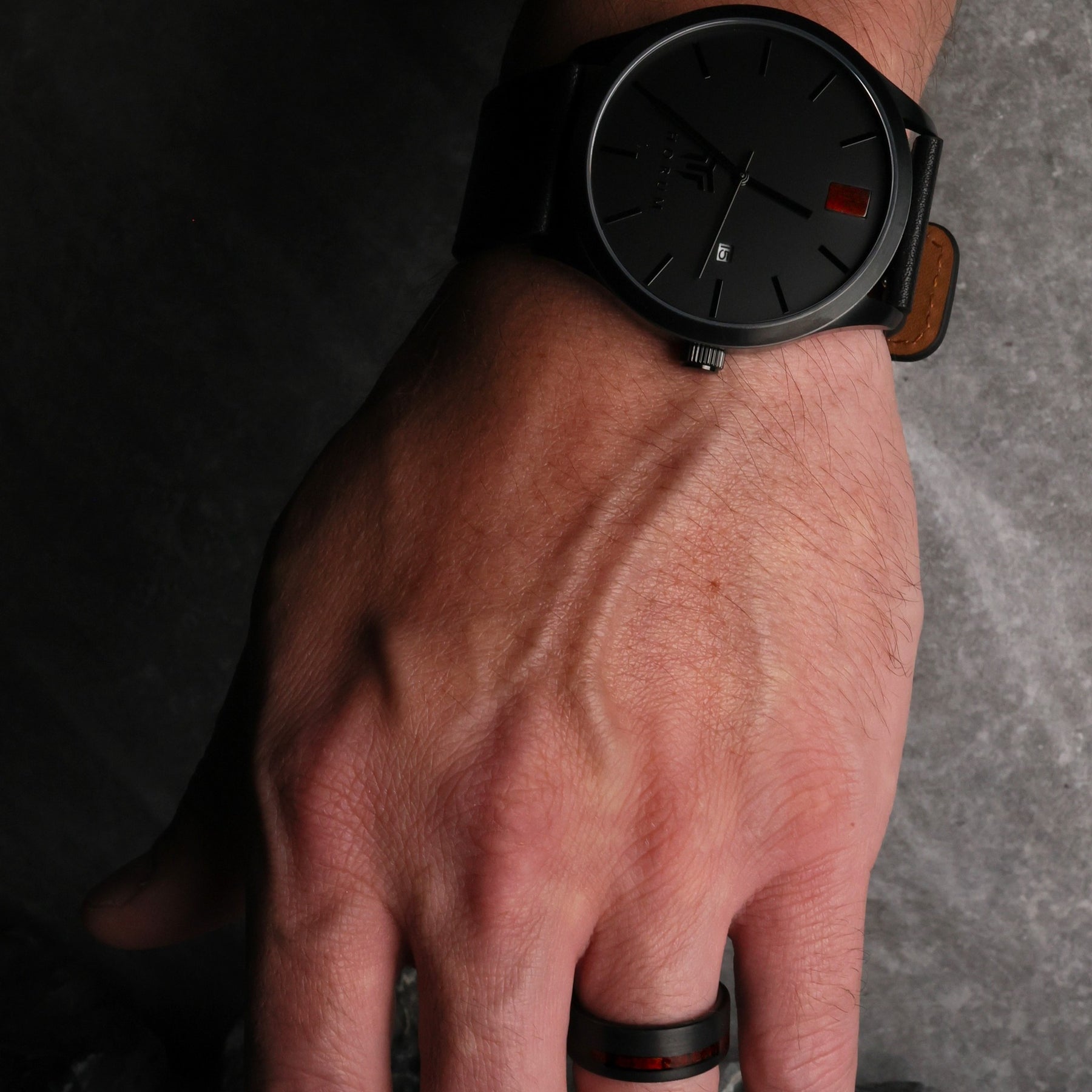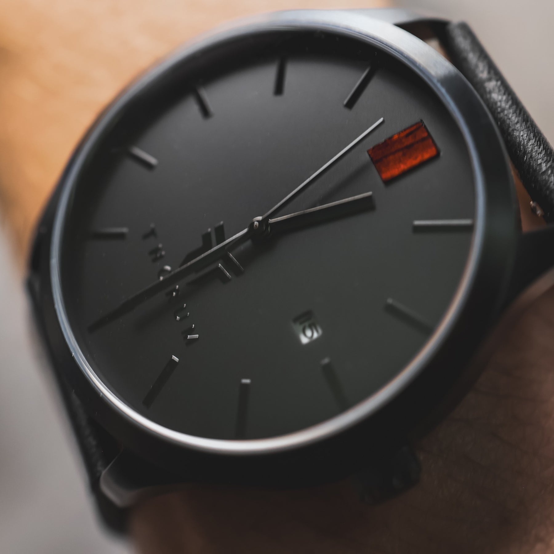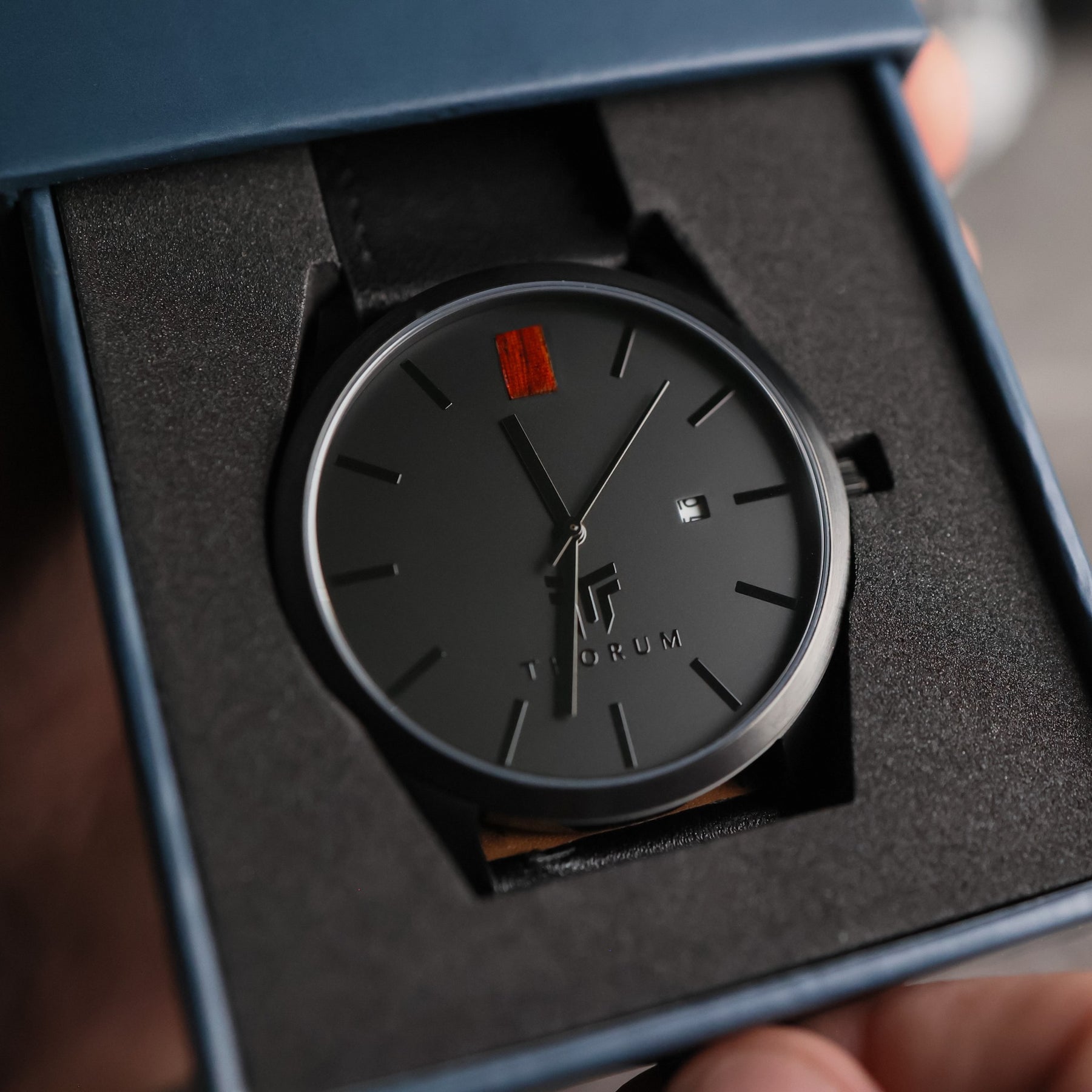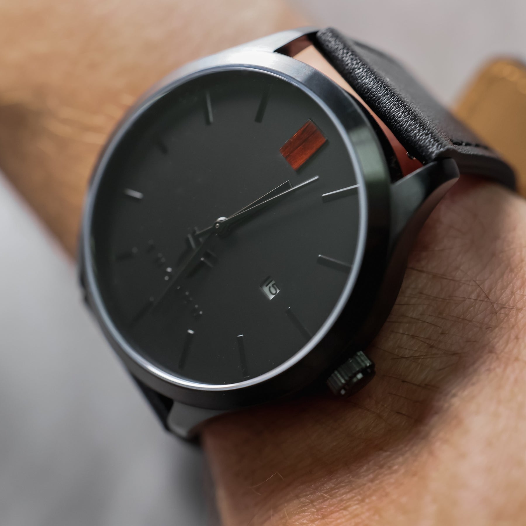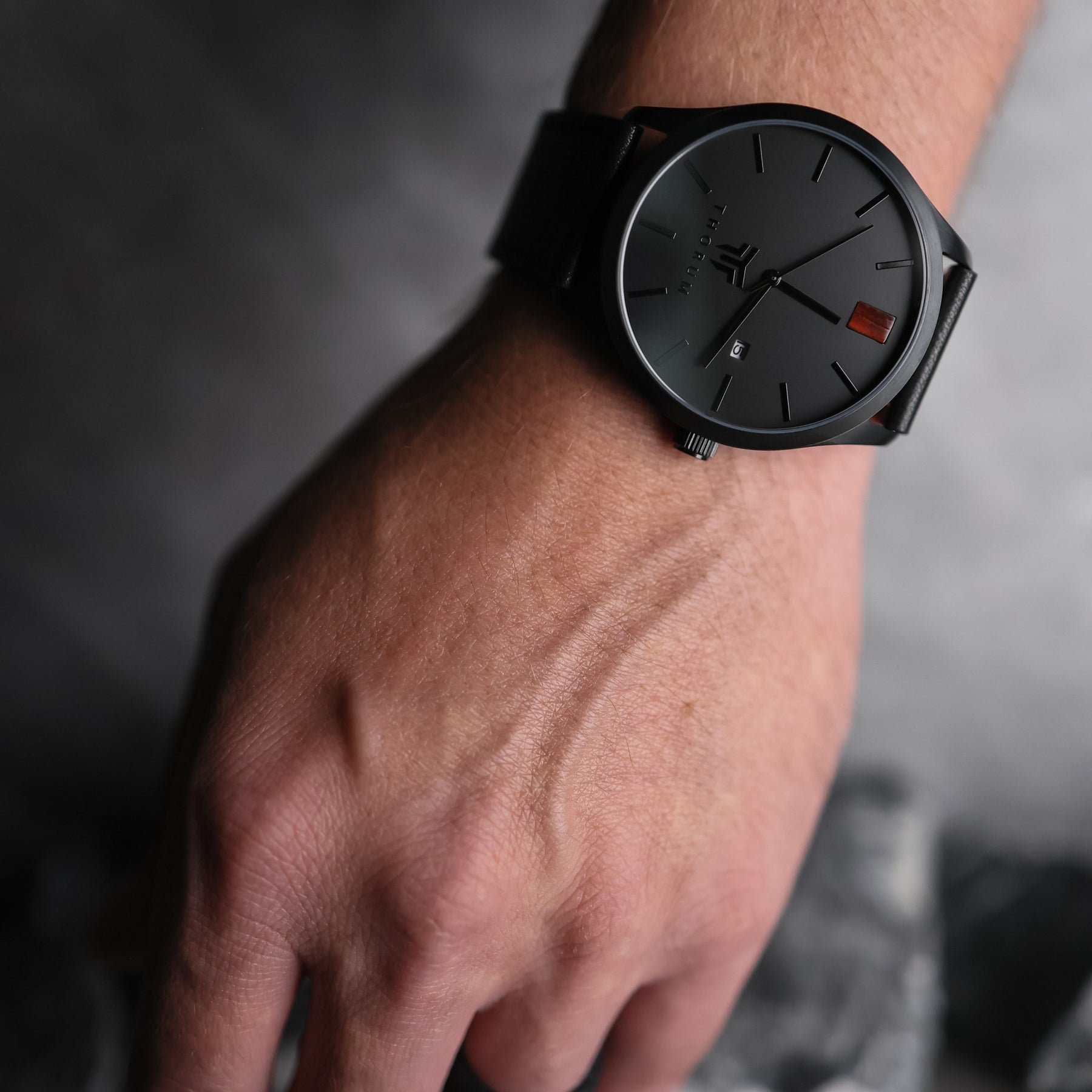 A minimalist design, featuring a black on black on black case; The Redwood Watch sports a new, upgraded Japanese Quartz movement.