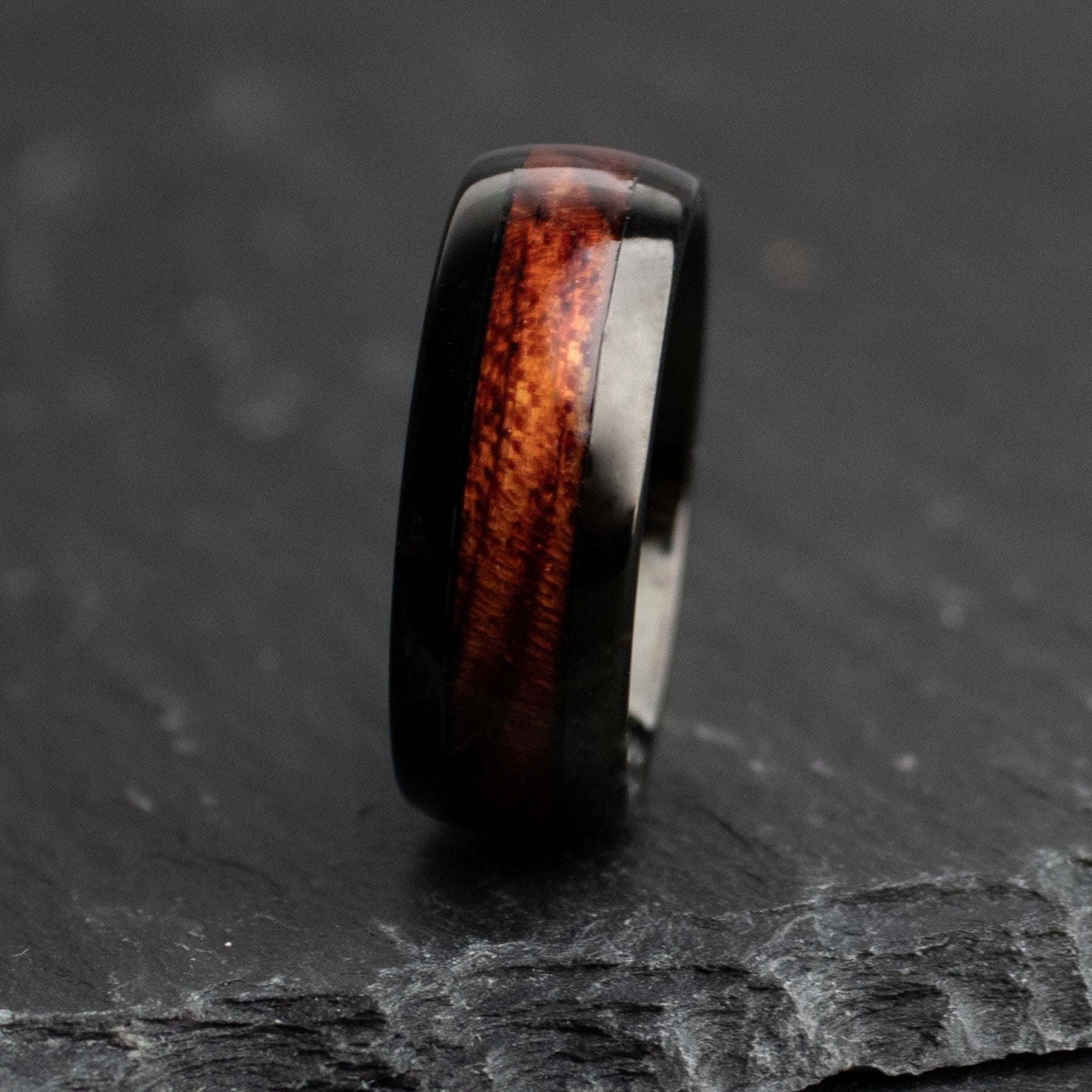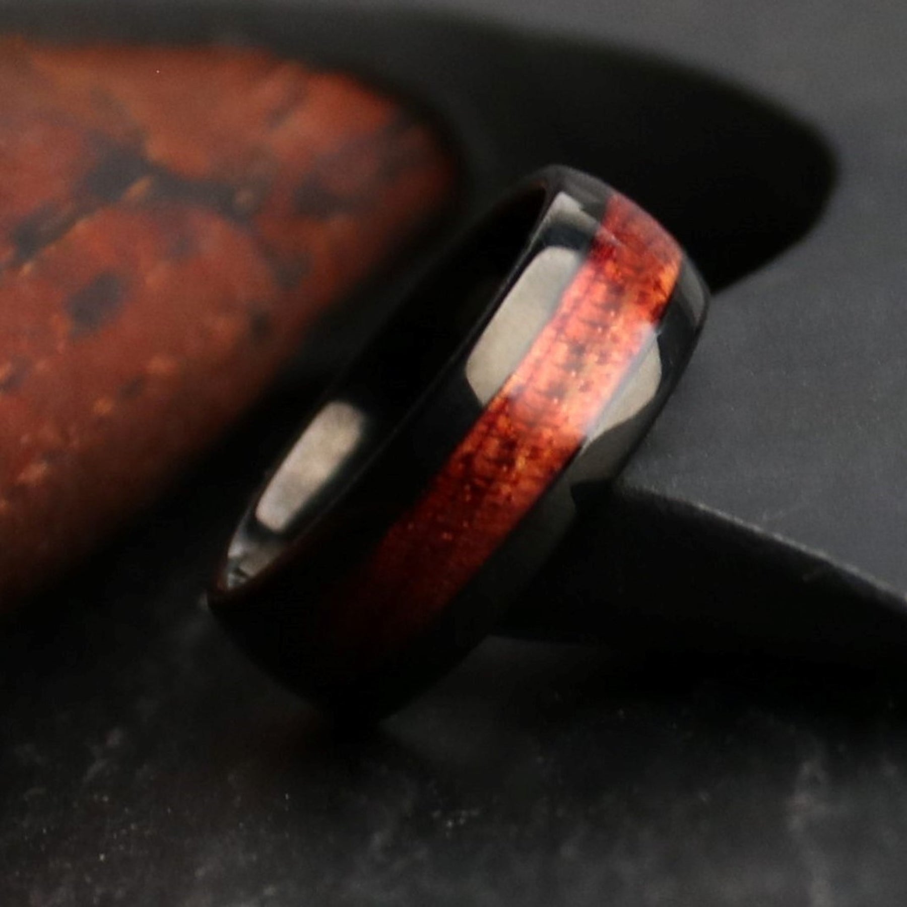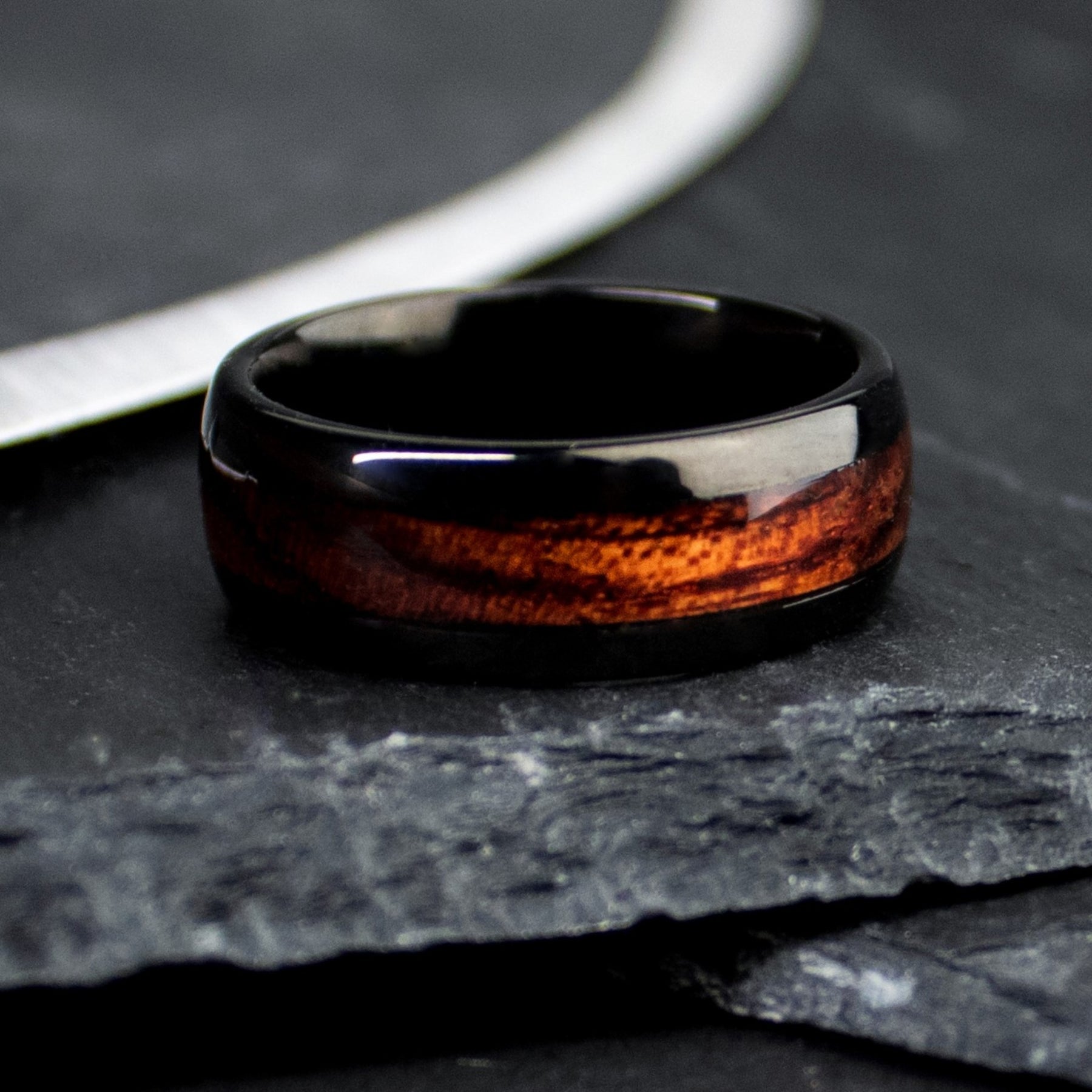 Ironwood has a gorgeous grain pattern than runs from deep crimson sapwood, to bright red heartwood. This wedding band features a beveled black tungsten carbide interior, with a wide desert Ironwood inlay.