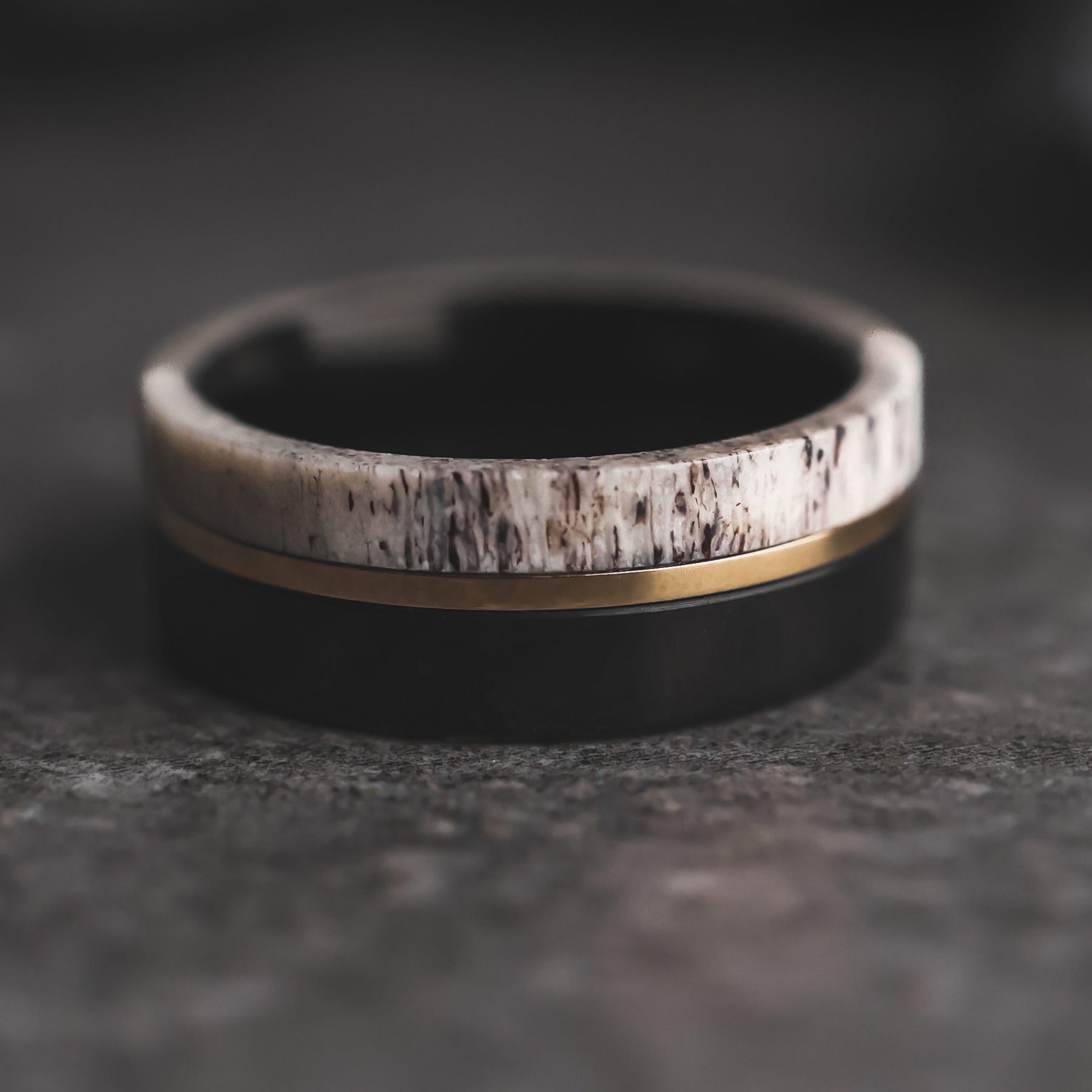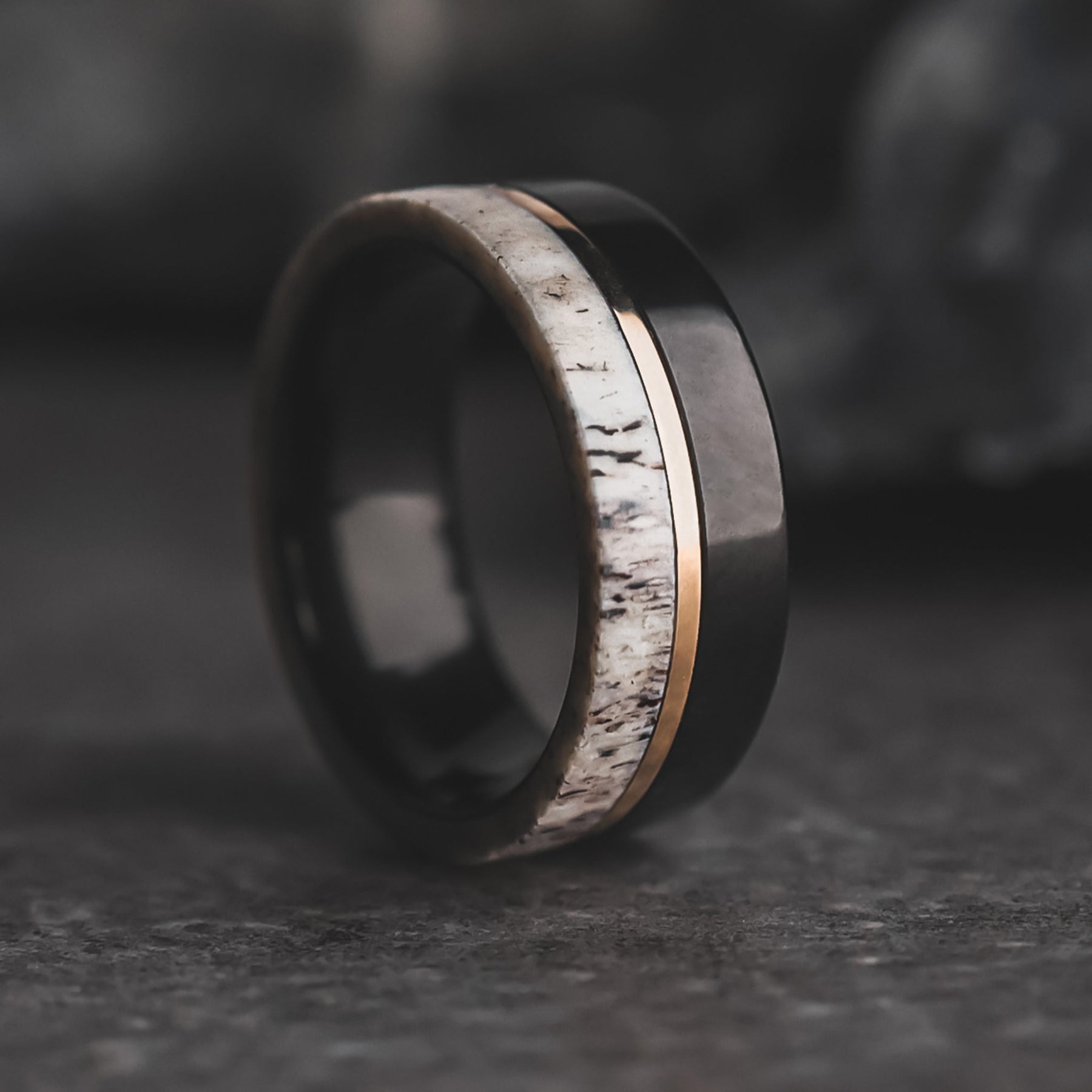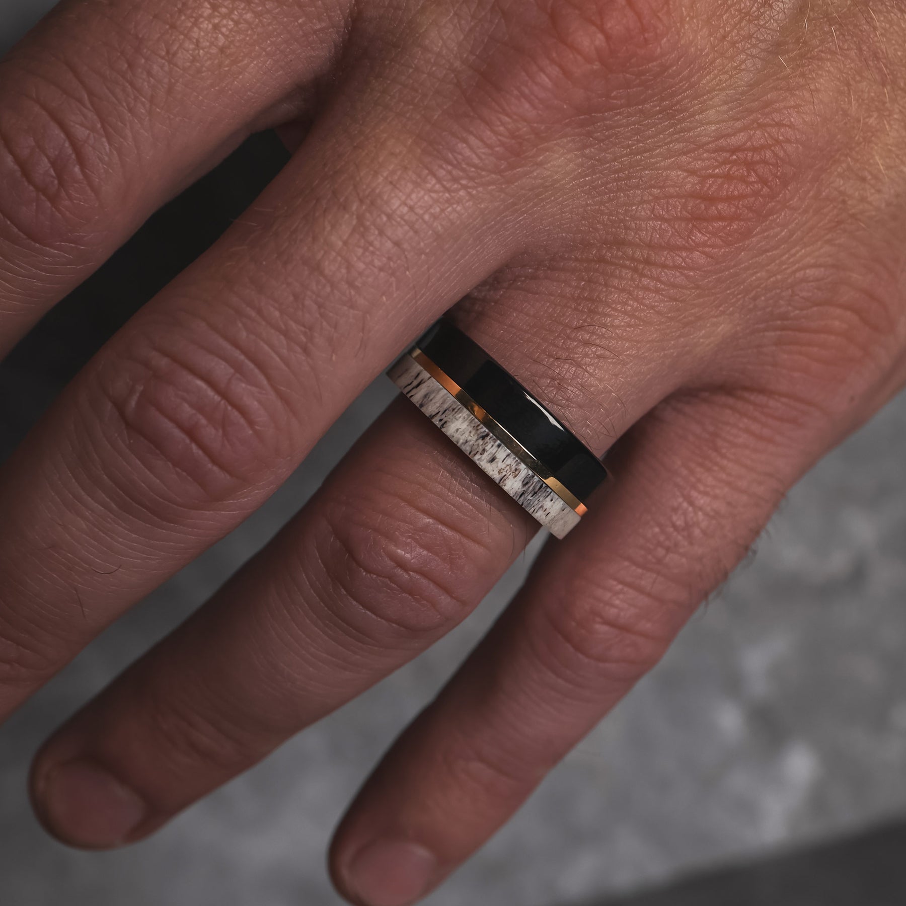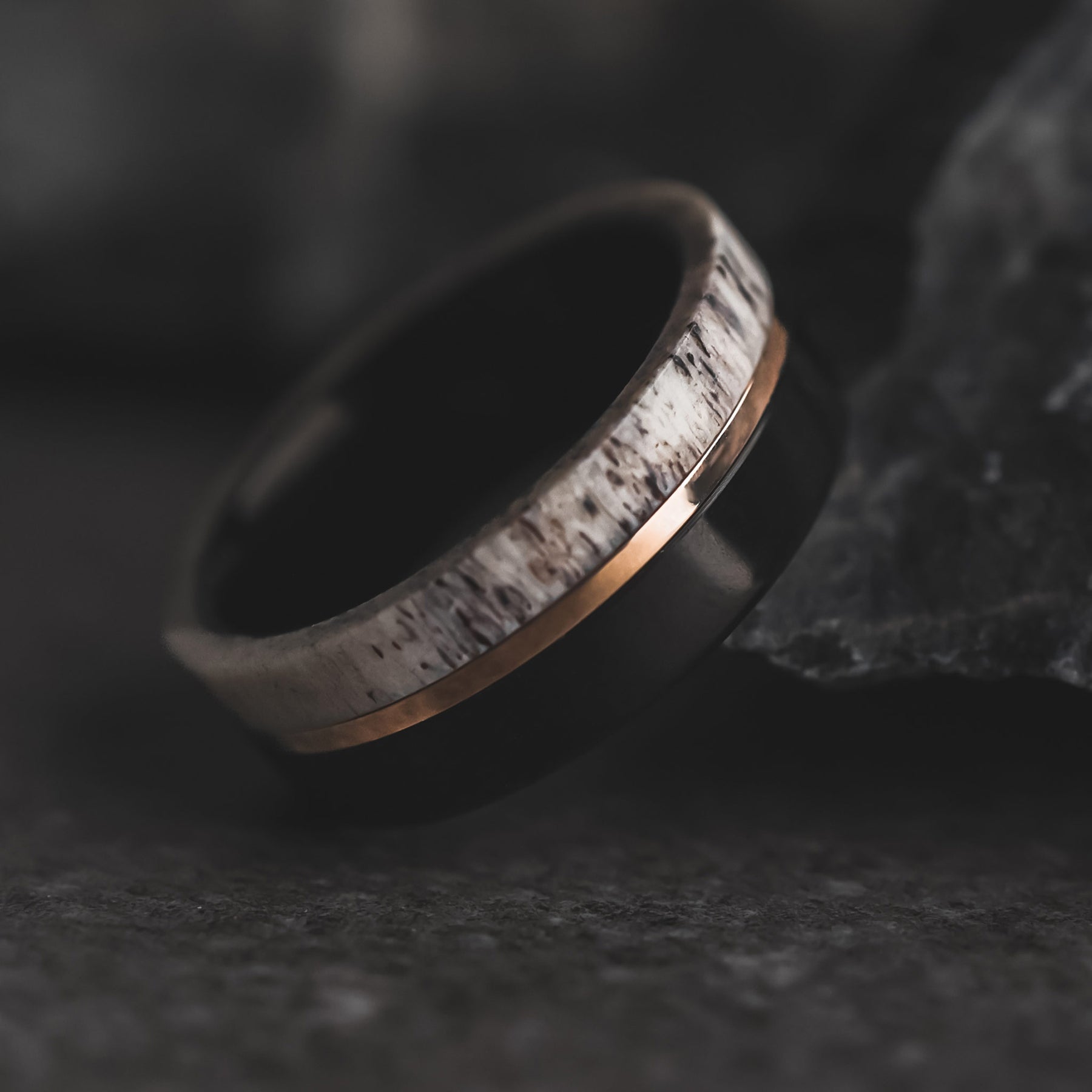 The Blacktail 8mm men's wedding ring features a polished black Tungsten Carbide ring with an offset 14k rose gold aesthetic inlay, finished off with a Whitetail Deer Antler exterior. Each piece of deer antler will differ, as it does in nature.
